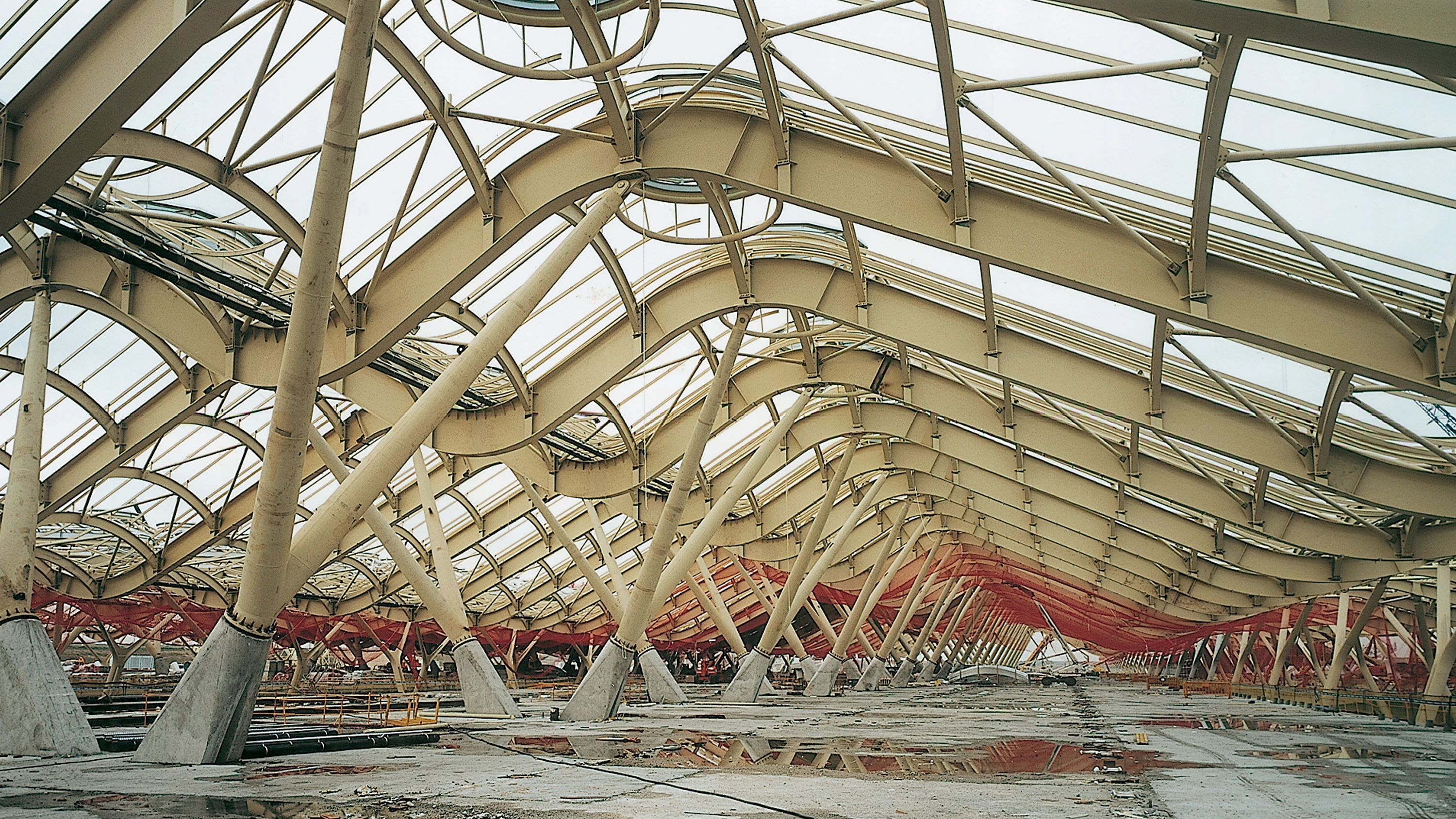 Tanto desde el punto de vista formal como desde el constructivo, la cubierta resume la arquitectura de la terminal: las vigas en ala configuran un módulo de 72 x 9 metros, repetido hasta alcanzar los 1.160 metros de longitud total; cada uno está soportado por un par de pilares centrales en V y dos en Y sobre los que apoya el vuelo... [+]