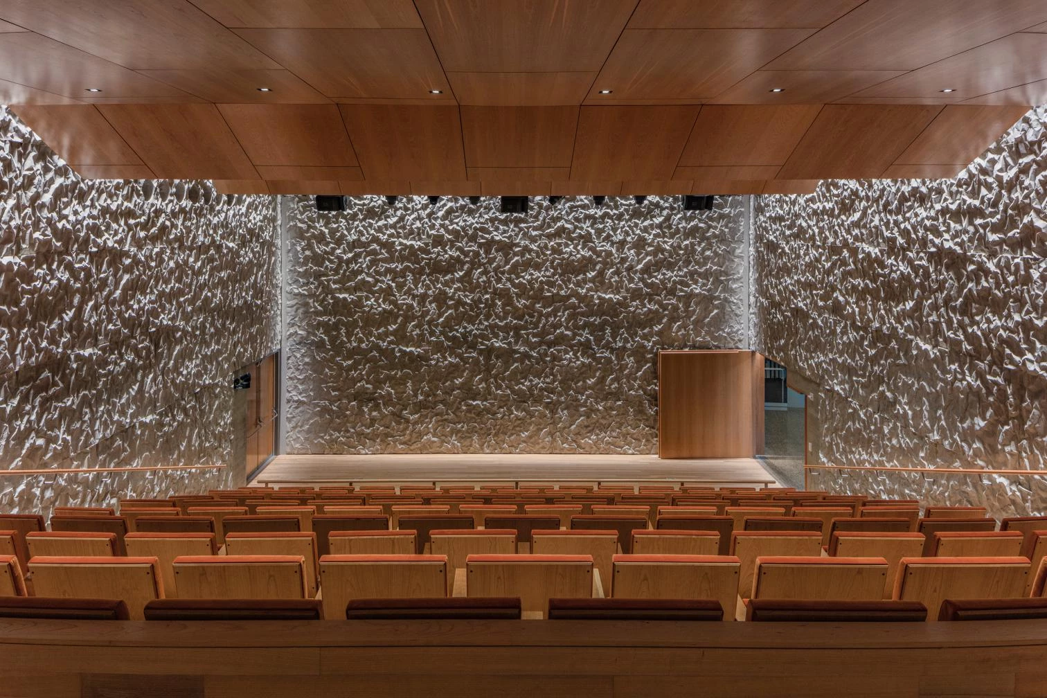 For the luminous performing-arts studios, a newly developed formwork system was applied which gives the structural cast-in-place concrete walls a crinkled texture with excellent acoustic properties.