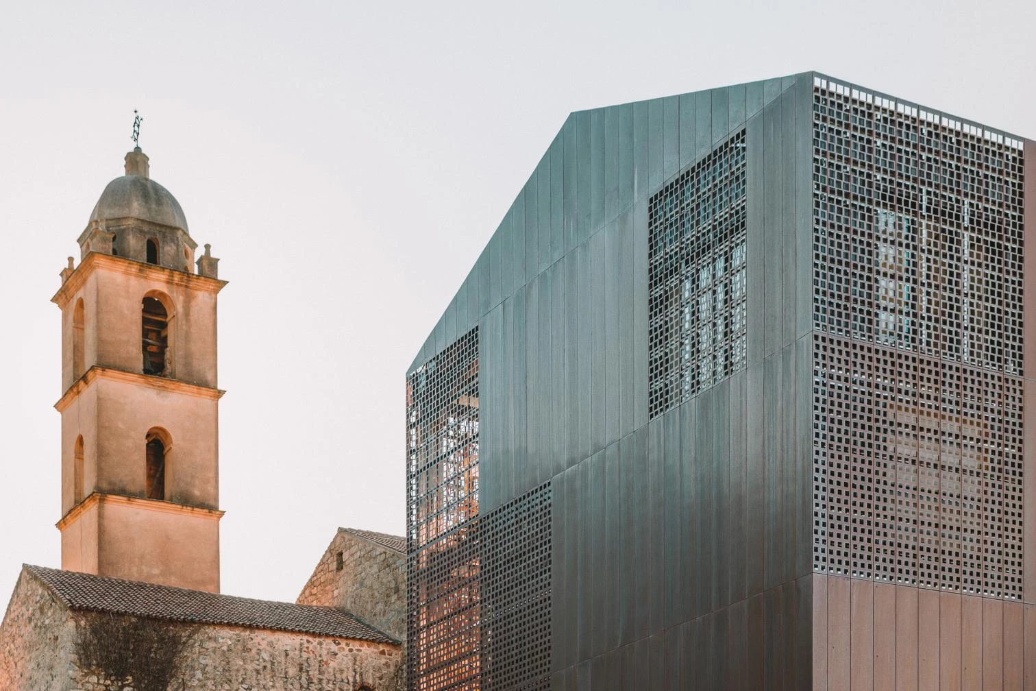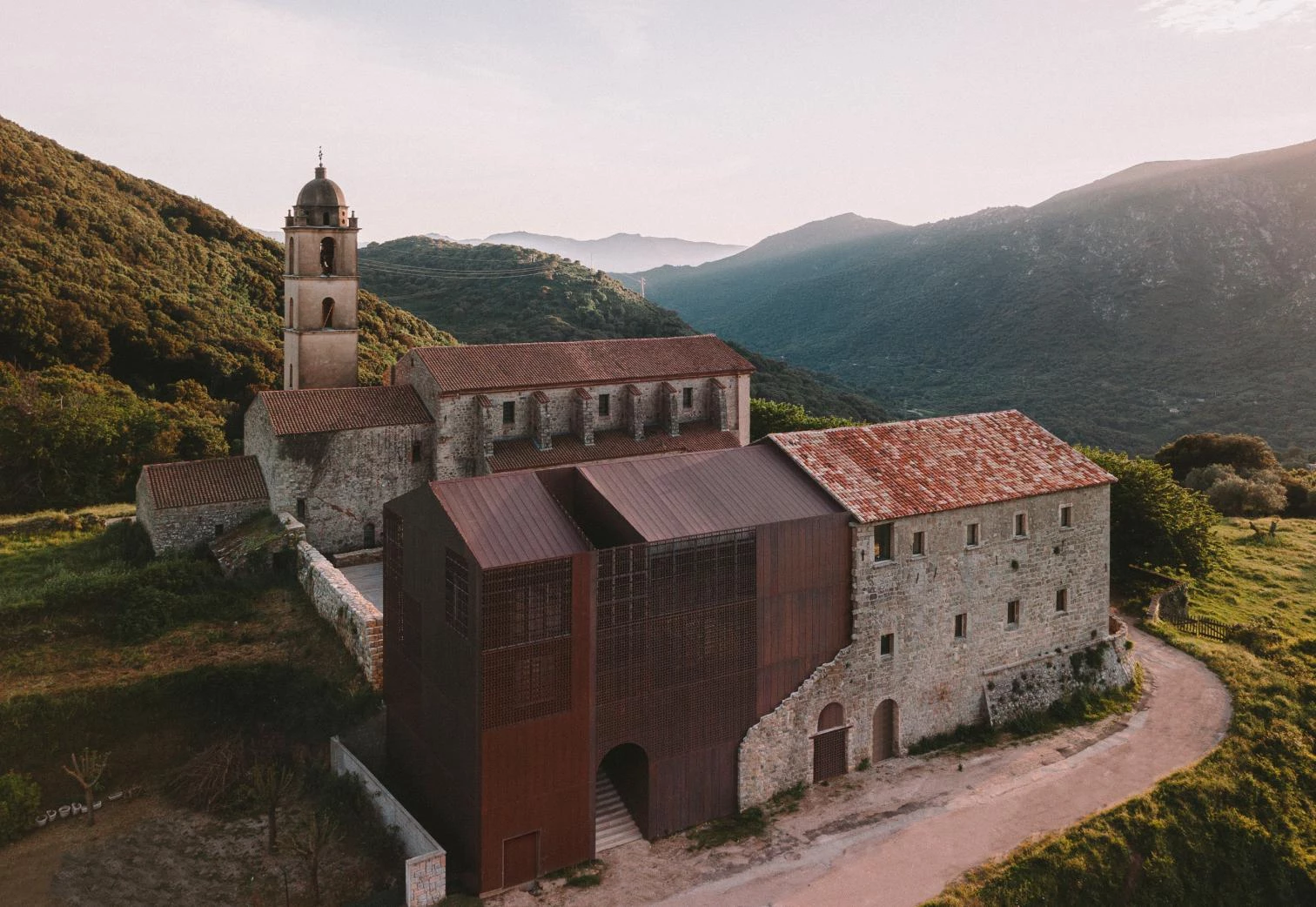 Amelia Tavella has renovated and extended a convent on her native island, Corsica, turning it into a cultural center for the town of of Sainte-Lucie-de-Tallano. Immersed in a mountainous landscape, the Convent of Sainte-François, built in 1480, was abandoned and partly in ruins. Amelia Tavella Architectes sought to preserve the history and essence of the monastic premises, adding a perforated copper volumen that reinterprets the torn part of the preexisting stone construction and harbors an exhibition room, a media library, and spaces for children. In this way, the reconstruction of the religious building preserves the vestiges of its history.