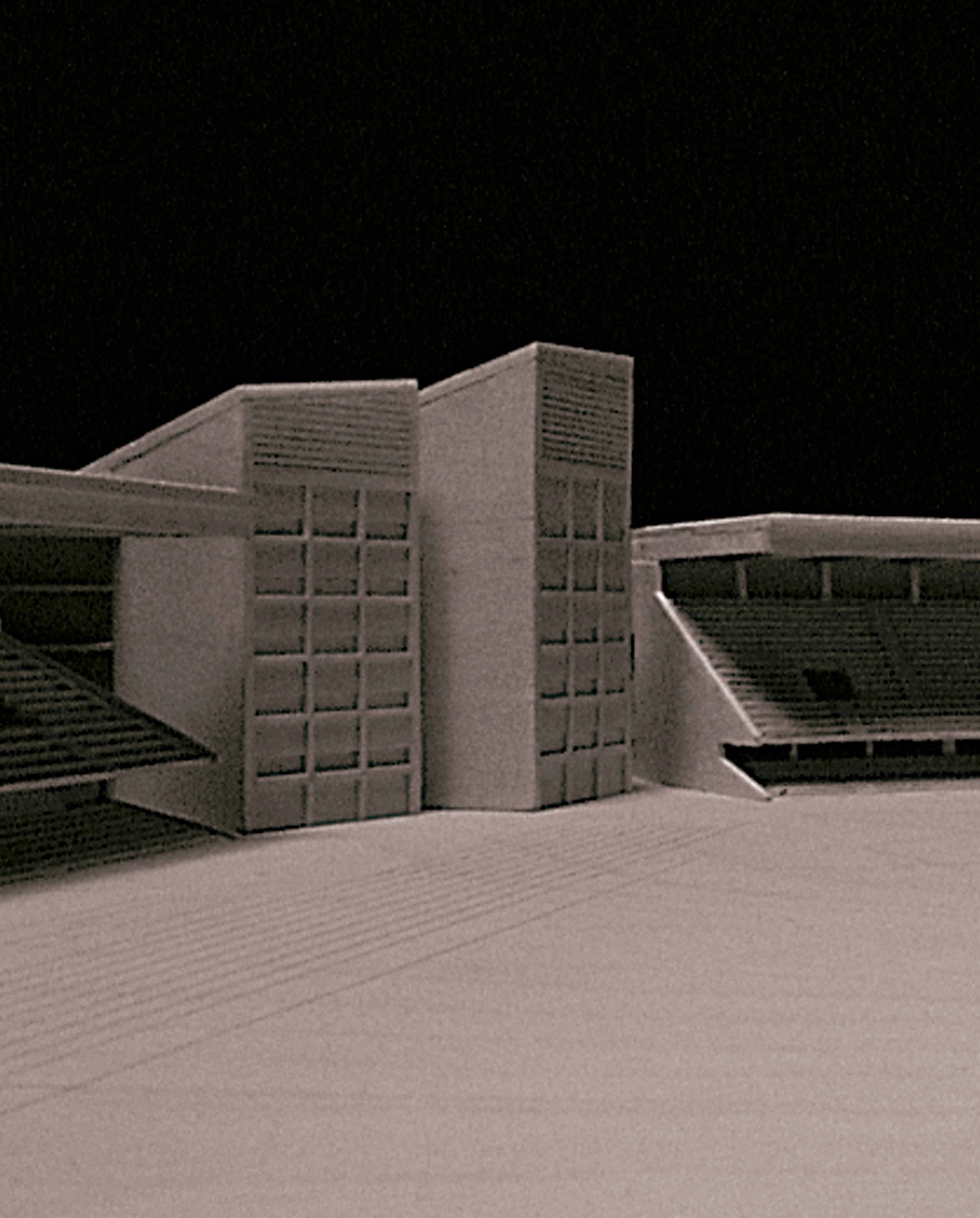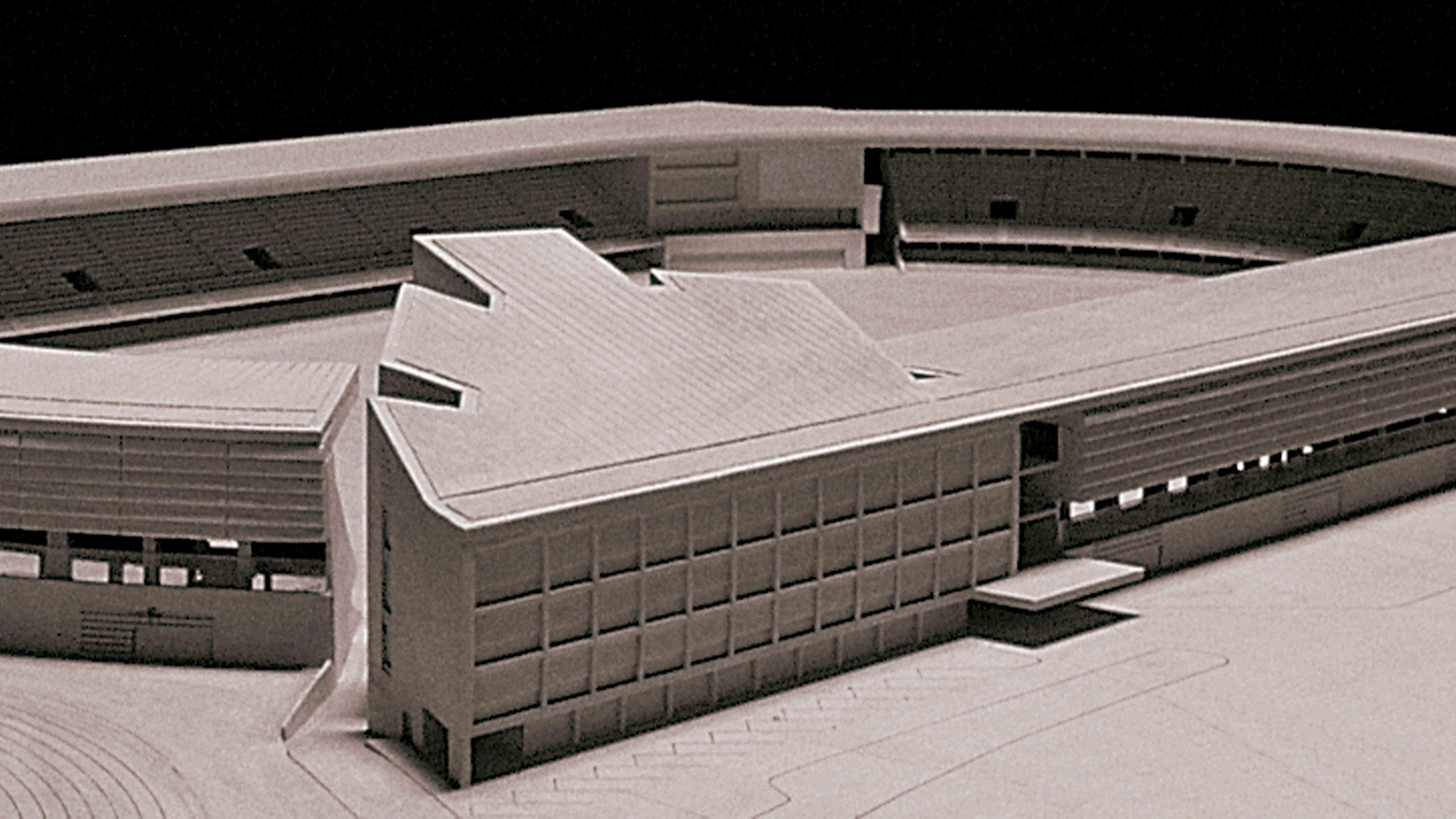 The rectangular floor plan of the Chapín stadium in Jerez is rounded off by two semicircles that clearly reflect the shape of the athletics track which surrounds the soccer field. Without significantly altering its plan, the extension project foresees a roof spanning 18 meters to protect the spectators from the sun and rain, creating a perimetral space to enlarge the capacity of the upper stands. Below the new seats, a large ambulatory area brings together the stairs and the footbridges that connect with the upper stands, as well as the bar, the restrooms and other complementary facilities that are outwardly revealed forming a plinth. The new enclosure of prefabricated panels detaches itself from this base by means of a horizontal slit through which the city is viewed. The grandstand with private boxes and commentators’ area is at an upper level and can be directly accessed from the outside of the stadium. The original symmetry of the whole is broken at two ends by two fan-shaped volumes that house an indoor swimming pool and a 69-room hotel for soccer players and athletes that outlooks the field and tracks. In this way, other uses guarantee the ongoing activity of this center further than the sports events...