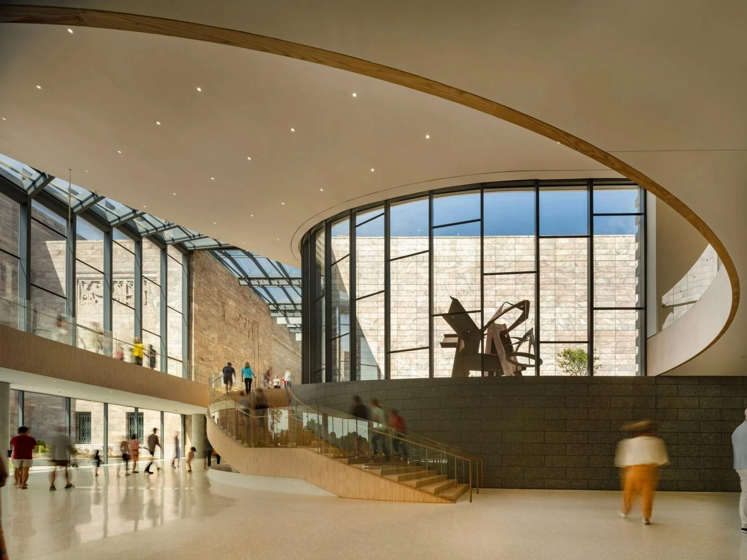 The 3,900-square-meter new Rhonda & Howard Hawks Pavilion, clad in concrete and marble, rises on two granite walls with a transparent first floor. Divided into two levels, it provides additional galleries, a store, and a new main entrance for the museum. A long wooden staircase and a doble-height opening, which repeat the building’s curve, connect the two levels internally. The new building’s foyer connects with the glass atrium of Foster’s extension.