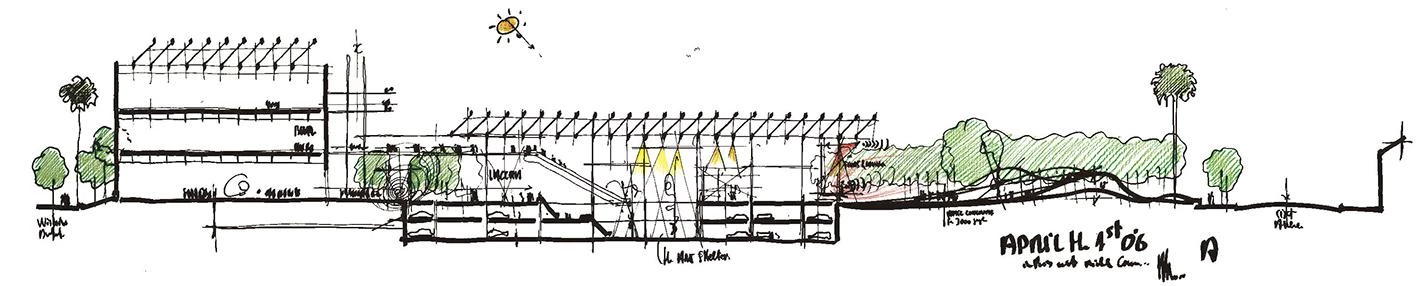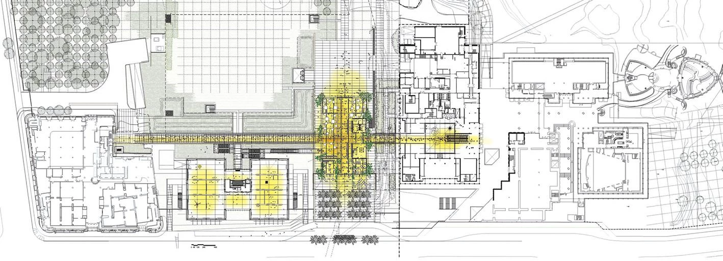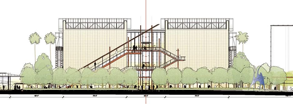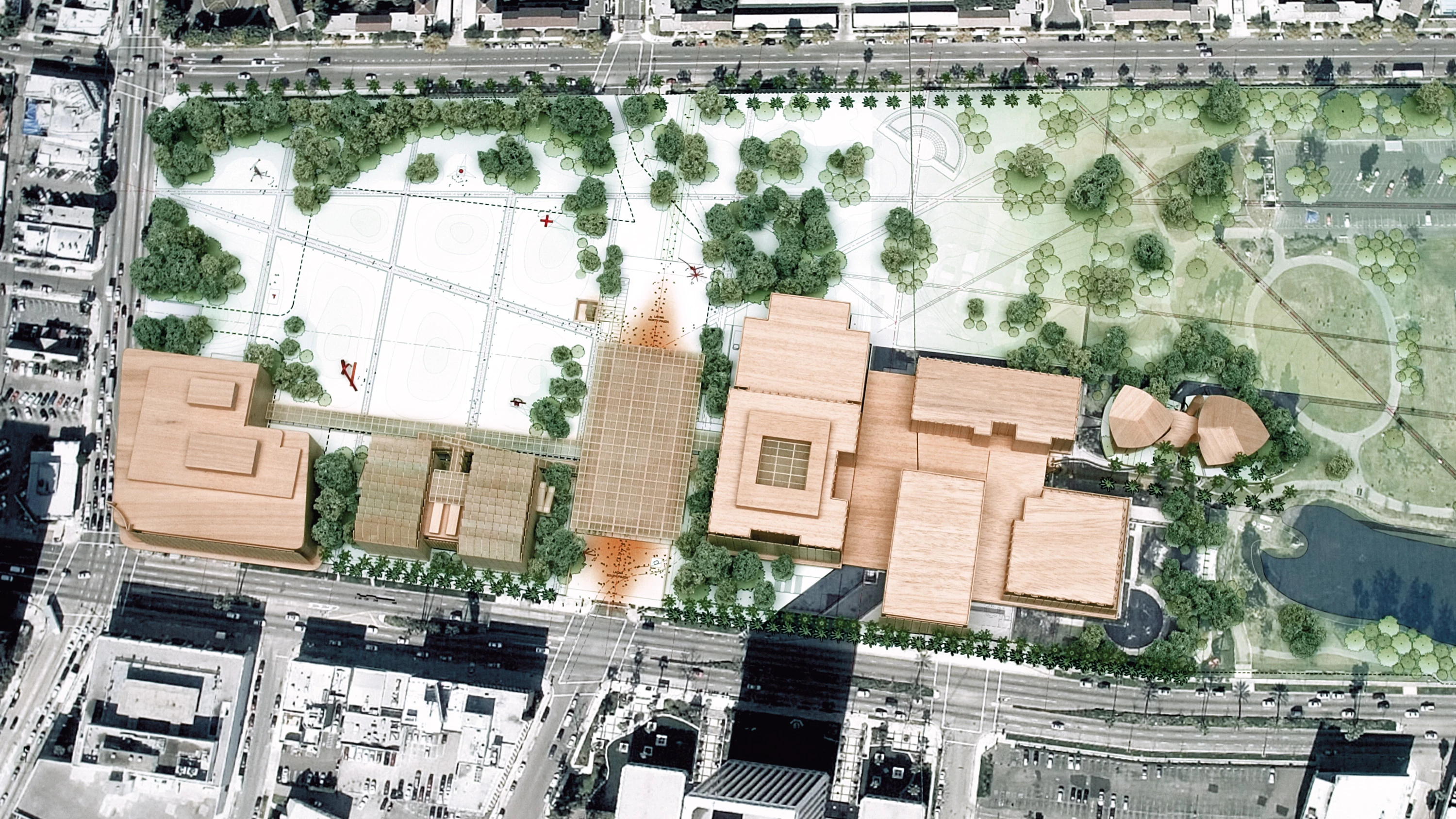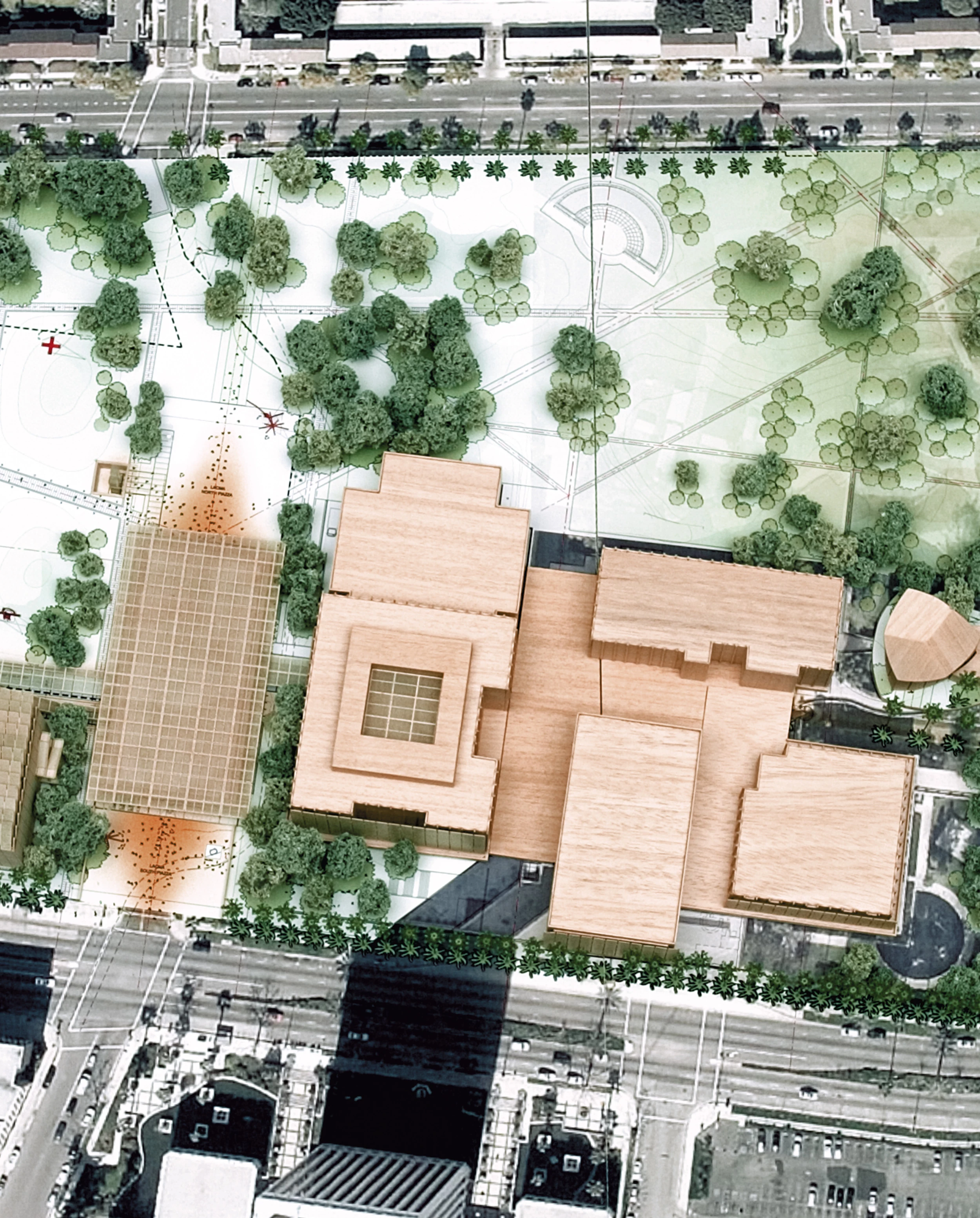 This project undertakes the restructuring of a scattered architectural heritage, with an extension that seeks to seamlessly blend the old and the new. To preserve the existing buildings and their architectural peculiarities, the extension plan includes a glass entrance pavilion, an exhibition building – the Broad Contemporary Art Museum (BCAM) – and the creation of a large park adjacent to Hancock Park.
