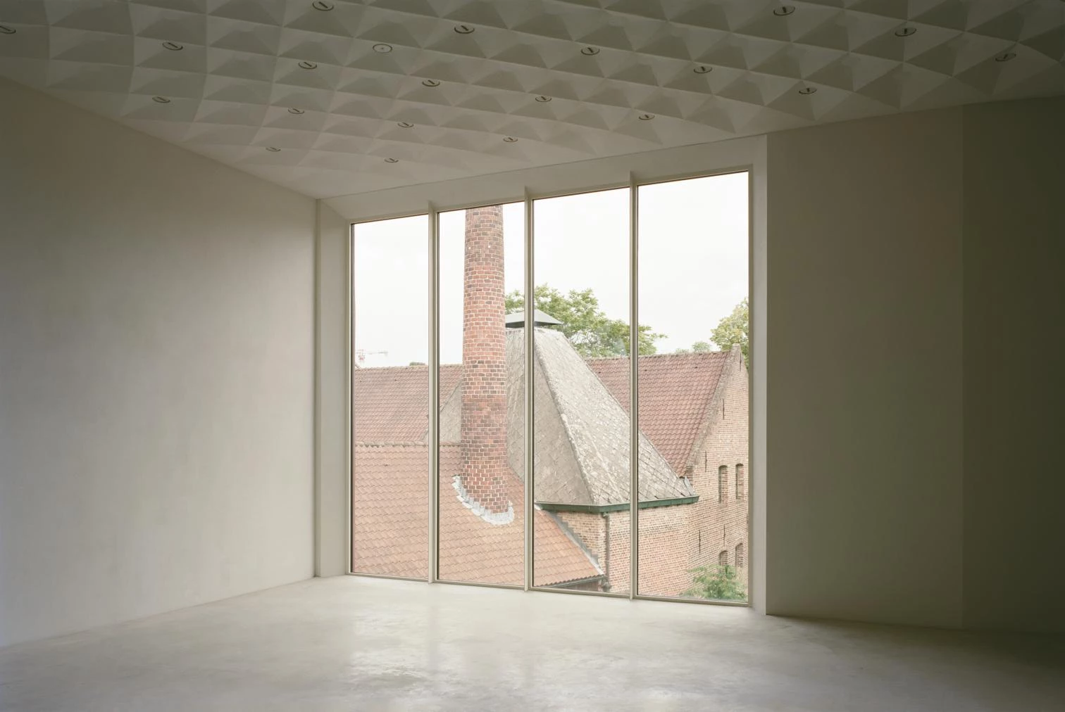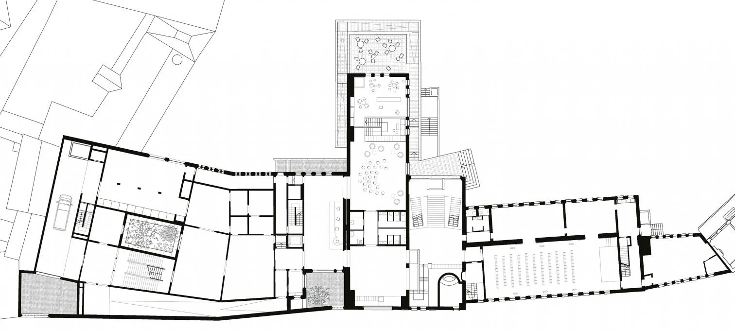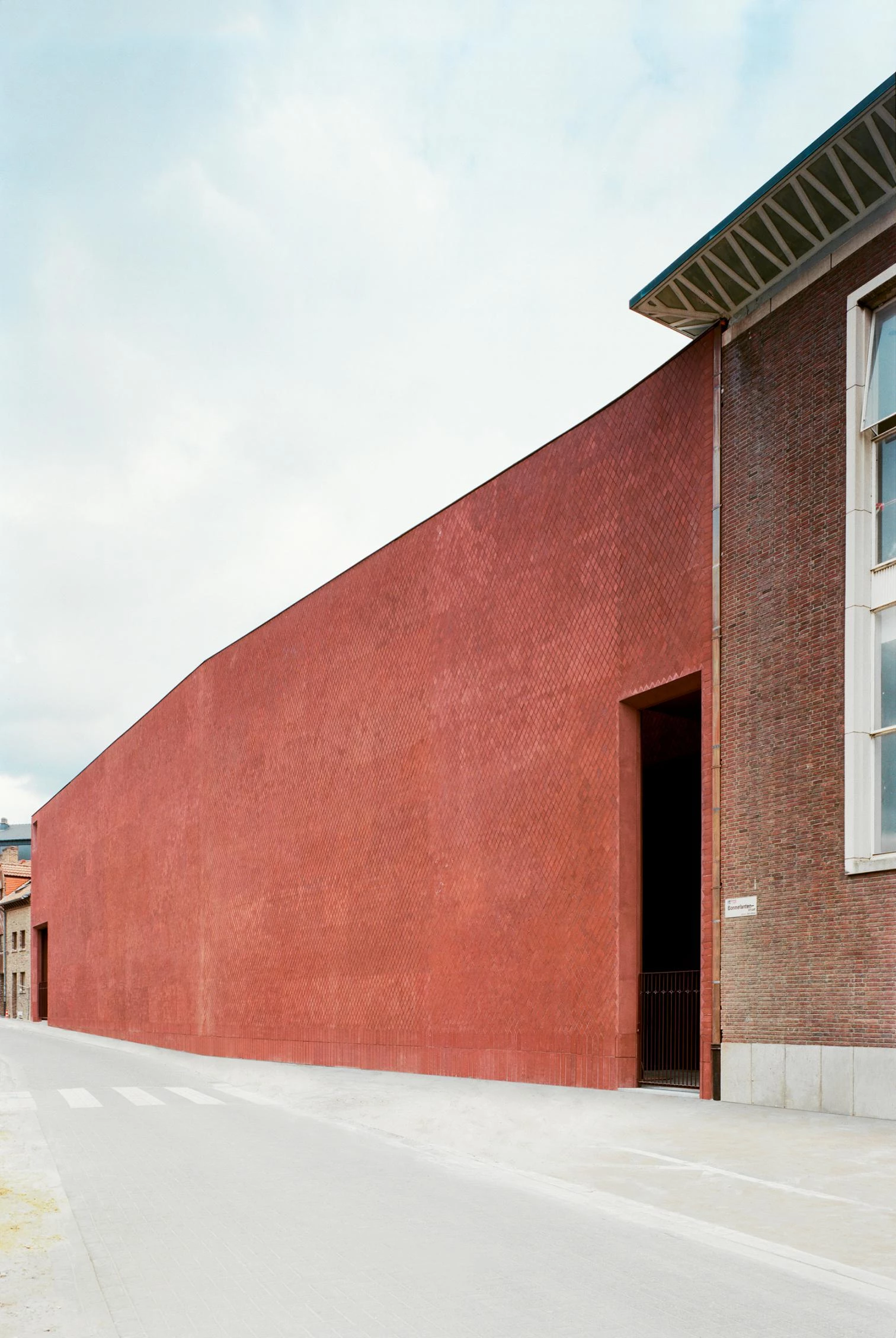 The extension of the Z33 art center completes the closed block of the beguinage of Hasselt with a blind wall to the street that orients the interior spaces toward the rear courtyard.
