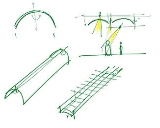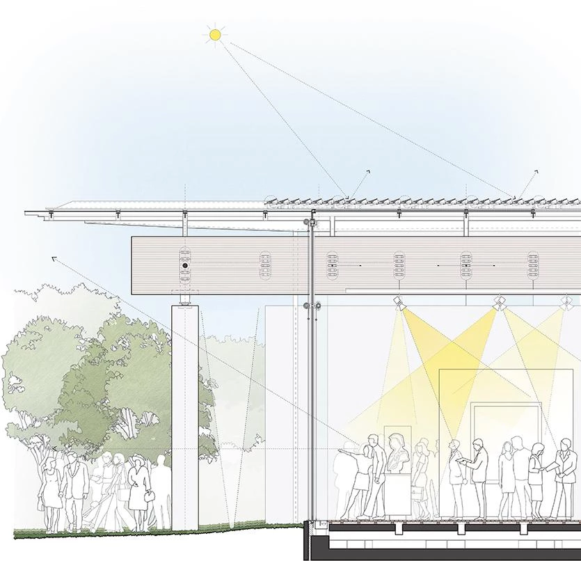 On either side, behind pale concrete walls are two gallery spaces for temporary exhibitions. A sequence of square concrete columns wraps around the sides of the building, supporting solid wooden beams and the overhanging eaves of the glass roof, providing shade for the glazed facades facing north and south. In the galleries, a sophisticated roof system layers stretched fabric, the wooden beams, glass, aluminum louvers (and photovoltaic cells), to create a controlled day-lit environment. This can be supplemented by lighting hidden behind the scrim fabric.