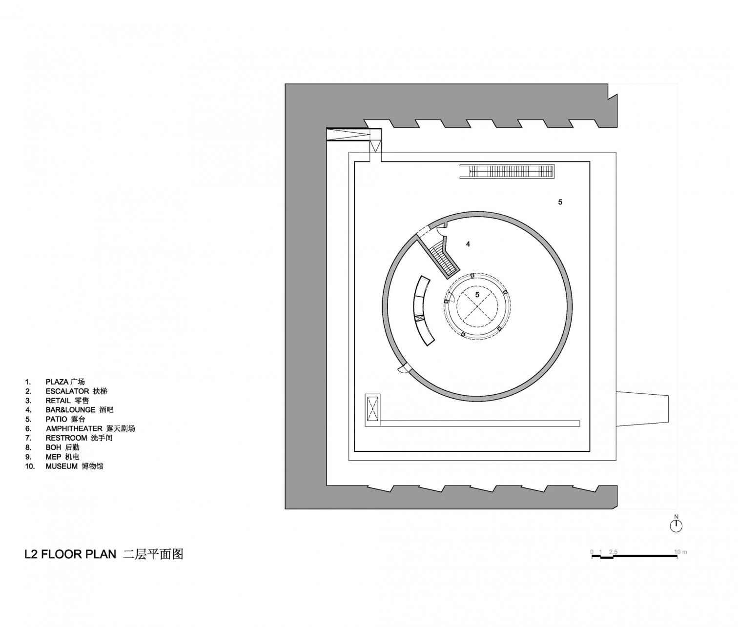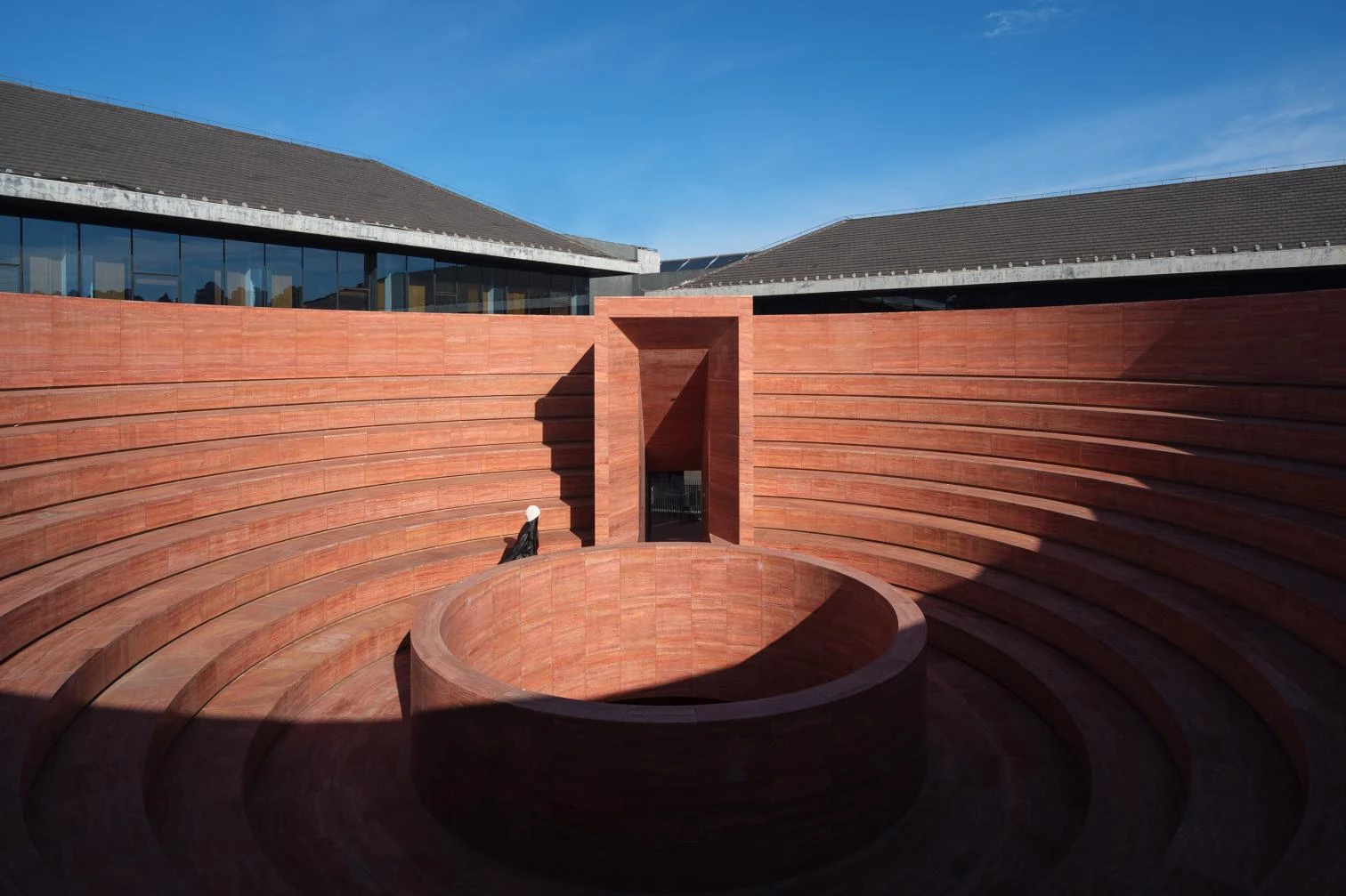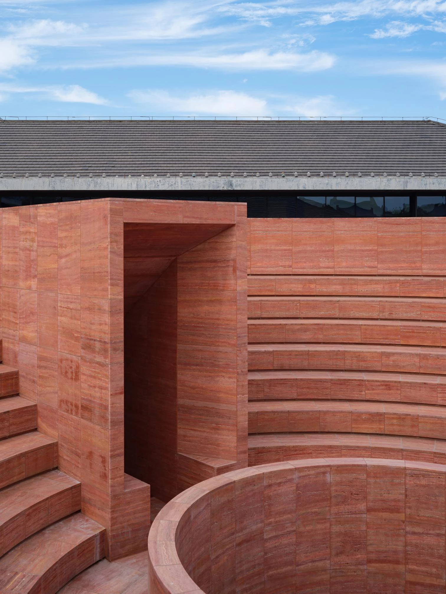 The mission assigned to Lyndon Neri and Rossana Hu was to create a new architectural icon at the east entrance to the museum, and the Shanghai firm responded with a scheme topped with a circular volume, a urban monument addressing new cultural and commercial functions. The monolith contains an outdoor amphitheater for public activities and private events alike. This circular mass was sculpted with units of red travertine masonry, set at intervals to accentuate plays of light.