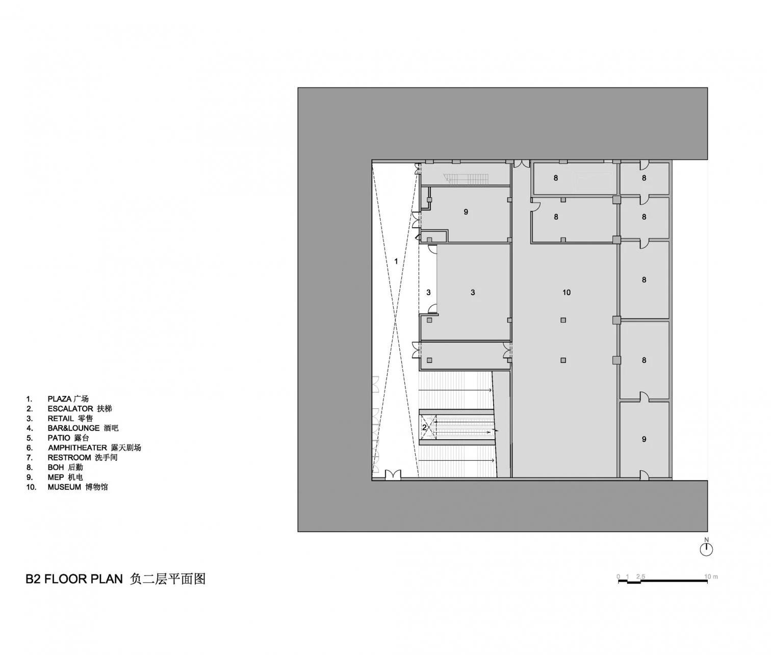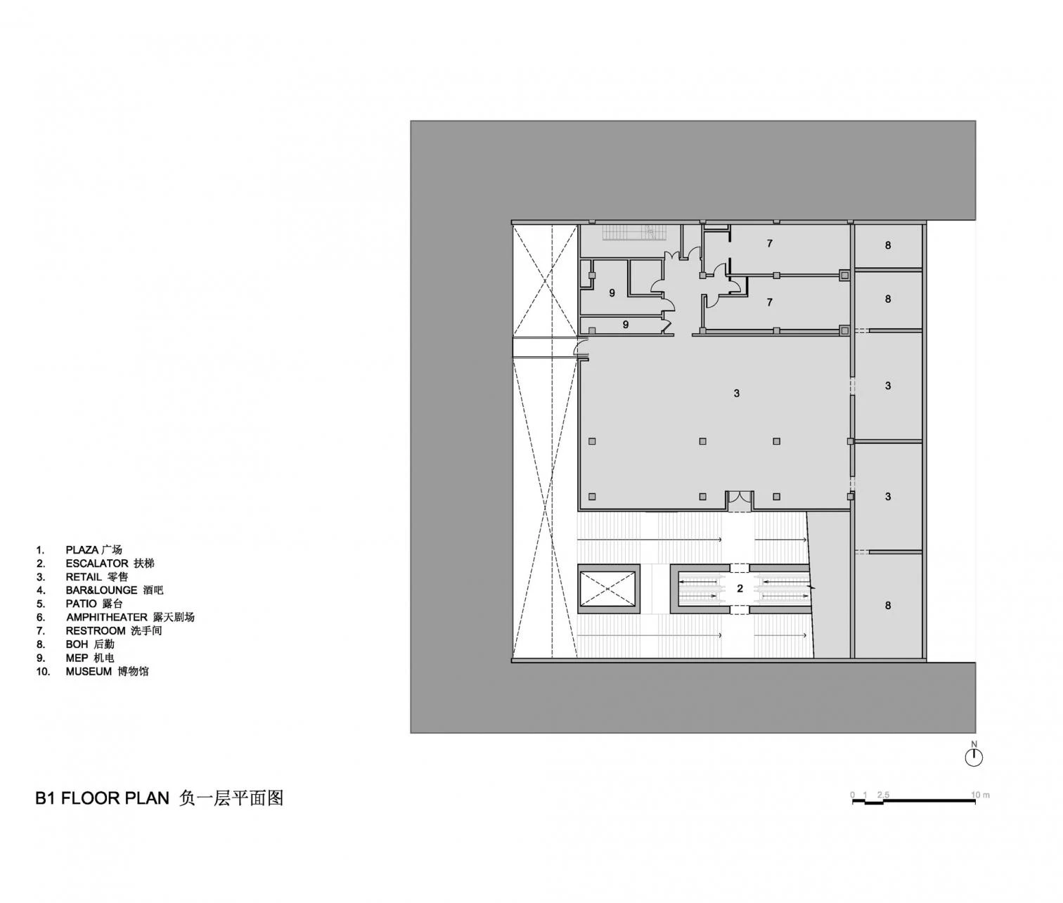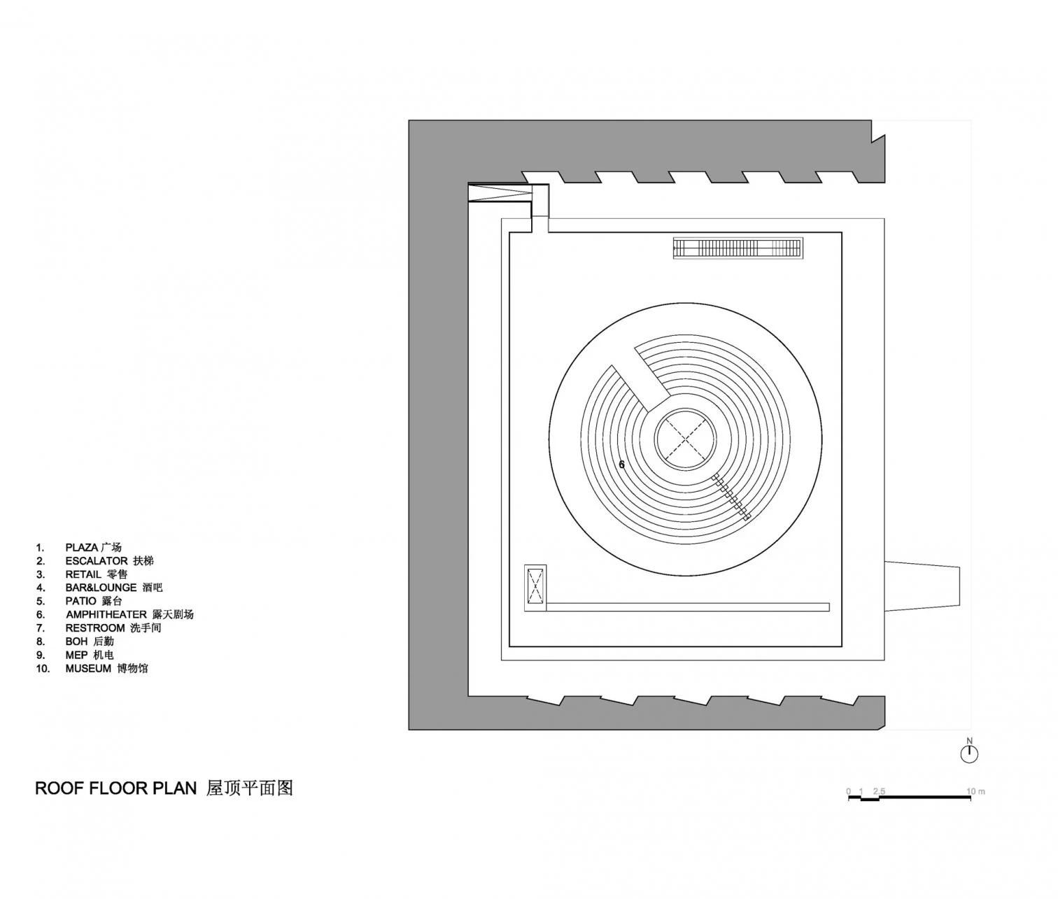 The mission assigned to Lyndon Neri and Rossana Hu was to create a new architectural icon at the east entrance to the museum, and the Shanghai firm responded with a scheme topped with a circular volume, a urban monument addressing new cultural and commercial functions. The monolith contains an outdoor amphitheater for public activities and private events alike. This circular mass was sculpted with units of red travertine masonry, set at intervals to accentuate plays of light.
