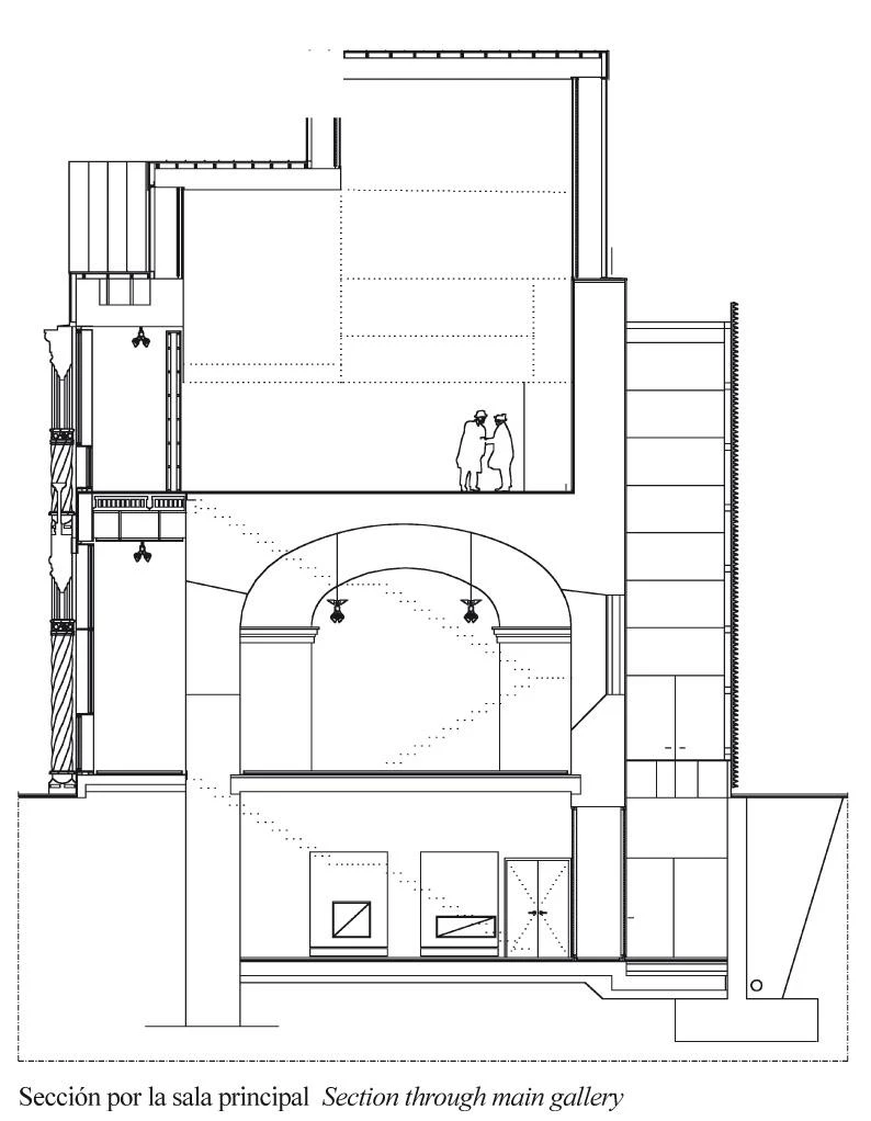 The terraced section of the rooms it accommodates modifies the interior space, letting top light illuminate the tallest pieces of the museum. Thought of as part of a larger project, the project is set forth as another chapter in the life of a building in constant transformation, within an openended process that does not know yet how or when it will conclude.