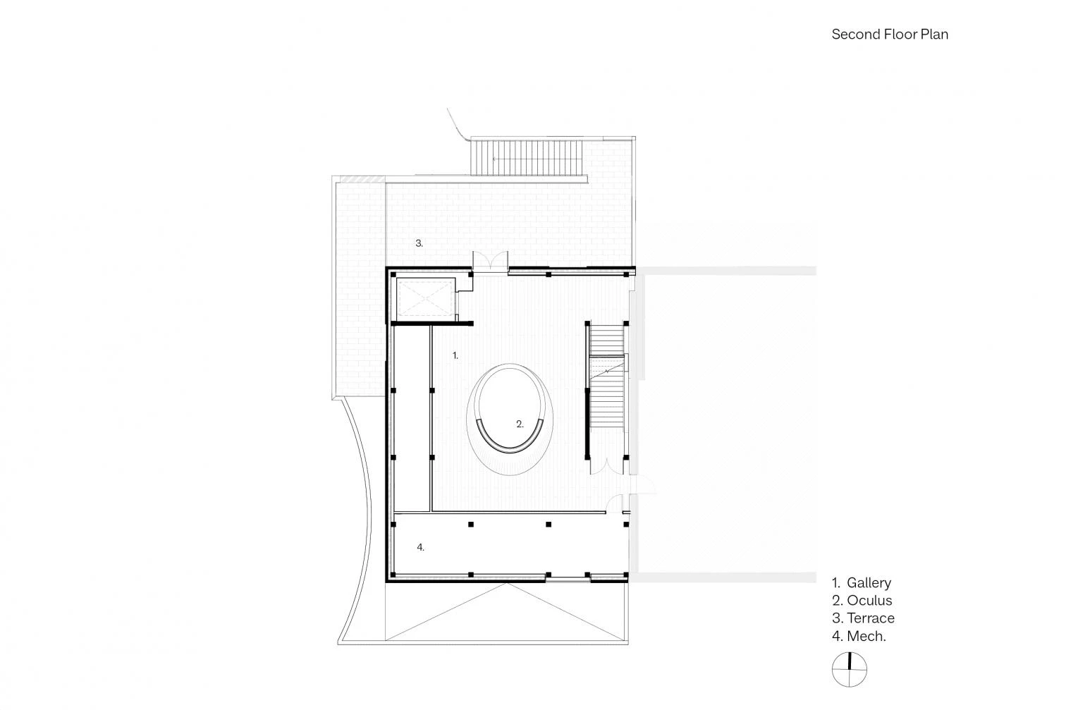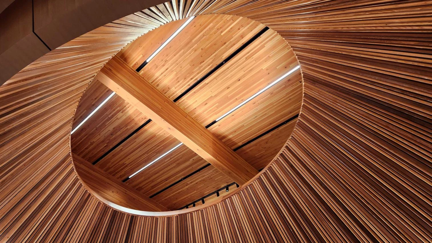 Drawing inspiration from the shape of a traditional Norwegian boat, the wooden entrance juts out in a cantilever, inviting people in. An off-center glass volume is embedded into the facade and made to rise to both upper levels. Inside, a wooden oculus illuminates the foyer. Its shape evokes the tents of the Sámi, the indigenous group of about 80,000 people scattered in Norway, Sweden, Finland, and Russia.