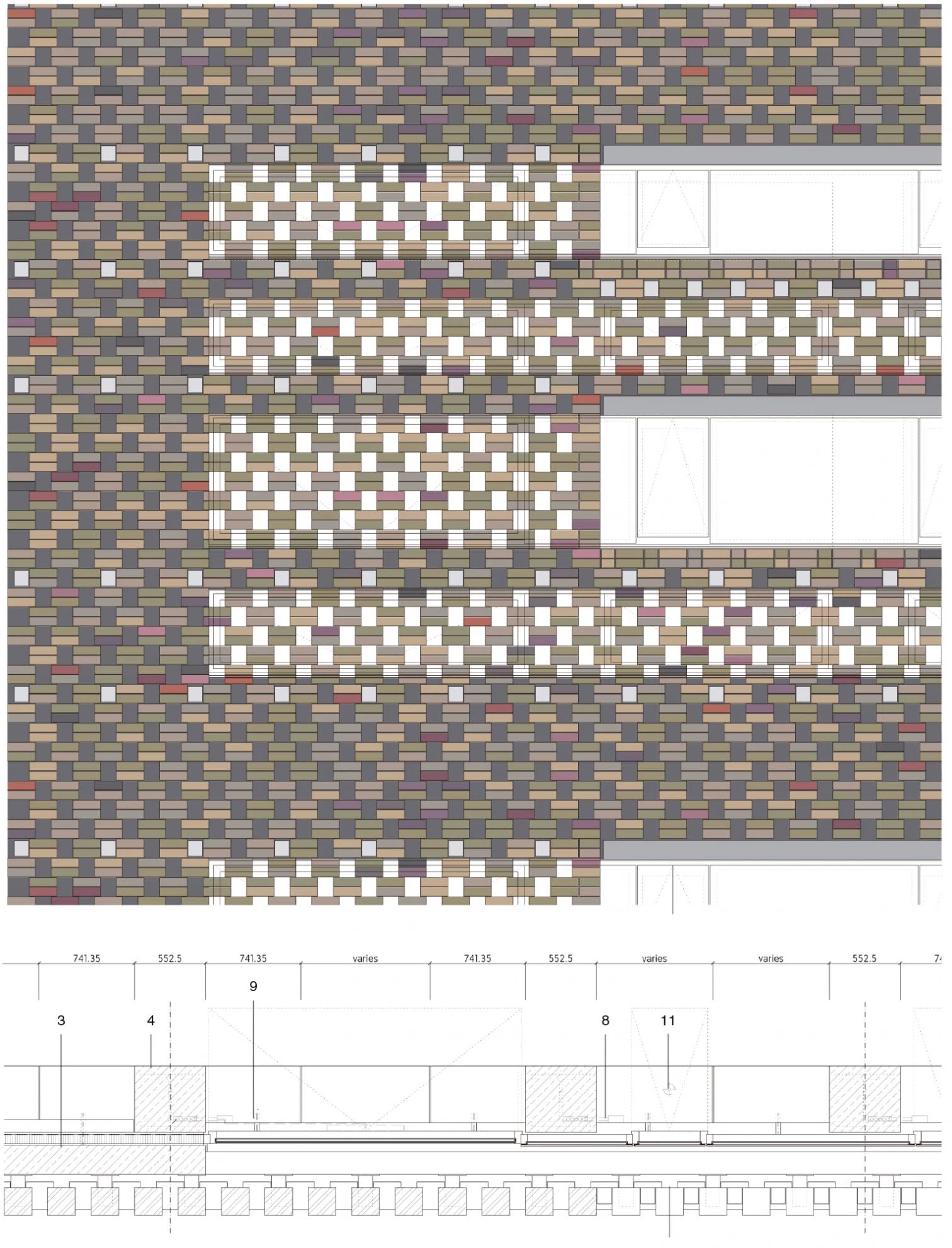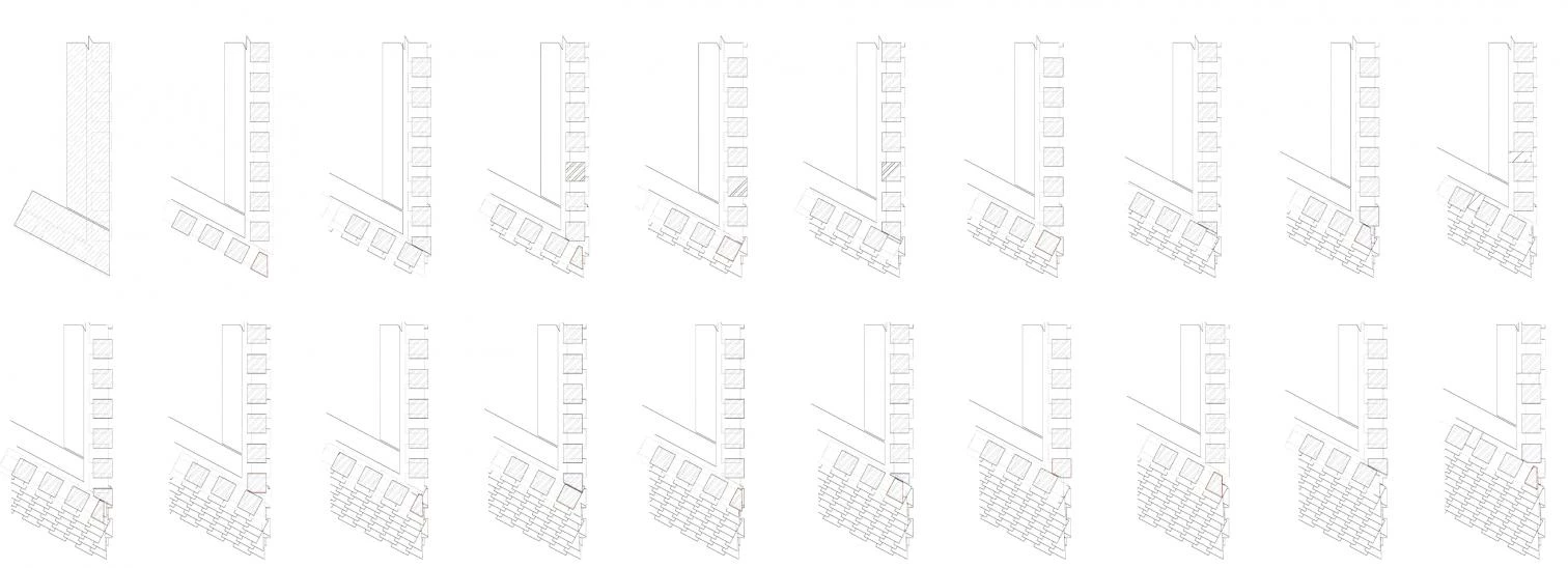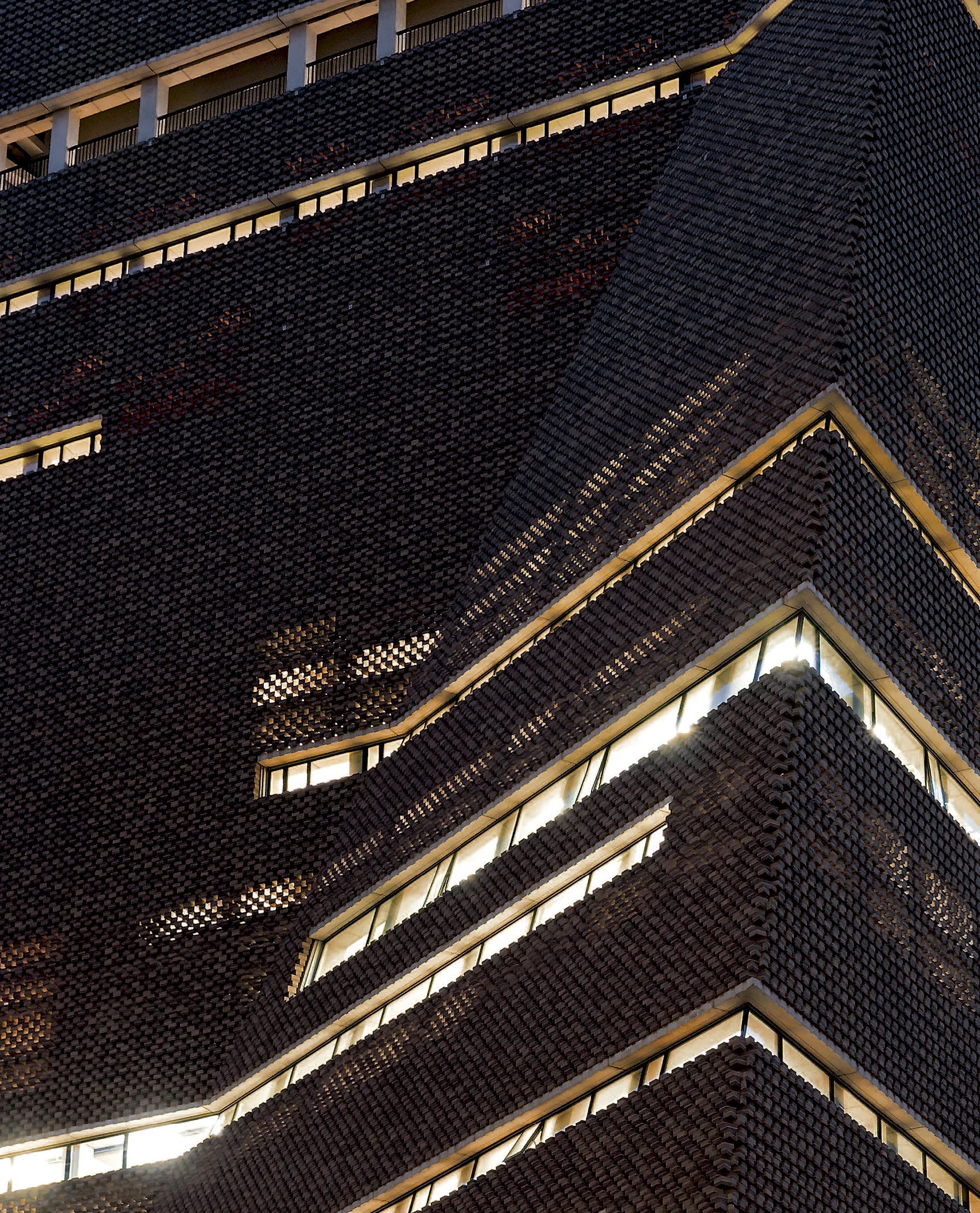 Arranged in a radical new way, the brick forms a perforated screen which filters the light coming in during the day, and through which the building glows at night. The brickwork reacts to the inclined faces by gradually stepping back, transforming itself from a massive material to a veil that covers the concrete skeleton. Strategic horizontal cuts break the continuous brick wrap, affording views and providing daylight and natural ventilation inside.