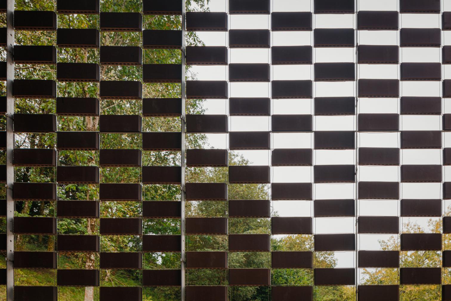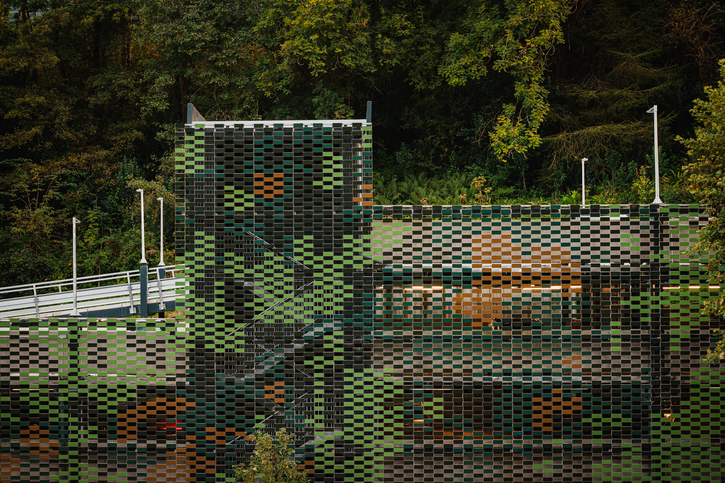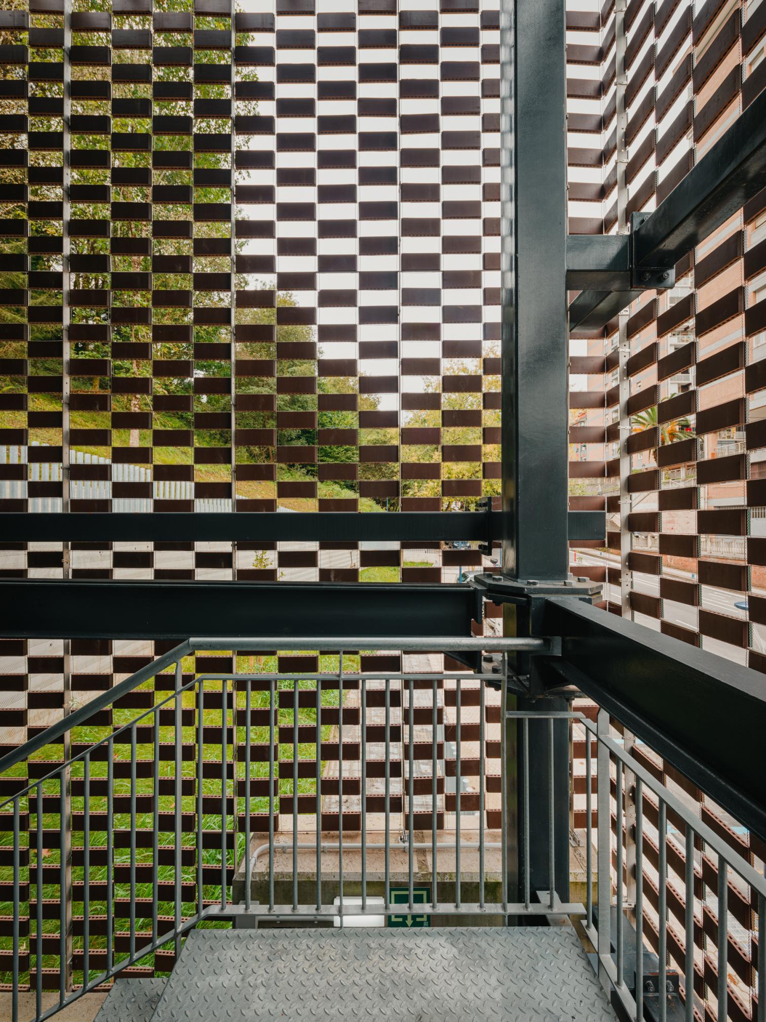 On the other hand, the building’s most characteristic feature is its openwork skin, which makes for constant cross ventilation. Made with the Flexbrick patent, this ceramic membrane goes by the same philosophy of assemblage and montage. The independent pieces generate a pixelated pattern wrapped around the 100-meter-long facade. Built with industrialized systems, the construction stands amid the urban landscape of a working-class district, using four colors close to green and brown.