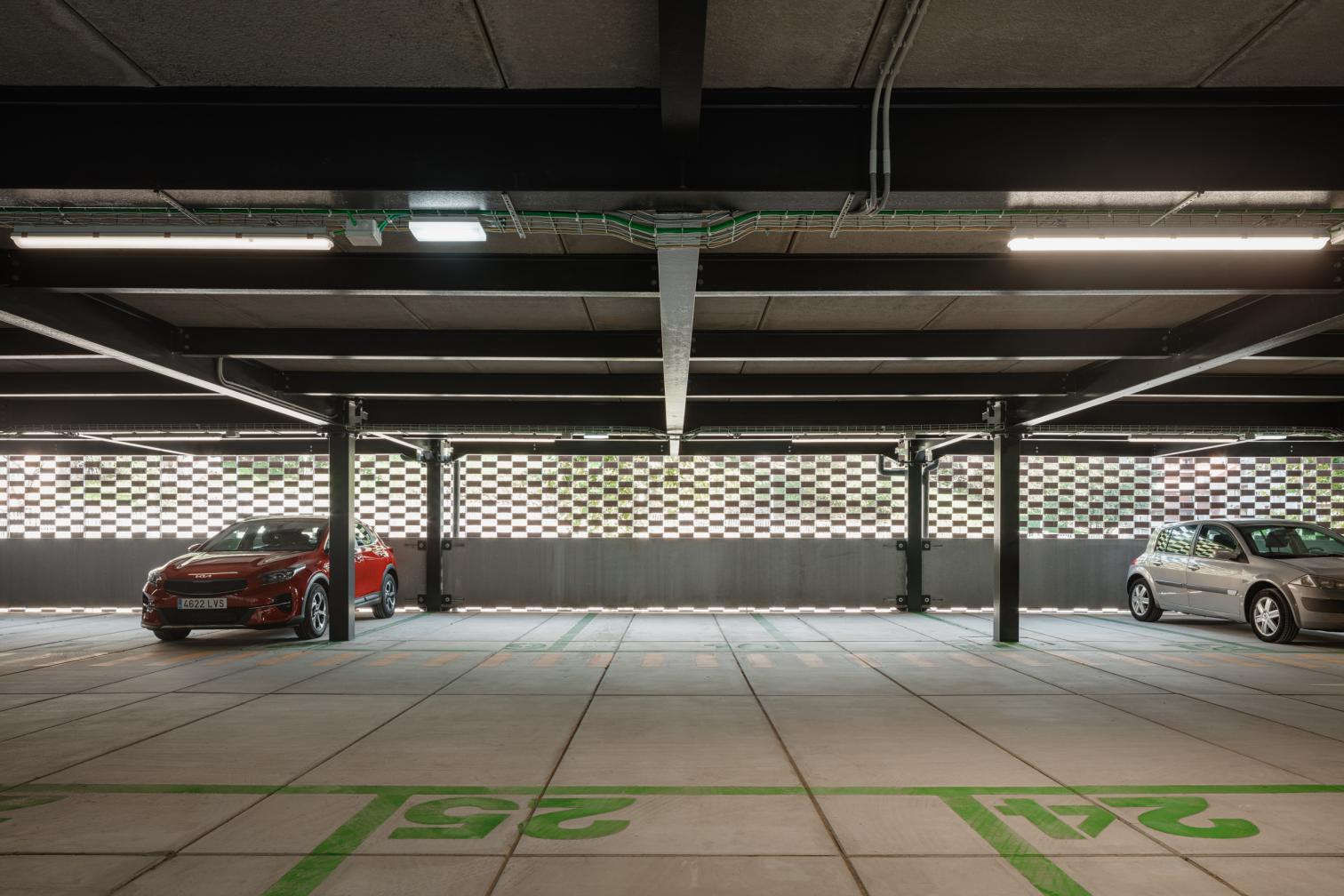 Parking is above ground and there is space for 181 vehicles, and the building is stepped, adapting to the slope of the street. The main entrance is on an upper level, so vehicles descend to the ground-level exit.