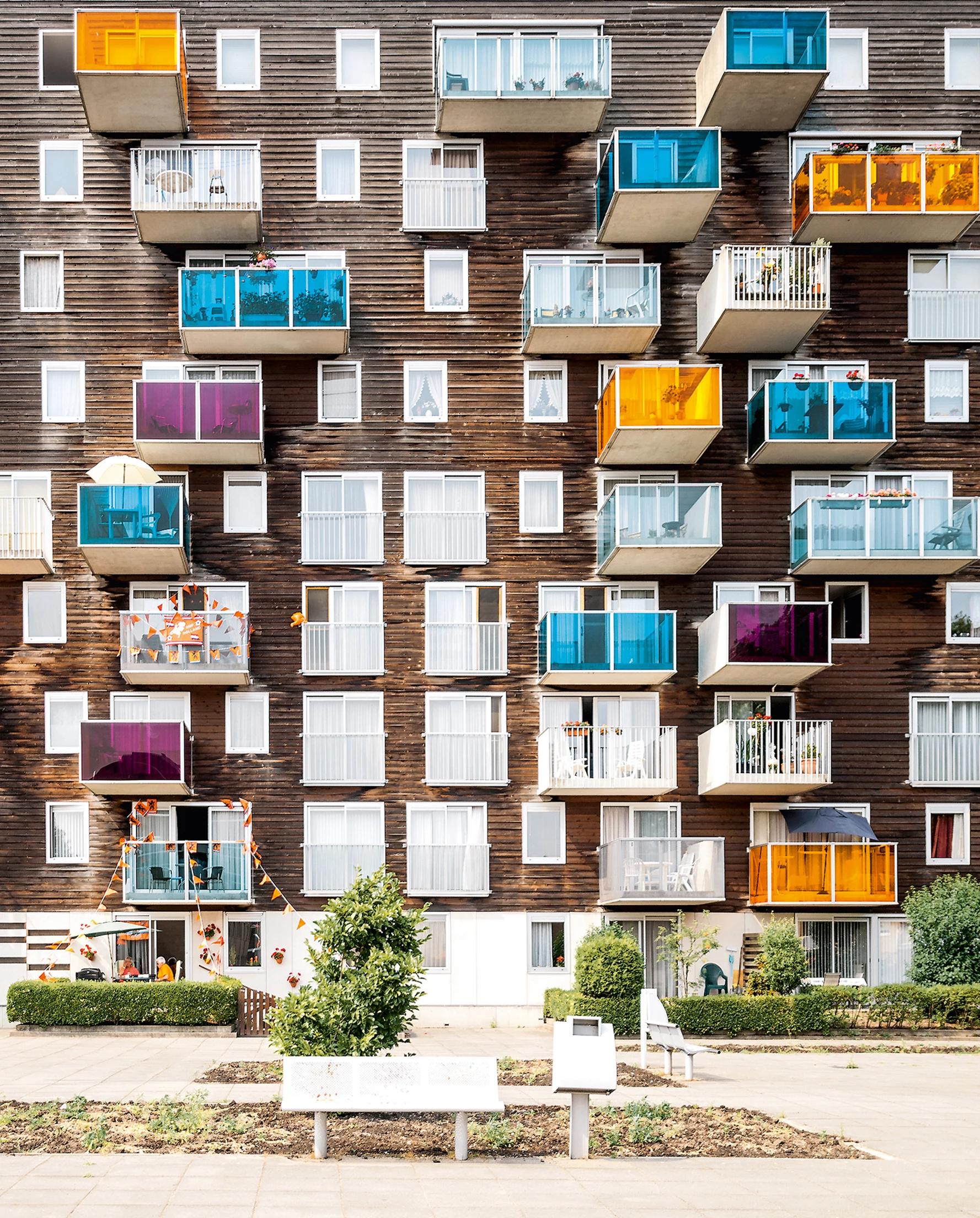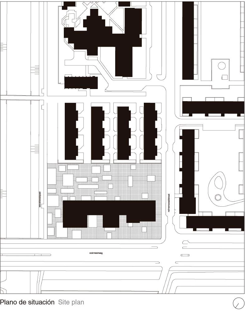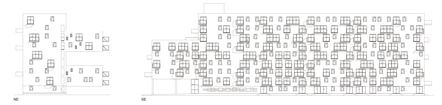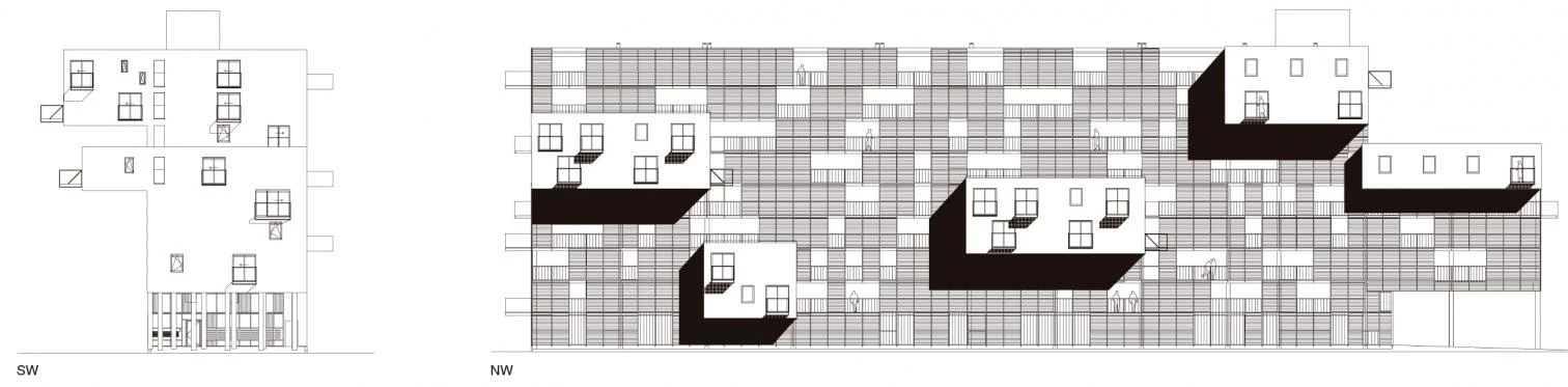 The block proposed contains 100 apartments and services for people over 55 years, is elongated in shape, and has a north-south orientation. The apartments adopt a wide module on facade, of 7.20 meters, to make up for the lack of depth due to the narrowness of the plot. However, only 87 apartments could fit in the volume of the block to ensure adequate sunning in all the units. This encouraged to cantilever the remaining 13 from the north facade, complying with the building codes and not taking up any more of the open spaces. Cantilevered and facing east and west, the apartments open up to the views of the nearby polder. The variations in the position of the windows and in the materials and size of the balconies give each apartment a character of its own. By cantilevering the units and freeing up space it is possible to establish a model of growth for these areas, respecting the old historical gardens.