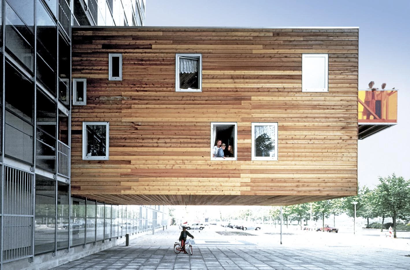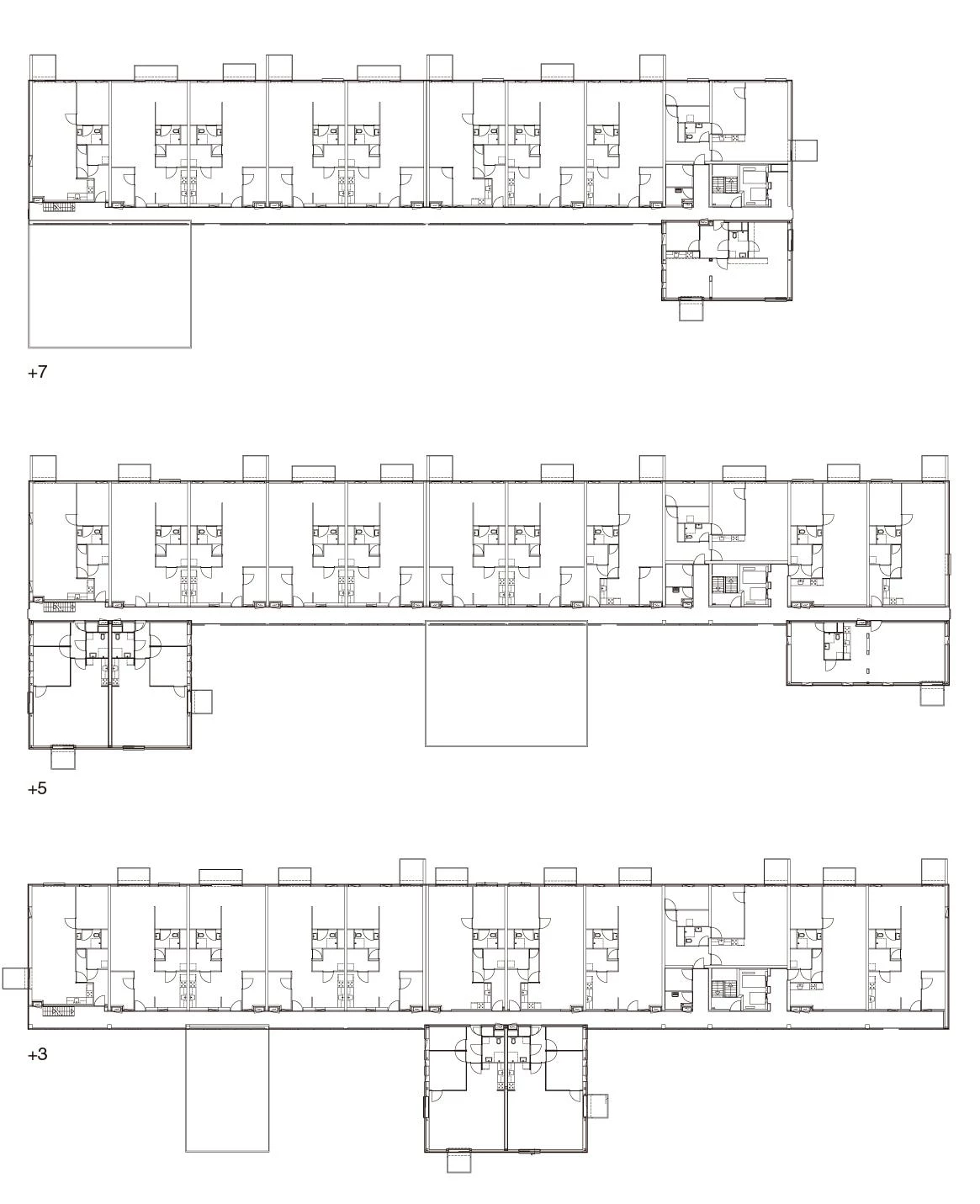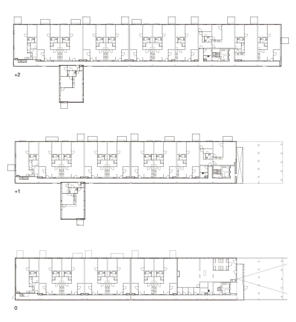 The block proposed contains 100 apartments and services for people over 55 years, is elongated in shape, and has a north-south orientation. The apartments adopt a wide module on facade, of 7.20 meters, to make up for the lack of depth due to the narrowness of the plot. However, only 87 apartments could fit in the volume of the block to ensure adequate sunning in all the units. This encouraged to cantilever the remaining 13 from the north facade, complying with the building codes and not taking up any more of the open spaces. Cantilevered and facing east and west, the apartments open up to the views of the nearby polder. The variations in the position of the windows and in the materials and size of the balconies give each apartment a character of its own. By cantilevering the units and freeing up space it is possible to establish a model of growth for these areas, respecting the old historical gardens.