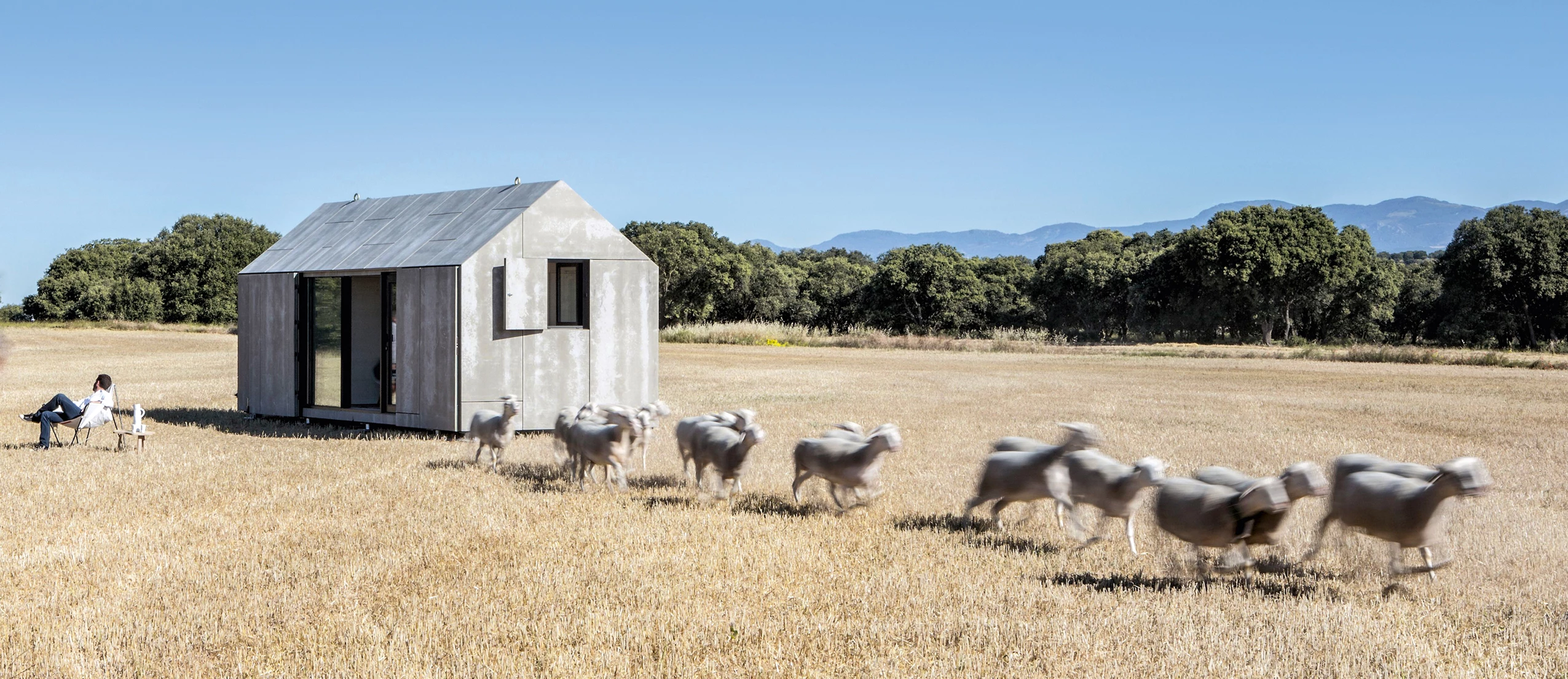 This house of 80 m³ and 27 m², designed for two people and transportable in a standard truck, is scalable and can be set up instantly. It contains three differentiated spaces: a living area/kitchen, a full bathroom with shower and one bedroom.