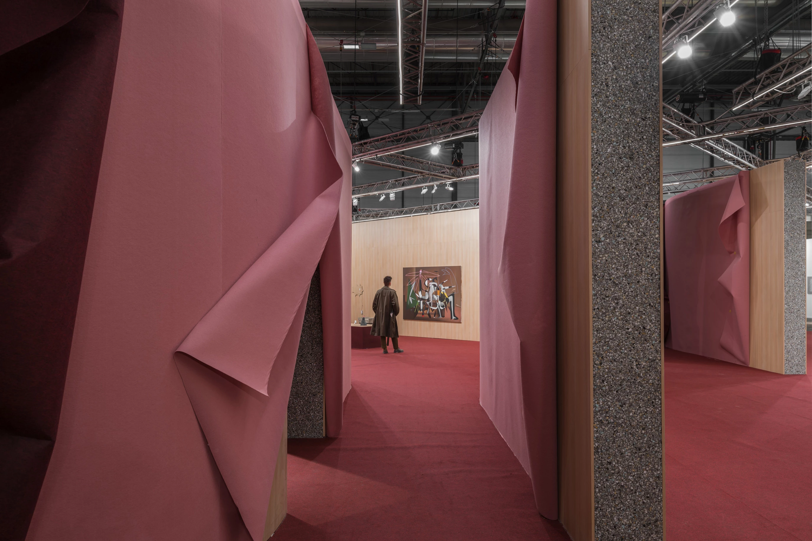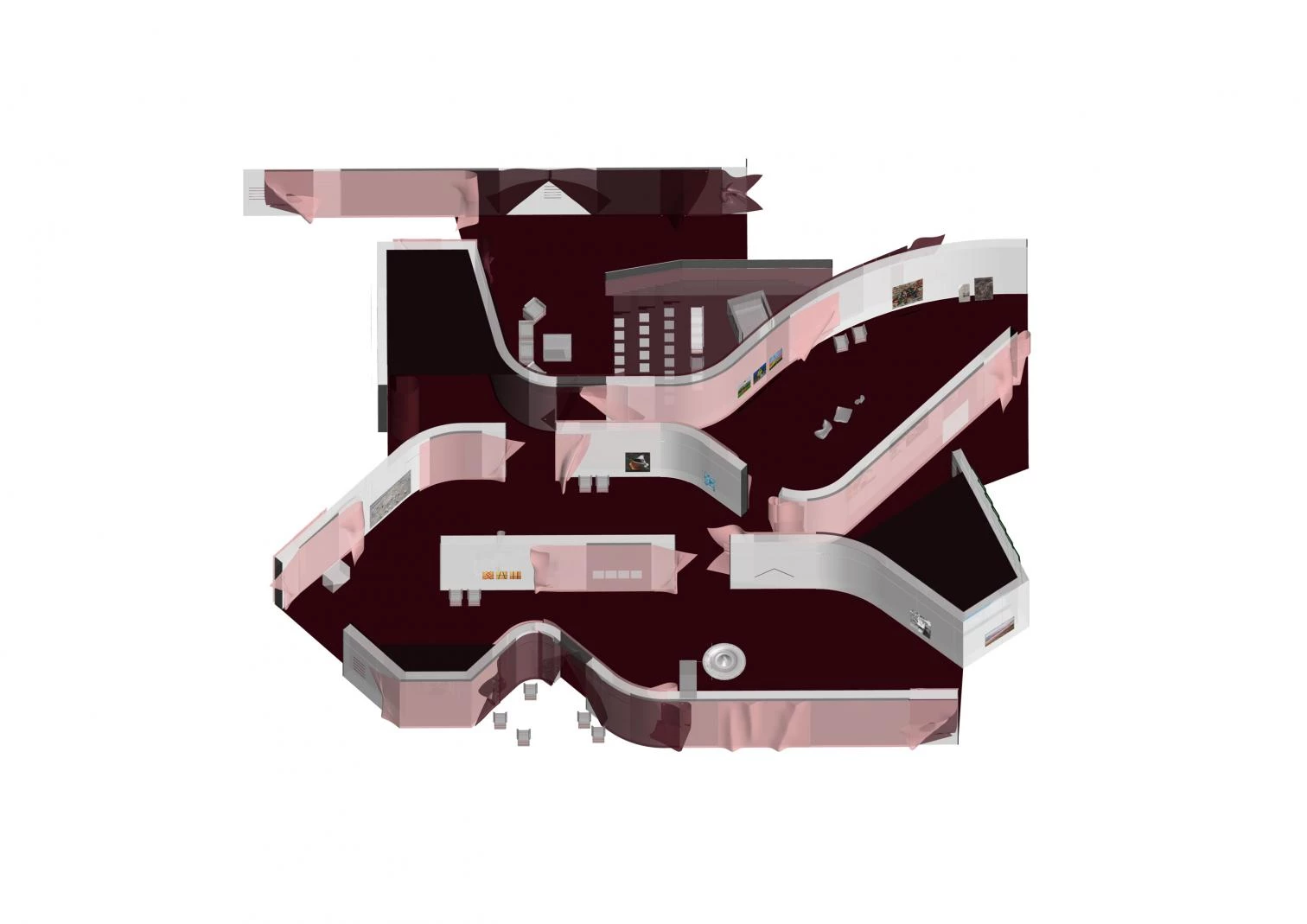 In dialogue with the curatorial theme and the works of the artists on display, the pavilion presents on one hand the flows, encounters, and confluences, and on the other hand the divisions, distances, separations, and dismemberments that make up this sea. The design translates the heterogeneous reading of the overlapping contexts found in the Caribbean through spaces that expand and compress, as well as surfaces that cut, fold, and twist.