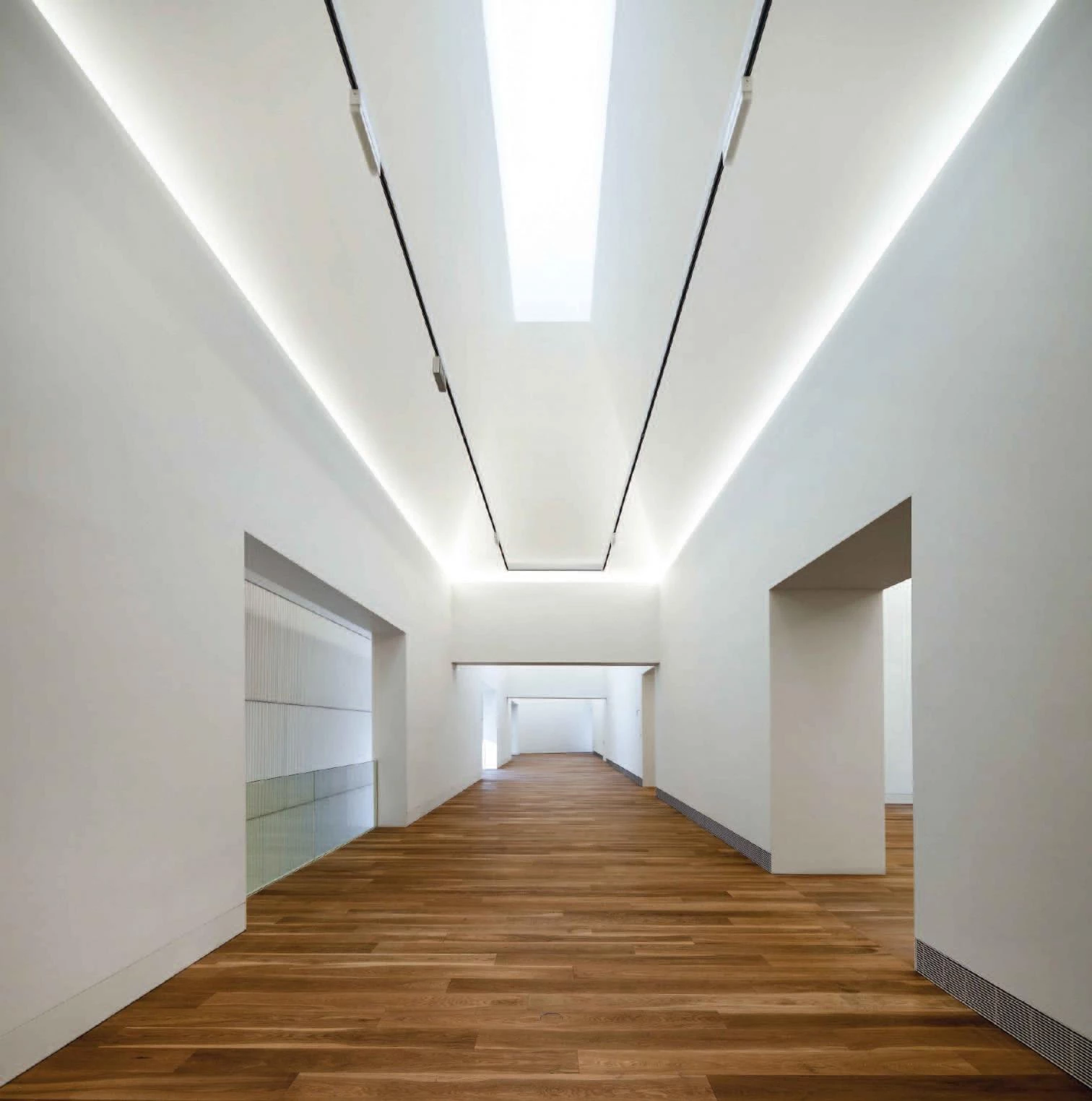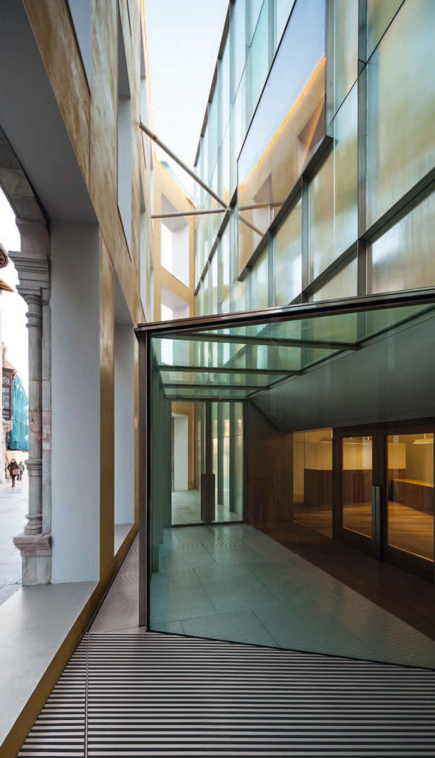 Two unique elements appear in the new construction. On the one hand, the new facade behind the historical one that is preserved onto Rúa Street and the corner of Rúa with Alfonso II square, an element with a great formal, visual and functional intensity that will become the new image of the museum, and that defines the public stairway that gives access to the different museum levels and the double and triple height spaces of the entrance, in dialogue with the historical facades as they approach or move away from them in the interior. This thick facade concentrates the two periods and permits an oblique view of the city. The carved finish of the glass on the new facade produces, in contact with the existing front, an interplay of reflections, an interaction between the two facades that creates an intense and rich space. The other unique element, from the formal point of view, are the roof skylights. Recessed from the facade, their visual impact from the exterior is reduced, but they give the interiors a rich spatial quality.