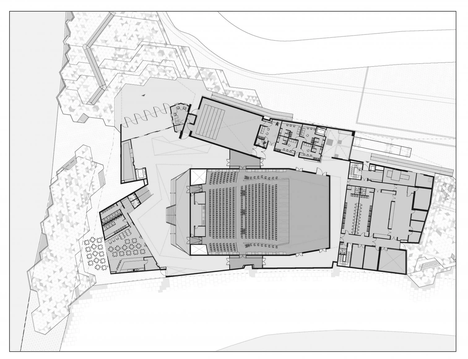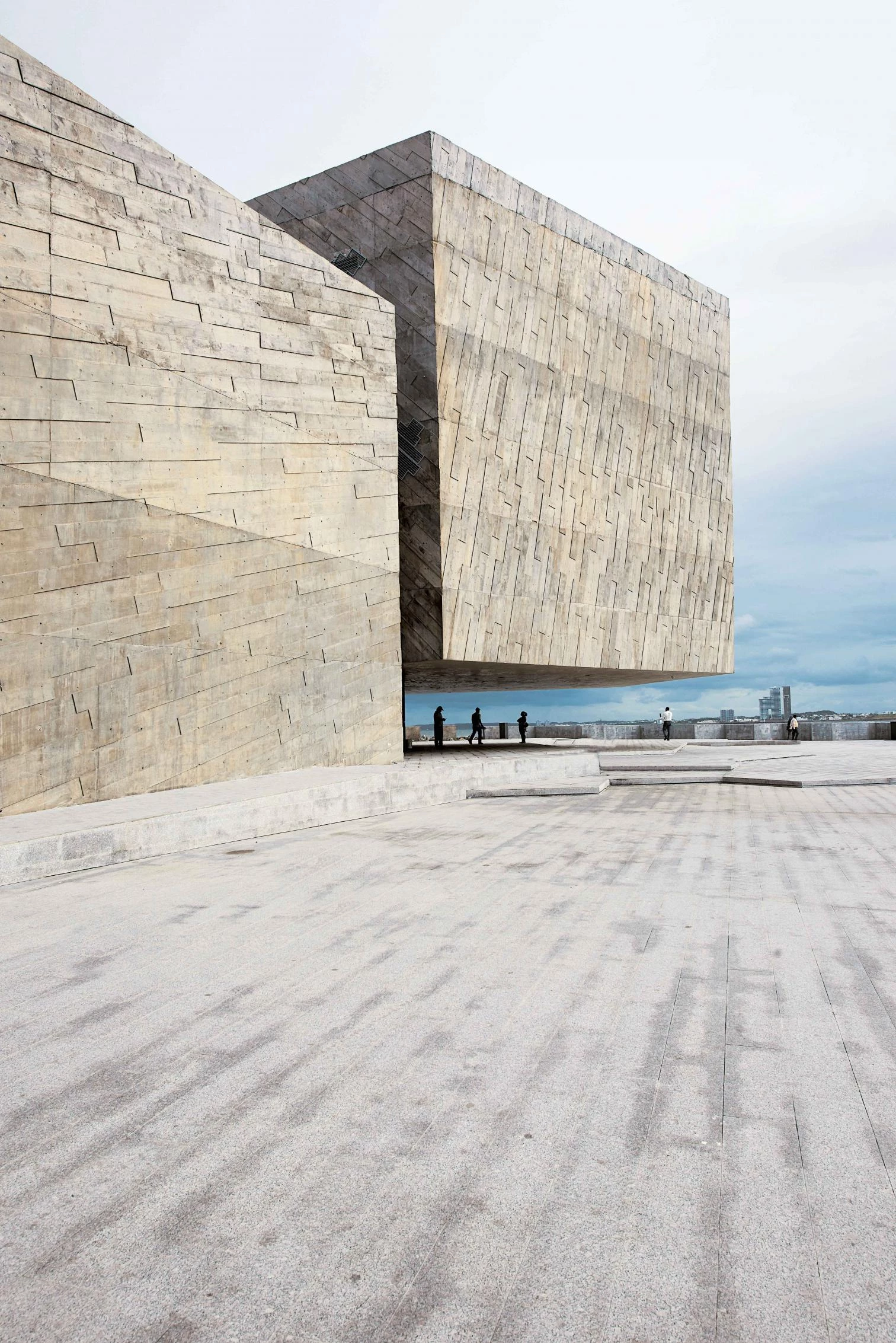 Born out of desires to connect the historical center to the coastal avenue along which the building rises, the project involved raising a series of bold concrete volumes arranged in a seemingly random way. This arrangement, thanks also to the diagonal texture of the facades, evokes the timeless image of the cement cubes that form the breakwater; and it allows addressing an ambitious program that includes a concert hall for an audience of almost 1,000 people, a versatile rehearsal hall that can seat 150, several recording studios, an area reserved for offices, a library, several cafés, a restaurant, a terrace offering views of the river and the sea beyond, and a public outdoor space thought out as an extension of the access square throughout the breakwater zone.