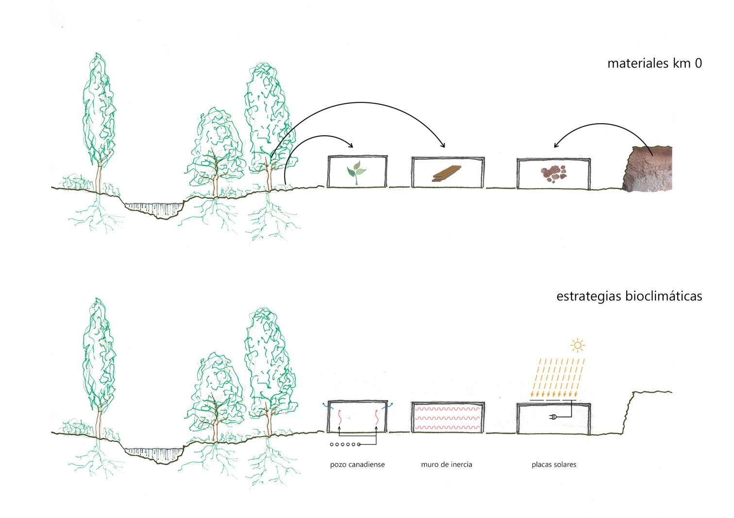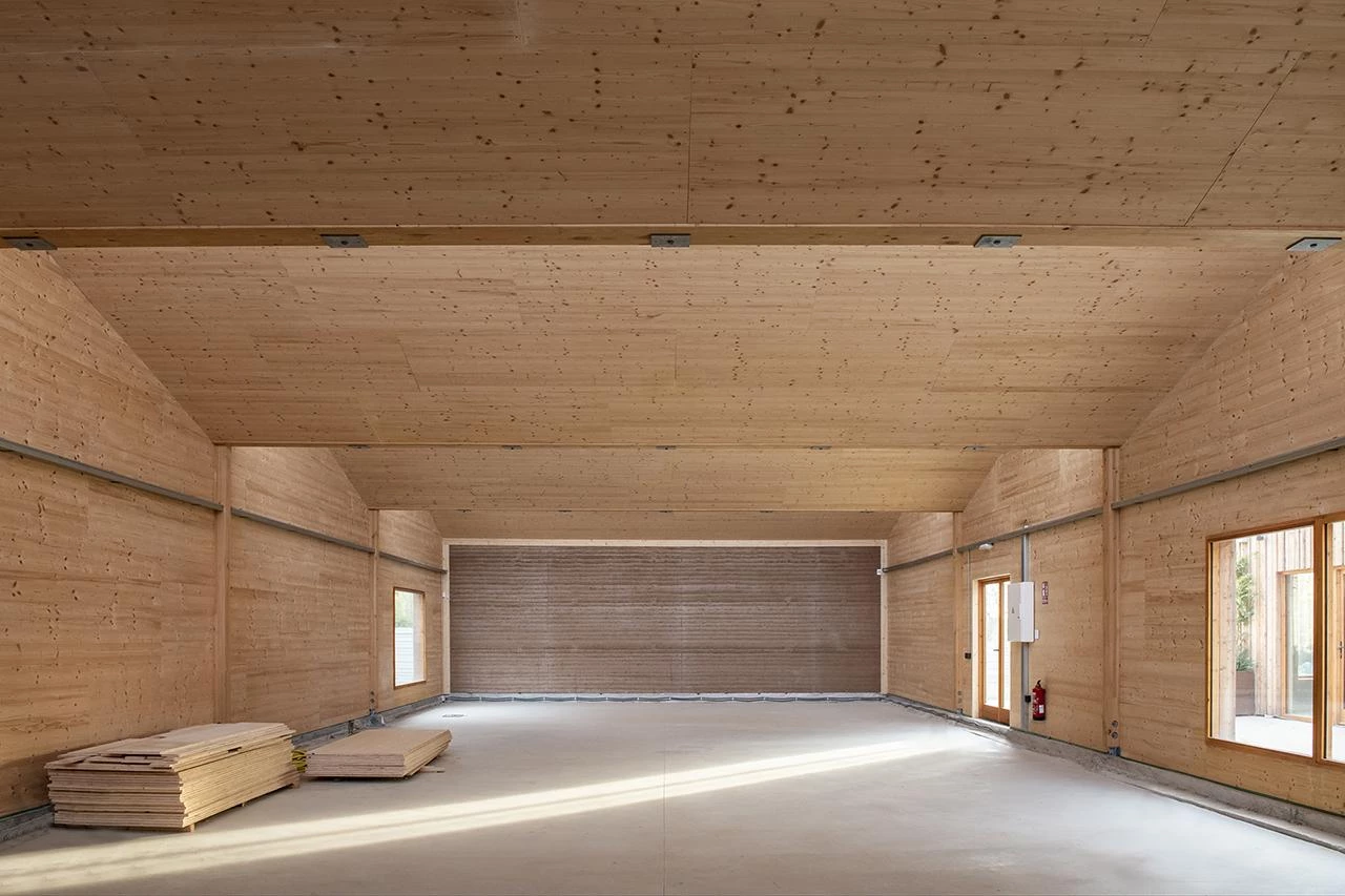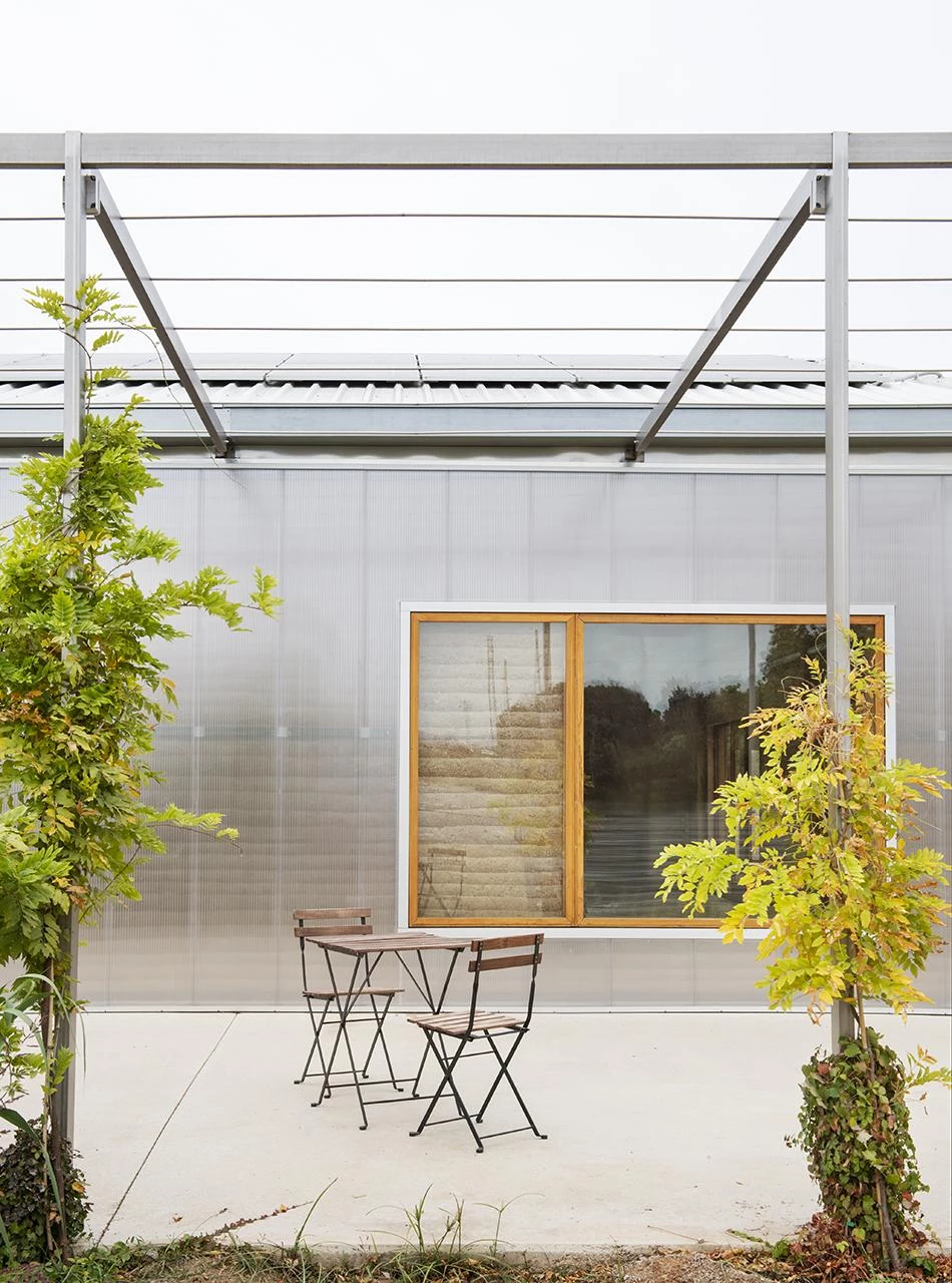 The materials used are natural and locally sourced: prefabricated wood and earth from the landslides of the meander of the river Congost, applied with the mud-wall technique that has practically disappeared from the area. The walls are insulated with cellulose injection. Incorporating photovoltaic panels, the dry-construction sheet-metal roof is reusable, as is the polycarbonate-and-glass enclosure. The building is air conditioned and ventilated through passive strategies, taking advantage of thermal inertia and plant skins. A Canadian well system with a buried collector captures air, tempers it, and releases it through grilles onto the floors.