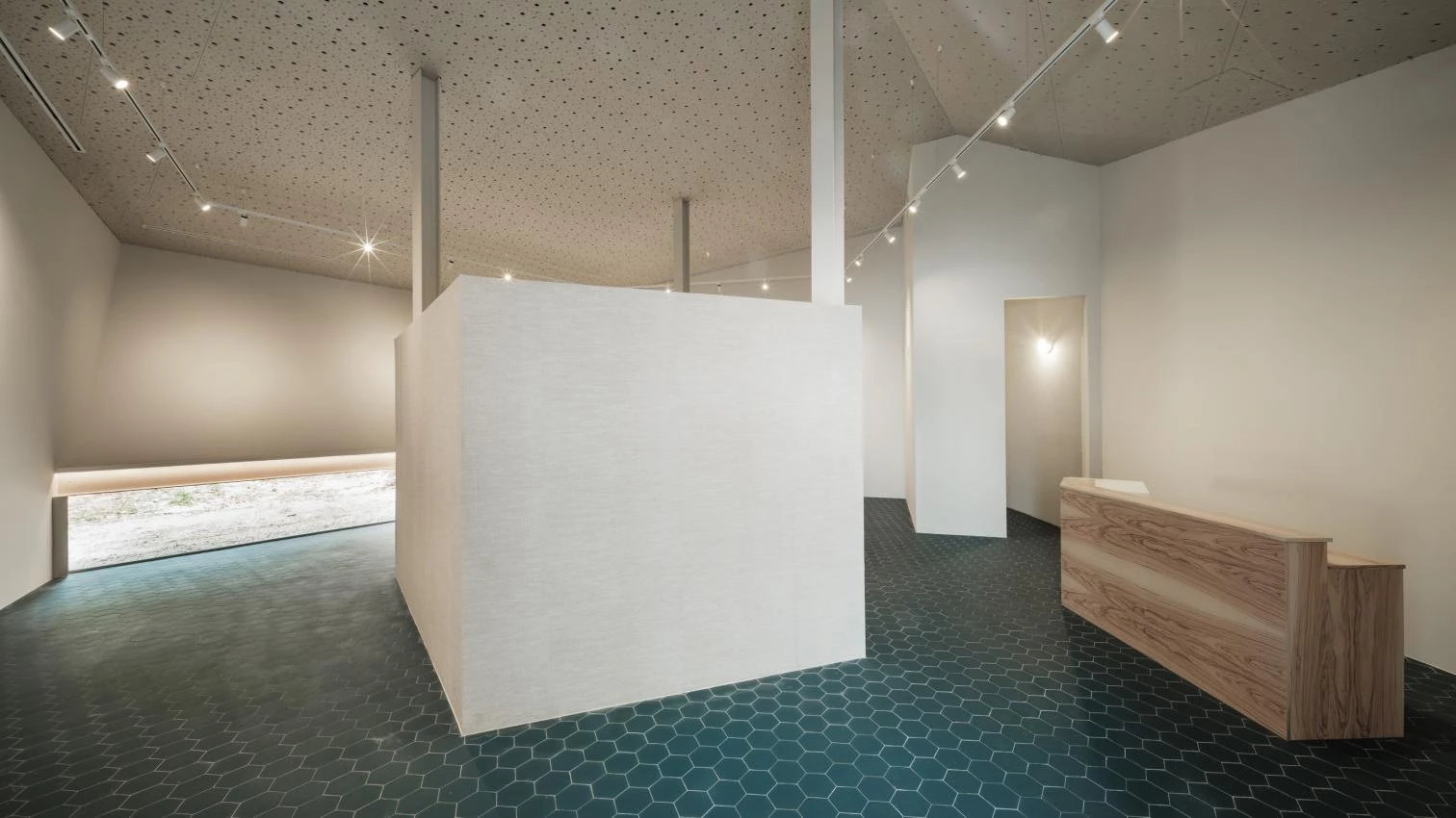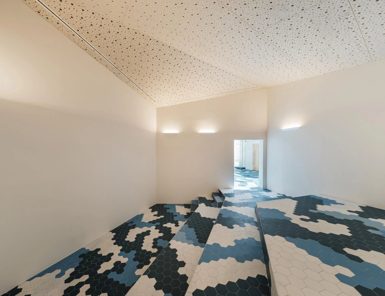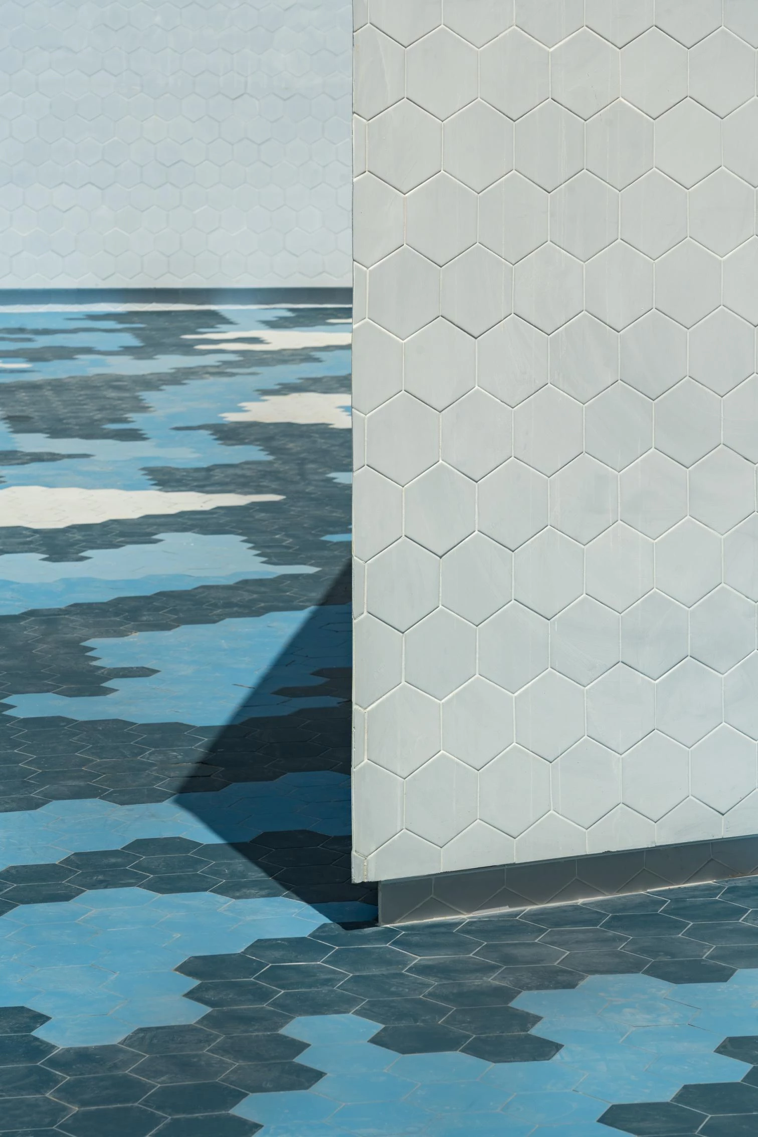 The building’s structure is executed with prefabricated steel portal frames. The three monoliths multiply the joints, using the complex geometry of the hexagon. The joints are thus hidden, giving the impression of a smooth, uninterrupted finish. The exterior cladding is composed of hexagons of ceramic stoneware handcrafted in white. The pavement simulated the sea with the water flowing between the ‘rocks,’ surrounding them in swirls, using the same hexagonal ceramic stoneware pieces in three different blue and white tones. A meticulous plan involving 26,000 pieces was developed to obtain the desired effect.