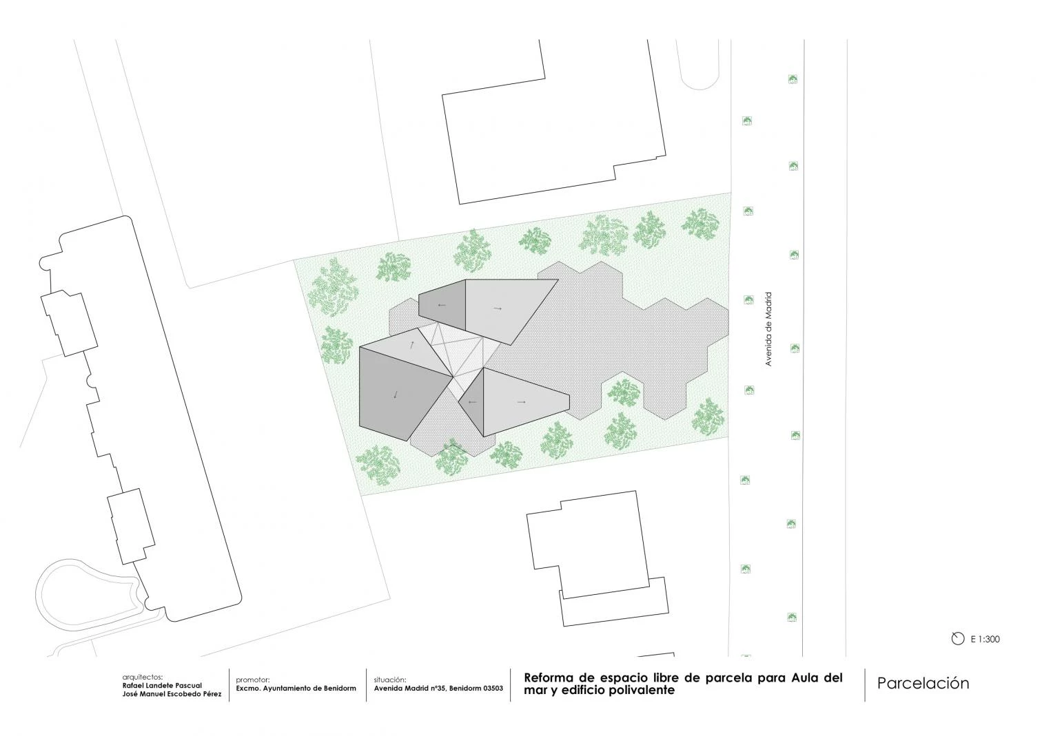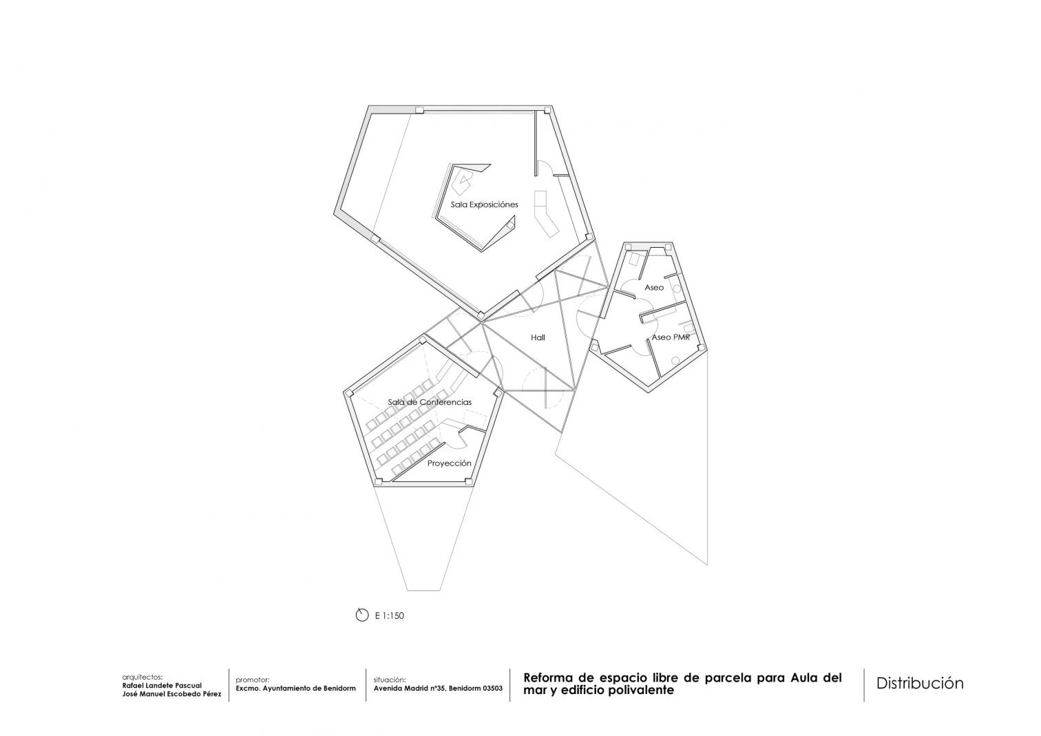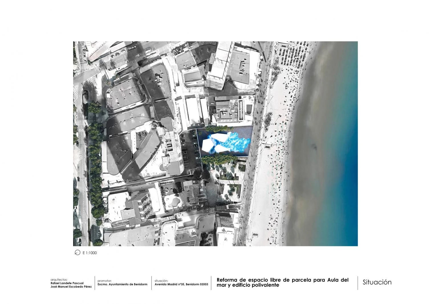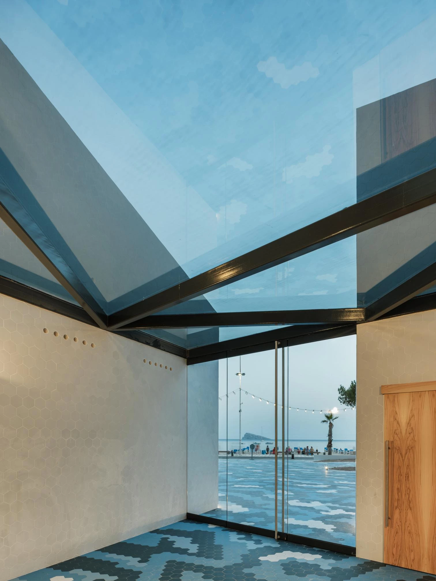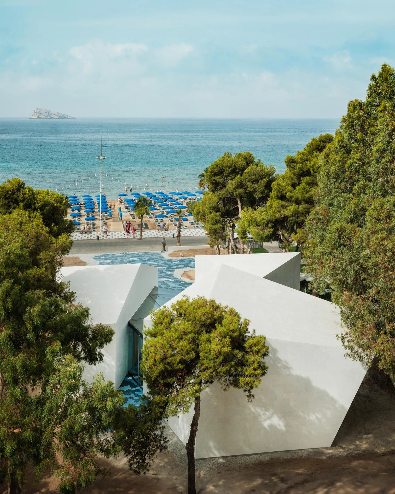 The aim of this project located on the Levante beachfront is to foster environmental awareness and publicize the seafaring history of Benidorm. The three different volumes – projection room, exhibition gallery, toilets – are like three rocks bathed by Mediterranean waters, connected by a light steel structure, rectangular in shape, that forms an irregular roof.