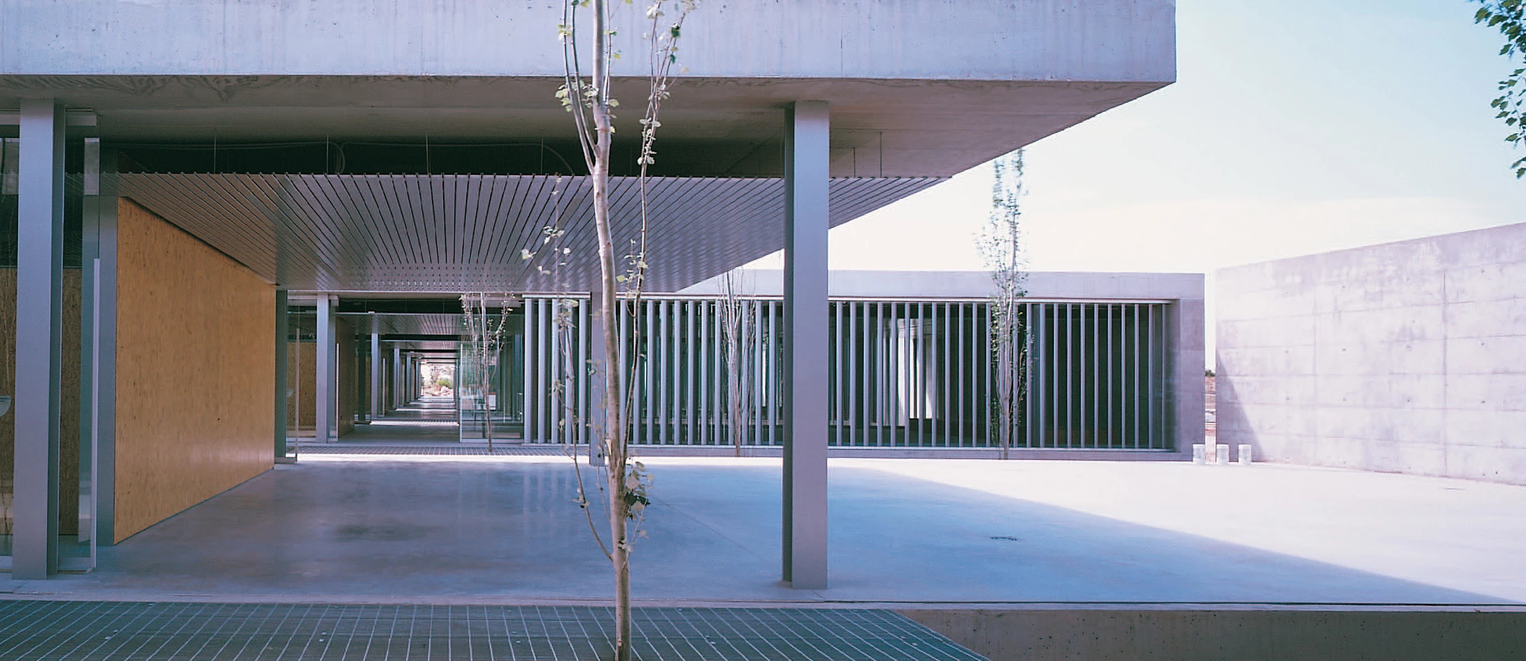 The selection of all the technical and constructional solutions responds to the haste imposed by a six month deadline. Except for the aluminum profiles that make up the suspended ceiling, the locksmith and carpentry details were made in workshops from conventional wood and metal elements. The austerity of these basic masonry volumes contrasts with the playful and ever-changing effects of the aluminum vertical slats that protect the large openings from the sun, and the oriented shavings plywood cladding that encloses the service and office cores.
