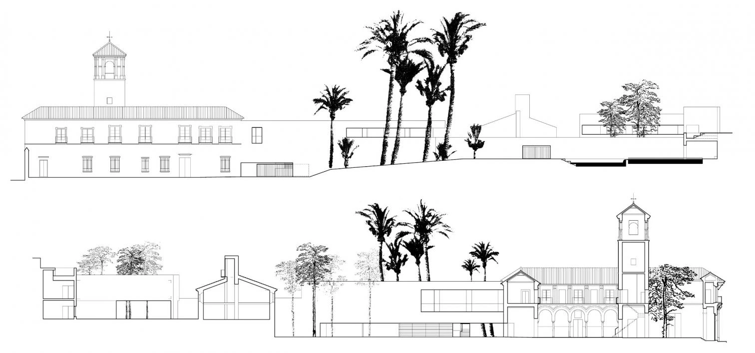 As the starting point of an intervention that maintains the existing structure of courtyards and extends it to the new construction, all the additions that had no traditional value were demolished and the garden of the estate was transformed into a park. The wooden frameworks and the Arabic-tile sloping roofs of the old buildings have been preserved, and a white finish has been chosen for the new ones. The manor house area, with a Baroque facade on to the Town Hall square – the segmental arch below the balcony is maintained as main entrance – serves the more public functions, stressed by the presence of two courtyards. The first one of them, presided by a fig tree, acts as an outdoor lobby, leading to the public service office. The second courtyard, accessed from the first one going through a lookout tower, is the courtyard of the manor house itself: delimited by semicircular arches over marble columns in the north end, and by an crenelated wall in the south, it is surrounded by offices and a meeting room. The upper level of this area is linked to what used to be the keeper’s house, opposite the side entrance, which now houses the local police offices.