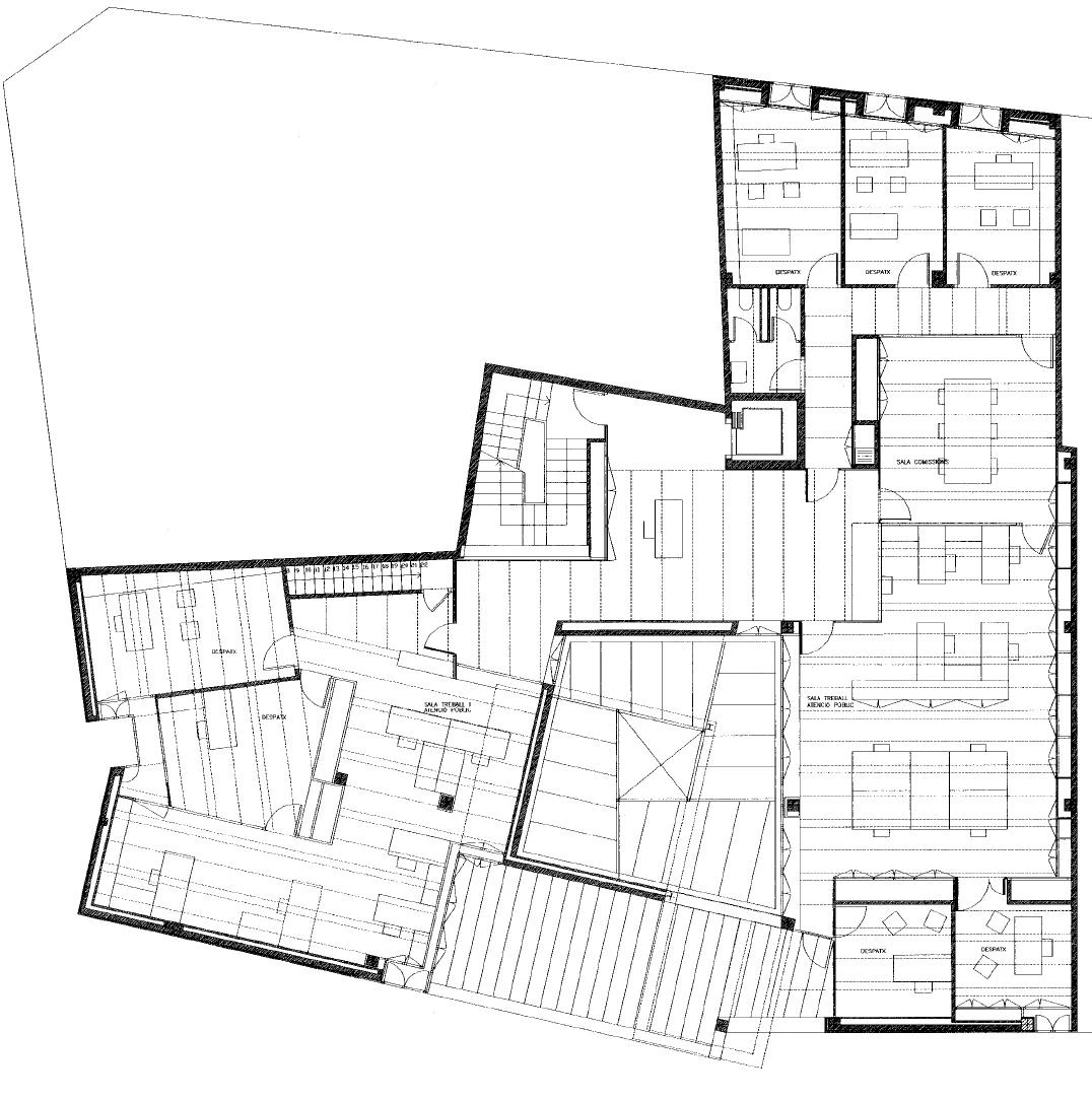 In response to the dense built fabric of Vilaseca’s urban center, the project aimed for an unconflictive extrapolation of the order of the original facade, which already bore those elements identified with public buildings, such as the balcony or the grand main entrance. The traditional composition of the elevation, based on the alternation of moderately sized solids and voids, generates the exterior image of the new construction and facilitates its integration into the town fabric. A courtyard of generous dimensions situated at the gravitational center of the floor plan ensures the natural illumination and ventilation of the building’s hub, and assumes, at ground level, a role resembling that of a plaza or meeting place. This court became increasingly important in the course of the design process, to the point of determining the volumes surrounding it; there is a setback, for instance, at the top of the main facade. Visible from the church square, at a higher grade than the town hall’s ground level, the volumes are handled with the freedom that their independence from the original facade allows, emphasising their sculptural qualities.