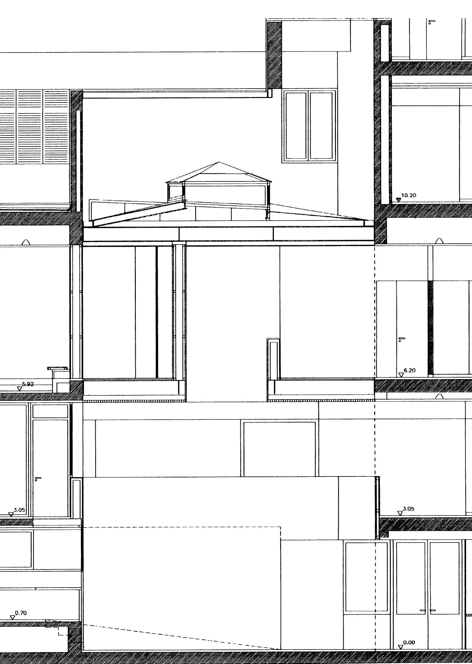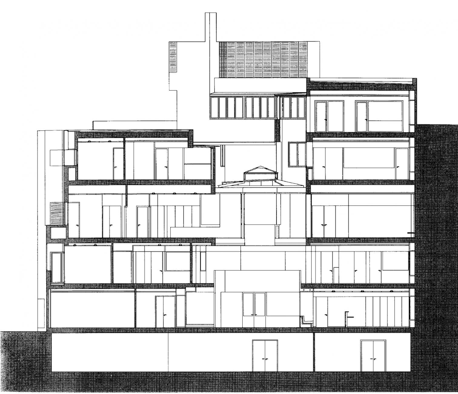 A covered courtyard ensures the lighting and ventilation of the nucleus of the building. The volumes which define it seem to be treated with the independence allowed by their being set back from the main facade.