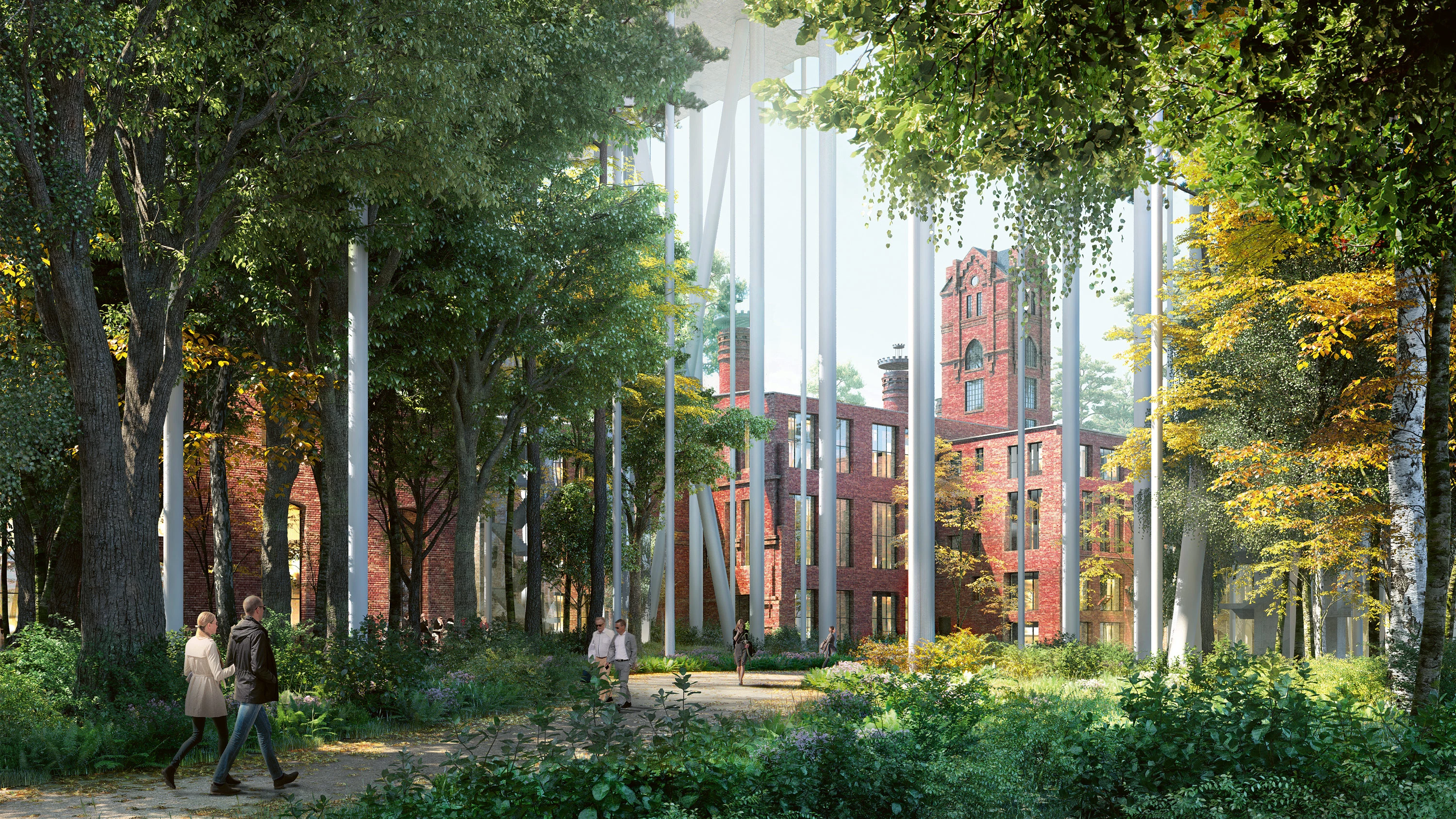 The project to revitalize the factory buildings follows a double strategy of renovation and extension. The protected structures are recovered and assigned new uses, and the rest is cleared to create a new green area, an urban park by the river... [+]