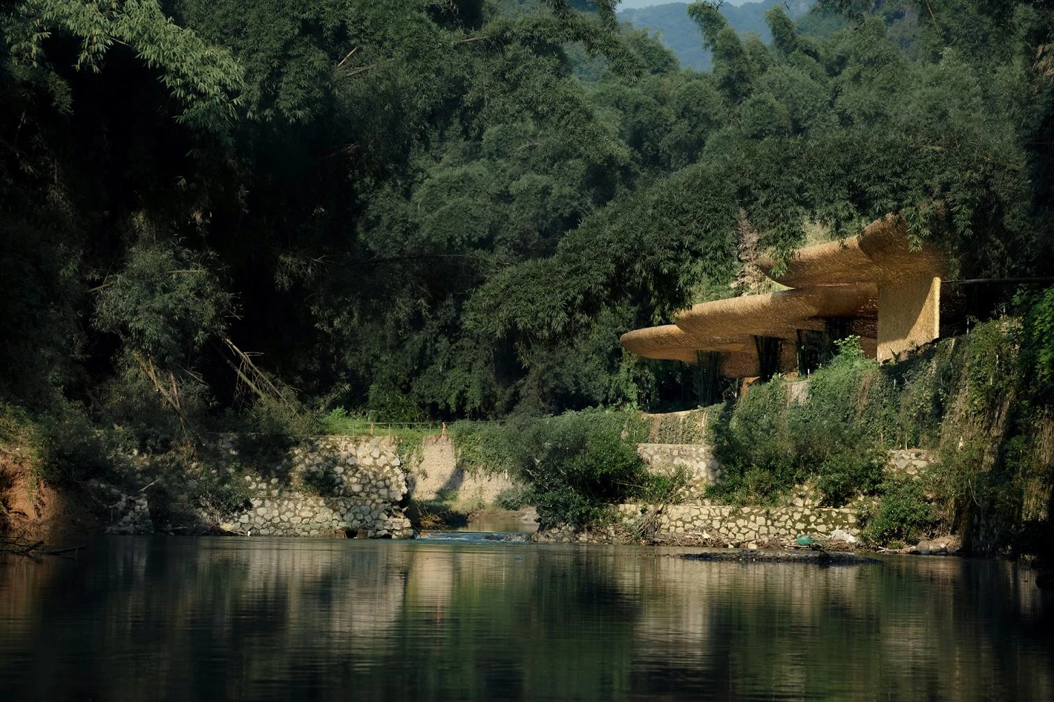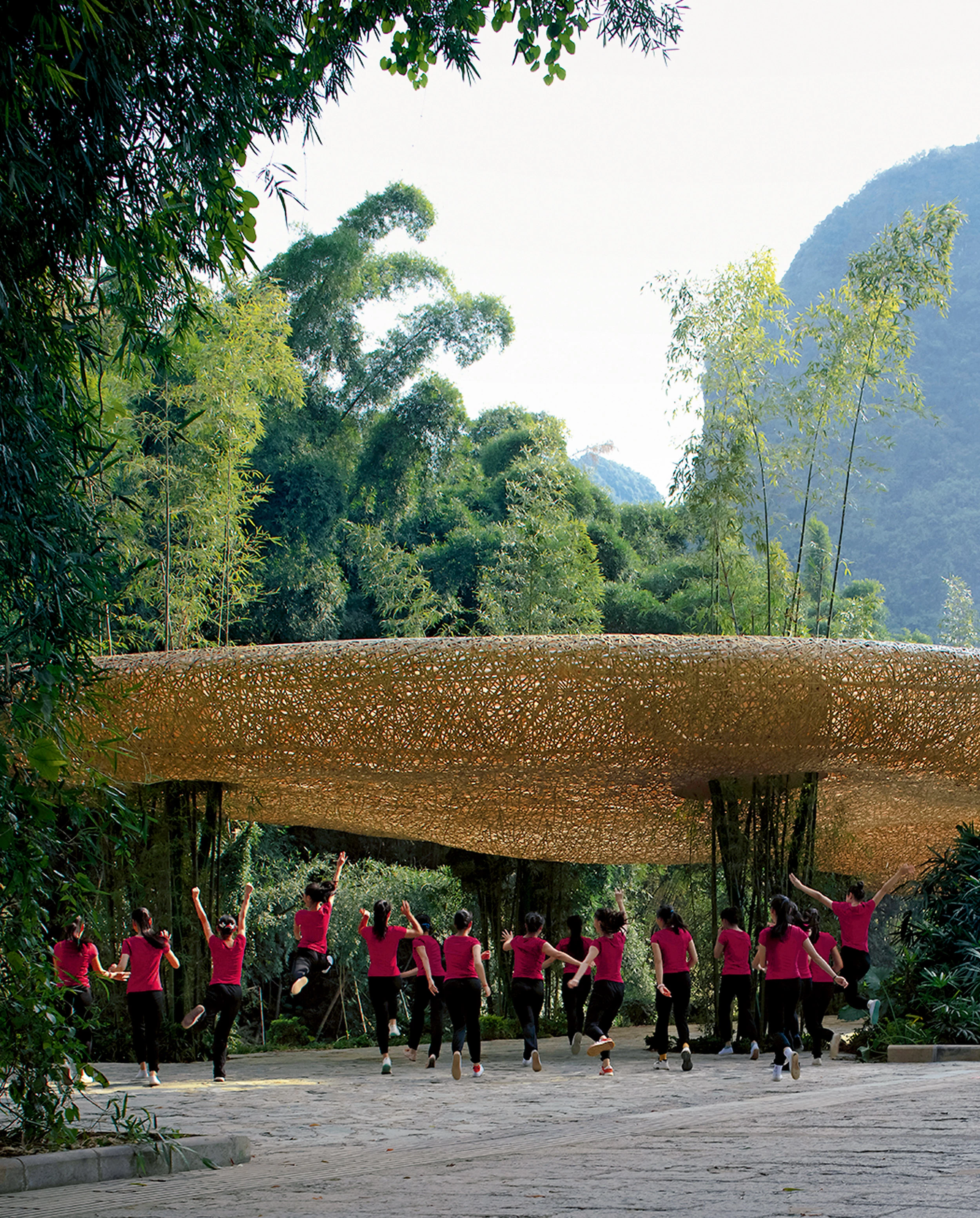 From the entrance to the performance area, visitors have to walk half an hour downstream, passing beneath a series of pergolas built along the way that provide protection from sudden subtropical rains. Reeds braided in organic shapes by local artisans wrap a bamboo structure that minimizes supports, and form a cloud trapped in the dense foliage: a foretaste of the choreographic mise-en-scène awaiting the evening’s theater-goer at the end of the picturesque promenade.
