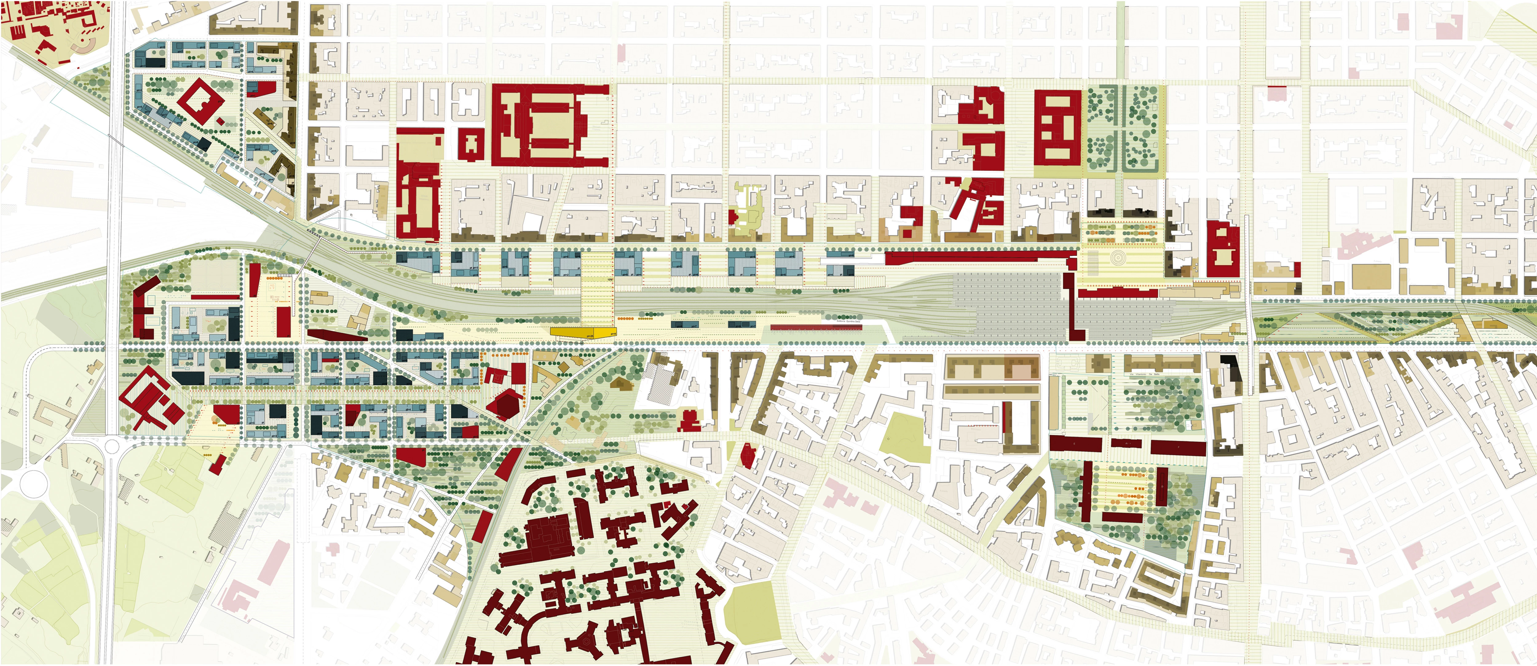 Based on the ring-park concept, the green and public spaces, overlaid to the energy and information networks, allow pedestrian mobility and connect both sides of the railway area with three urban scenographic parks and an elevated square...[+]