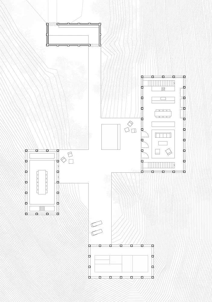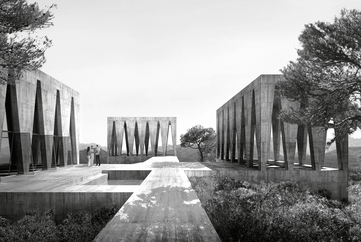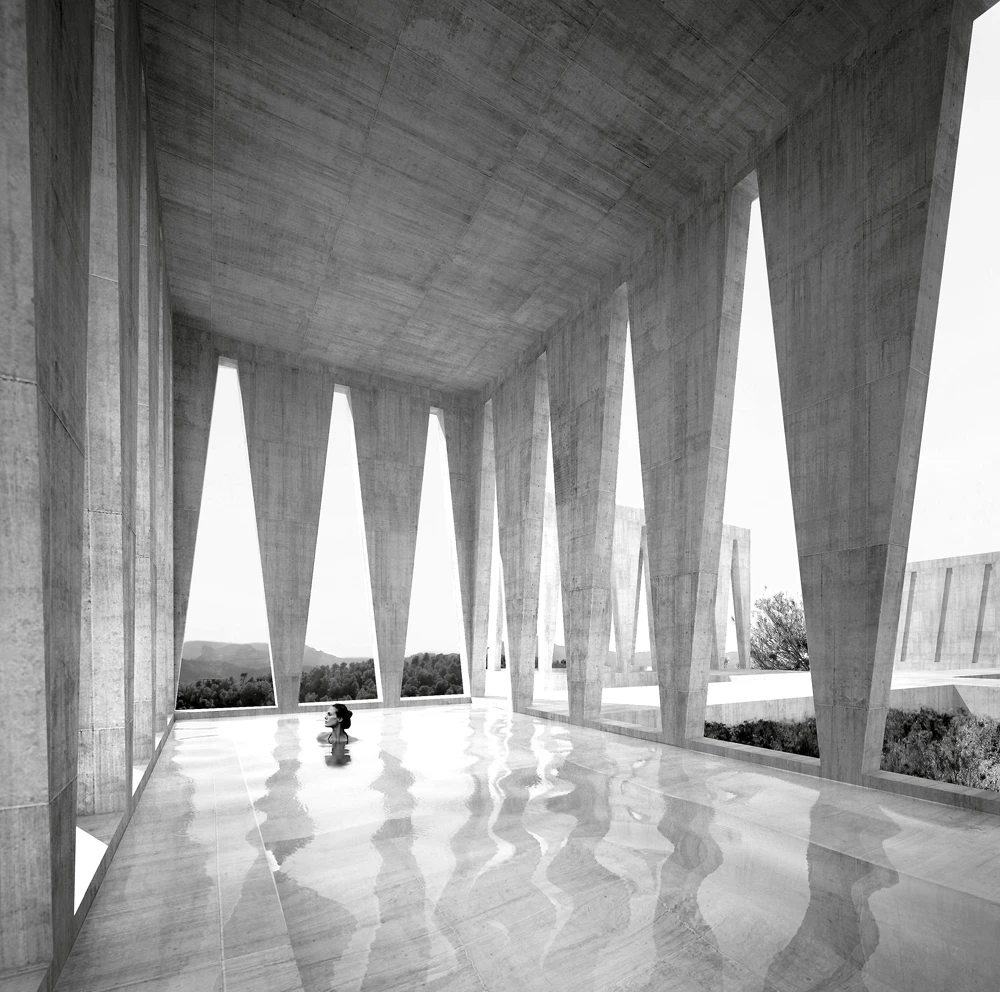 In the natural context of Los Puertos de Beceite, in the comarca of Matarraña (Teruel), art gallerists Christian Bourdais and Eva Albarrán promoted the Solo Houses initiative: a collection of architecture projects that invites visitors to embark on an immersive journey through buildings designed specifically for the place. On a south-facing slope surrounded by pine forests, the Solo House reveals a new artificial microcosm composed through the arrangement of four abstract volumes on a connecting plinth that creates an elevated platform over the slope of the plot. Each one of the four pavilions accommodates a different program, enabling a new style of inhabitation. The first one, reached from the access path through a pine forest, is the entrance pavilion with its pond, a cool and shady threshold for the house. From this point, the remaining volumes appear like cut-outs against the landscape and the horizon. The swimming pool, located to the south of the site, works with water as an architectural element. The dining pavilion, to the west, is a covered space with a fountain and a fireplace. To the east is an enclosed volume, a large space designed for daily living.
