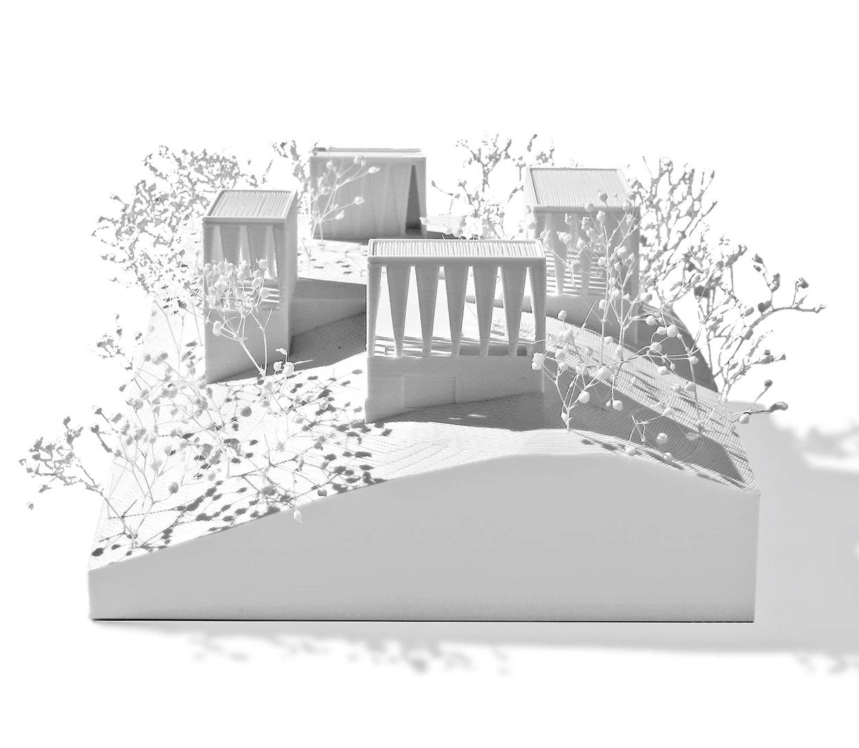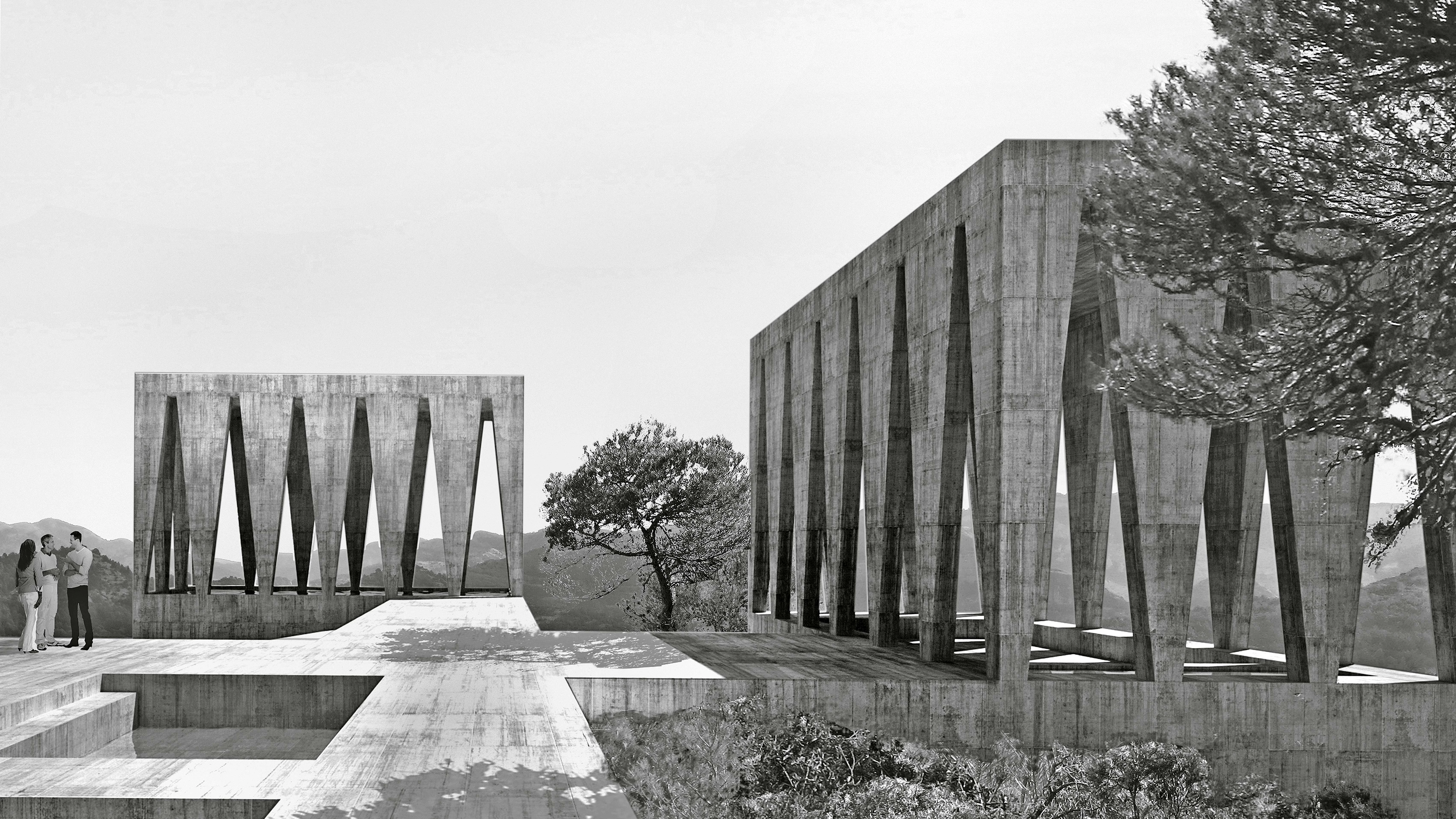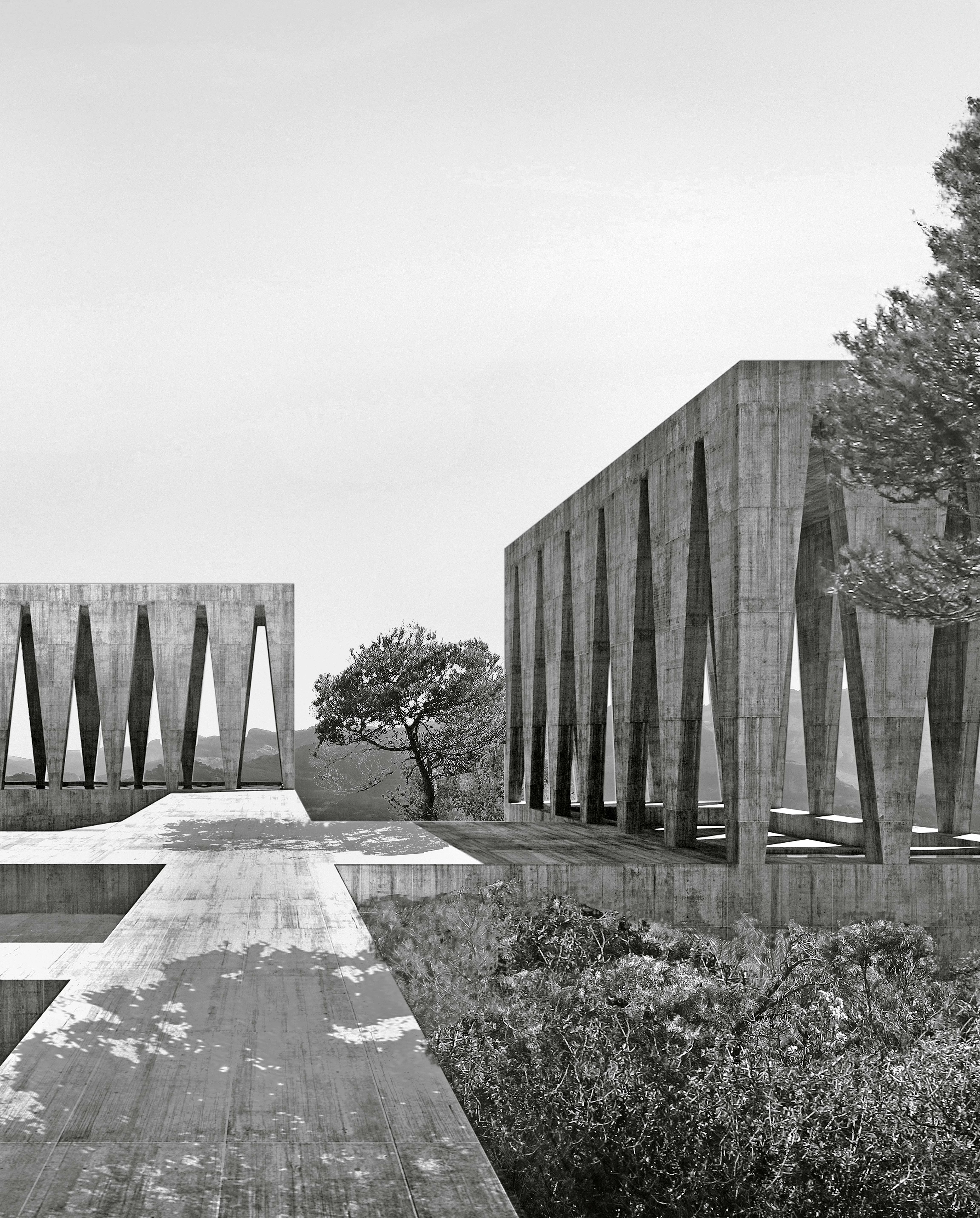 In the natural context of Los Puertos de Beceite, in the comarca of Matarraña (Teruel), art gallerists Christian Bourdais and Eva Albarrán promoted the Solo Houses initiative: a collection of architecture projects that invites visitors to embark on an immersive journey through buildings designed specifically for the place. On a south-facing slope surrounded by pine forests, the Solo House reveals a new artificial microcosm composed through the arrangement of four abstract volumes on a connecting plinth that creates an elevated platform over the slope of the plot. Each one of the four pavilions accommodates a different program, enabling a new style of inhabitation. The first one, reached from the access path through a pine forest, is the entrance pavilion with its pond, a cool and shady threshold for the house. From this point, the remaining volumes appear like cut-outs against the landscape and the horizon. The swimming pool, located to the south of the site, works with water as an architectural element. The dining pavilion, to the west, is a covered space with a fountain and a fireplace. To the east is an enclosed volume, a large space designed for daily living.