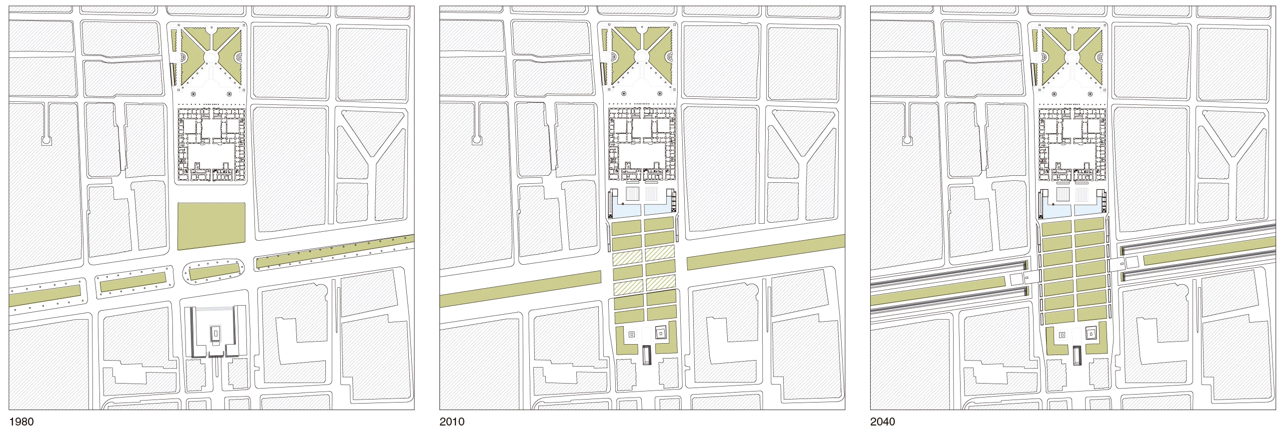 In 1995 another competition was held to remodel the south void of the palace. The result gave the studio the opportunity to complete the design for the Civic Quarter. The original project foresaw a new urban density that will allow traffic circulation below the square. This project, built partially between 2005 and 2010, involved recomposing the fragmented floor surface, creating a continuous level. The first step was to open a large terrace, adjoining the palace, which extends the building’s interior courtyards towards the public area. This new space becomes a park-plaza with a fountain where the grass is inscribed in a strict geometry with secondary paths that create a more ludic and casual promenade. To maintain a continuous circulation and the essential connection with the axis, the project proposed demolishing the monument erected by the dictatorship, a massive structure that interrupted the historic connection between the Caja Cívica and the Eje Bulnes.