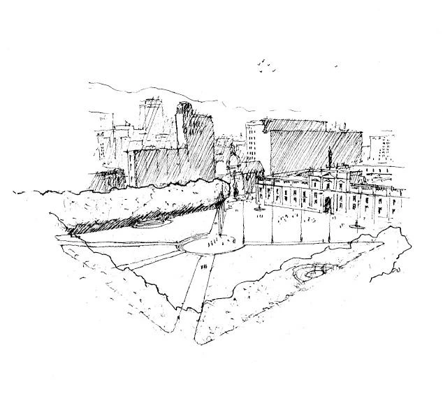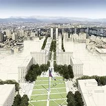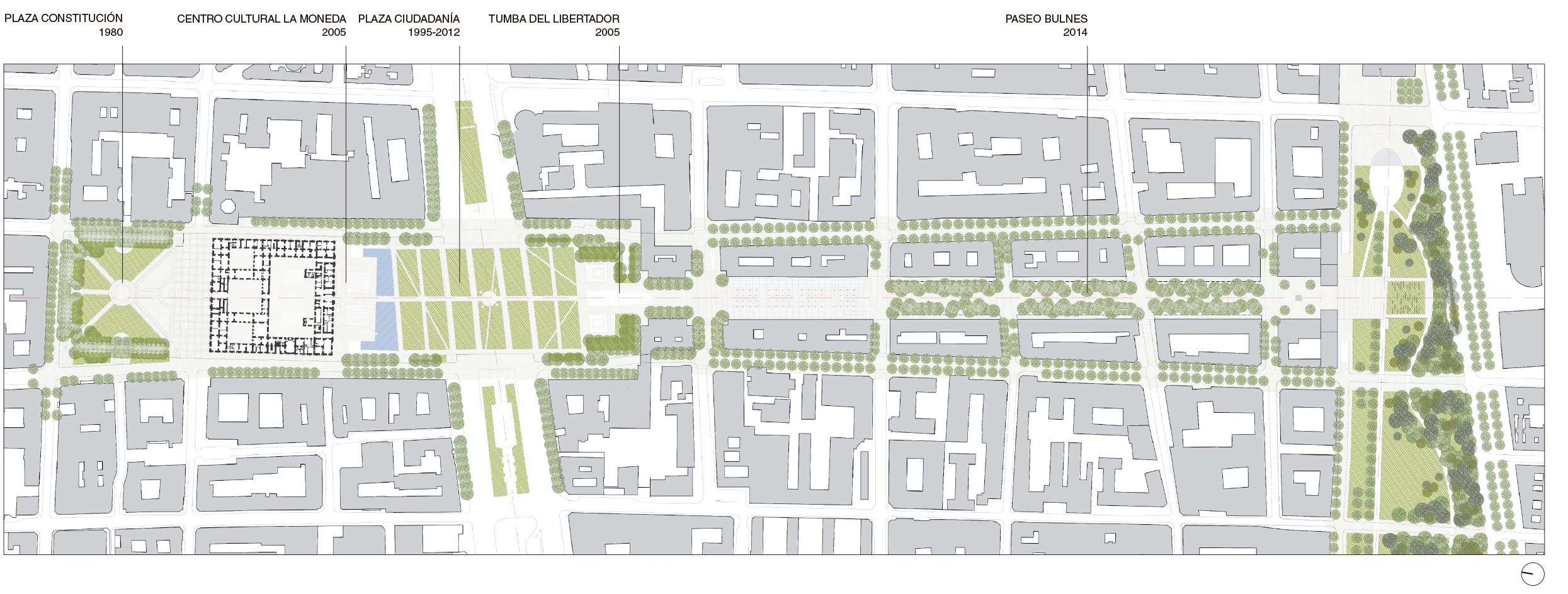 The Civic Quarter dates back to 1930, based on the proposal of Karl Brunner, who envisioned a new space around the Palacio de La Moneda, emptying the urban blocks before the building along the north and south and shaping two squares that dignified it. The project was extended southwards through an axis ending with the National Congress, never built.