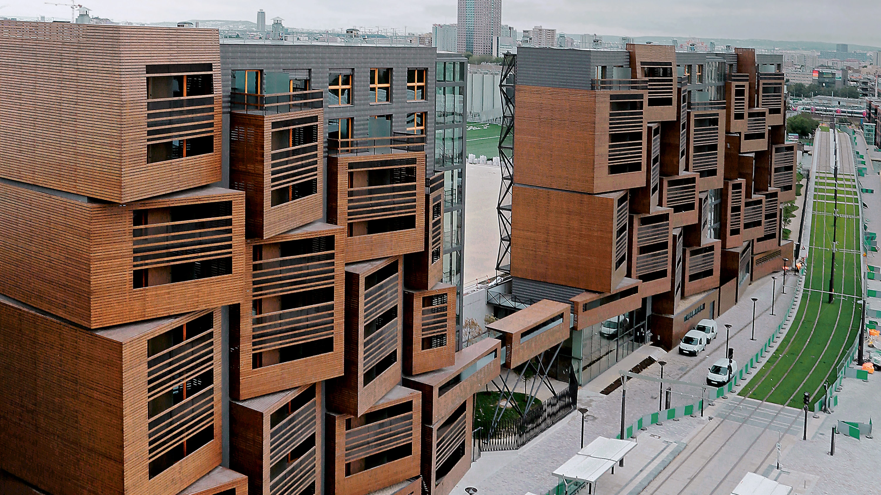 The polarity created by the double orientation of this eleven-story linear block is expressed in the geometry and the materials of each facade: the east side is like a fragmented and random combination of open wooden volumes, whereas the west side of the building, which faces La Villette park and the Eiffel Tower beyond, comes across as a permeable skin clad with metal mesh.