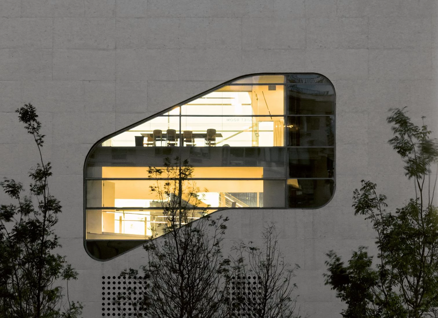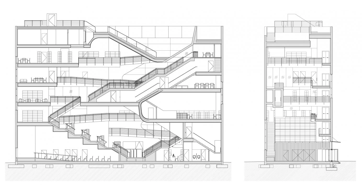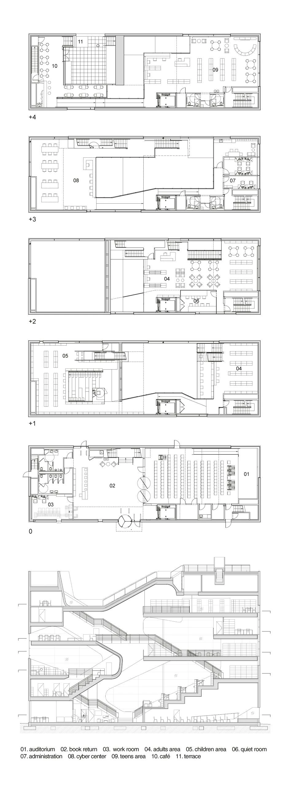 The cut-outs on the facade are determined by the building’s section, terraced around a central void, which organizes the various programs by levels and alternates the library’s different areas with meeting spaces.