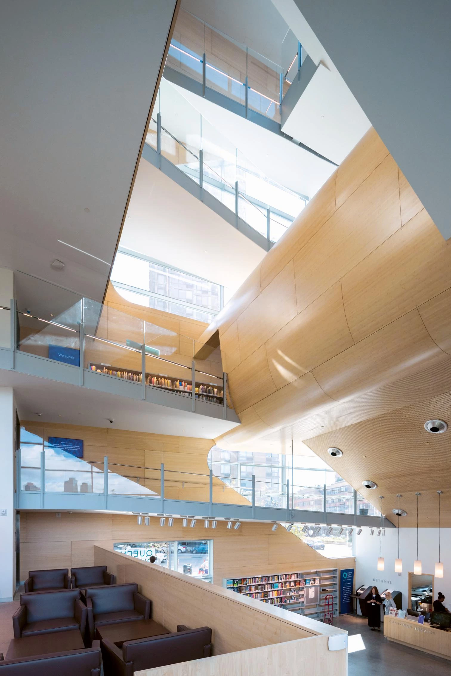 Large windows bringing in plenty of natural light and giving splendid views of Manhattan and the river, combined with claddings of laminated bamboo, create a warm, welcoming atmospere conducive to reading.