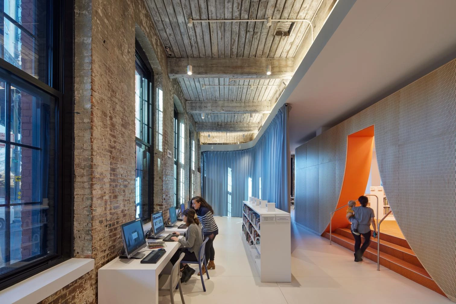 In the Dumbo neighborhood of the borough of Brooklyn, New York, right by the Manhattan Bridge, a 1901 industrial building has been turned into a library by the firm WORKac, led by Amale Andraos and Dan Wood. In a dialogue between old and new, the original wooden ceiling is visible through curved apertures, also showing the perimetral brick walls.