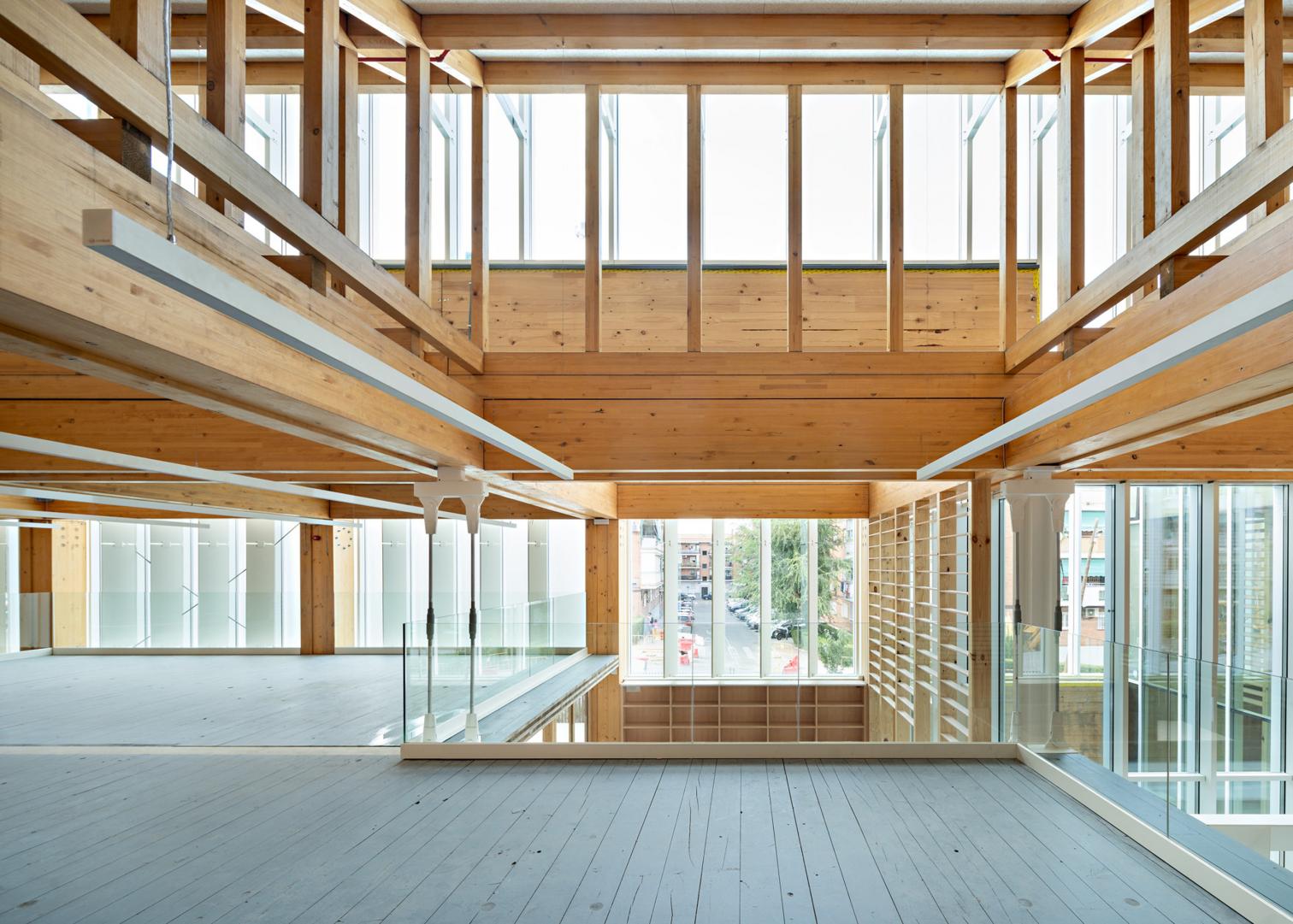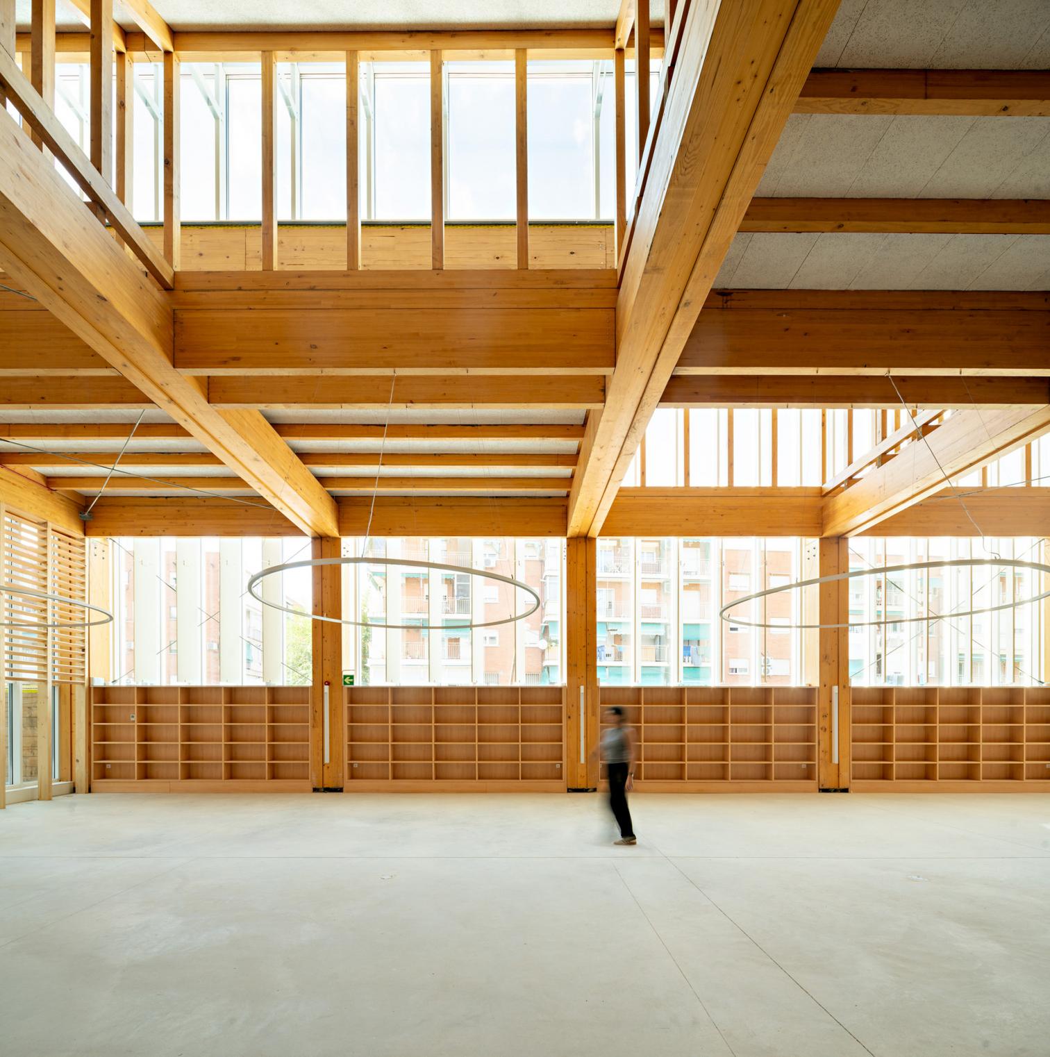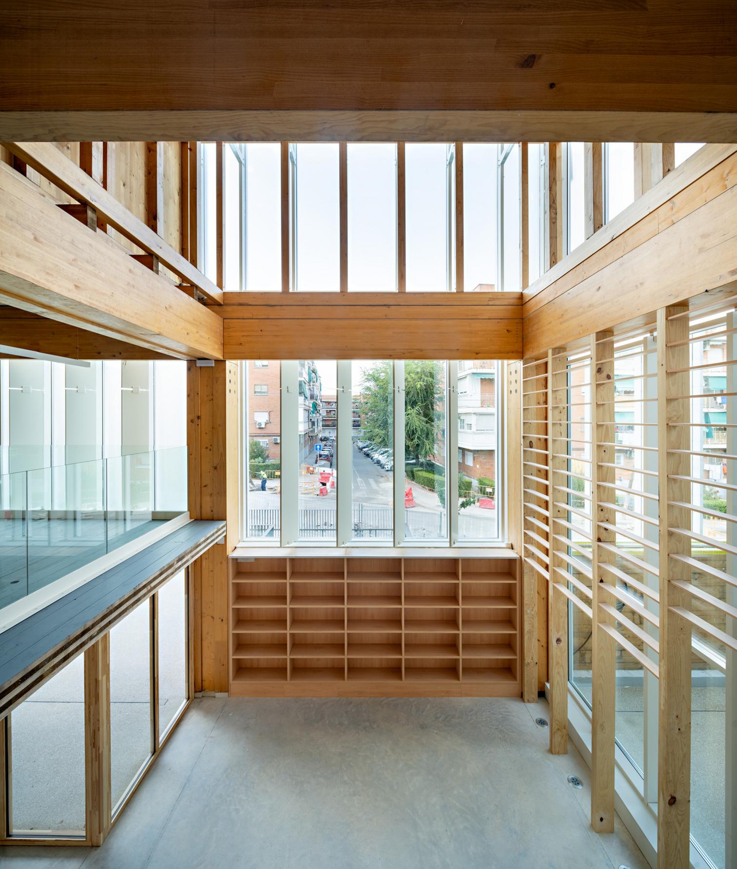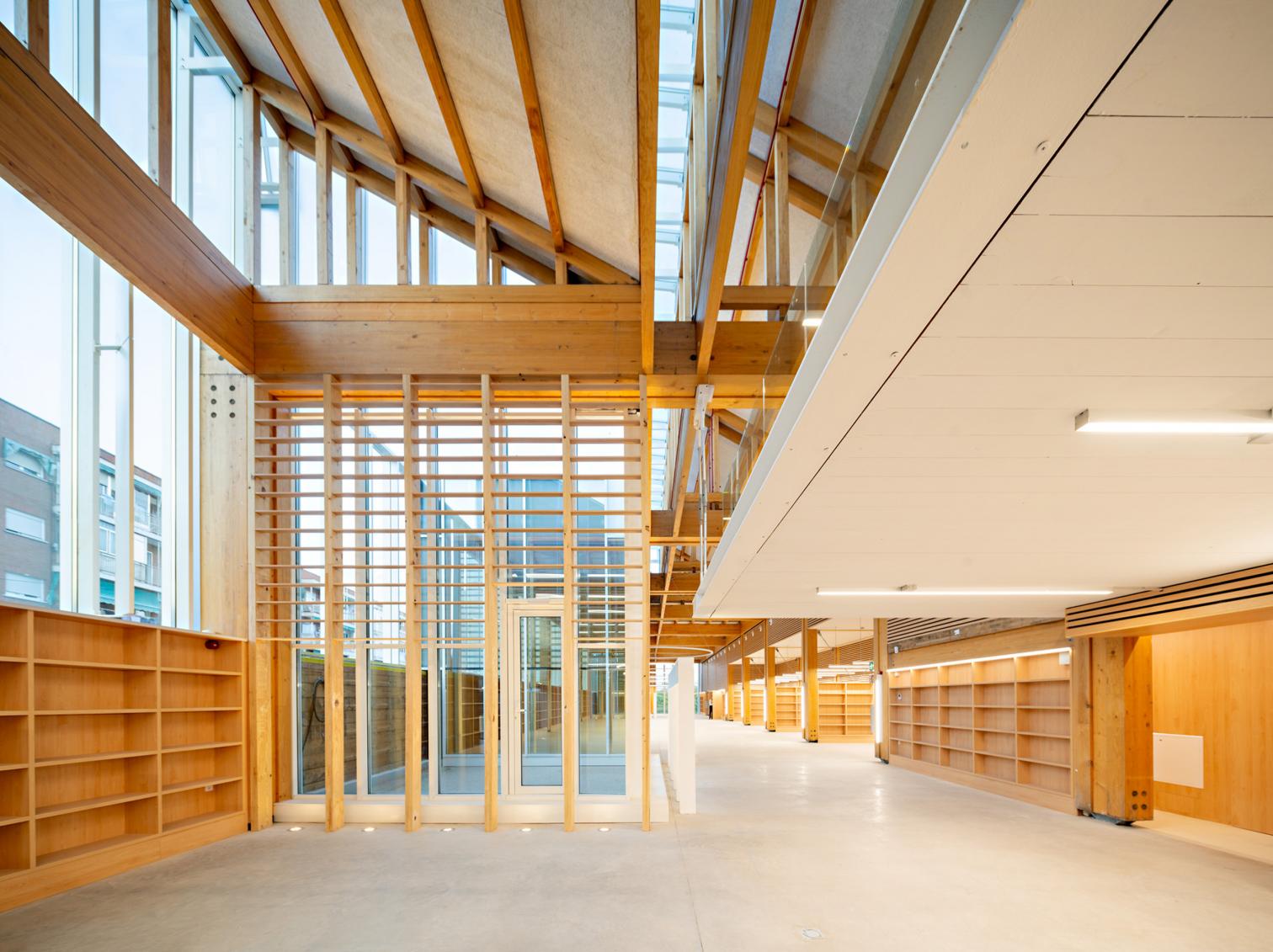 The structure combines concrete in the lower levels – where it also retains earth in a plot where there is a grade difference of 4.65 meters – with wood in the upper ones. This plant material does not only define the structure, but is also present in windows, doors, panels, ceilings, and claddings. The result is a good degree of aesthetic coherence and sustainability. The library has obtained GREEN environmental certification from the GBCe, reaffirming its commitment to energy efficiency and respect for the environment.
