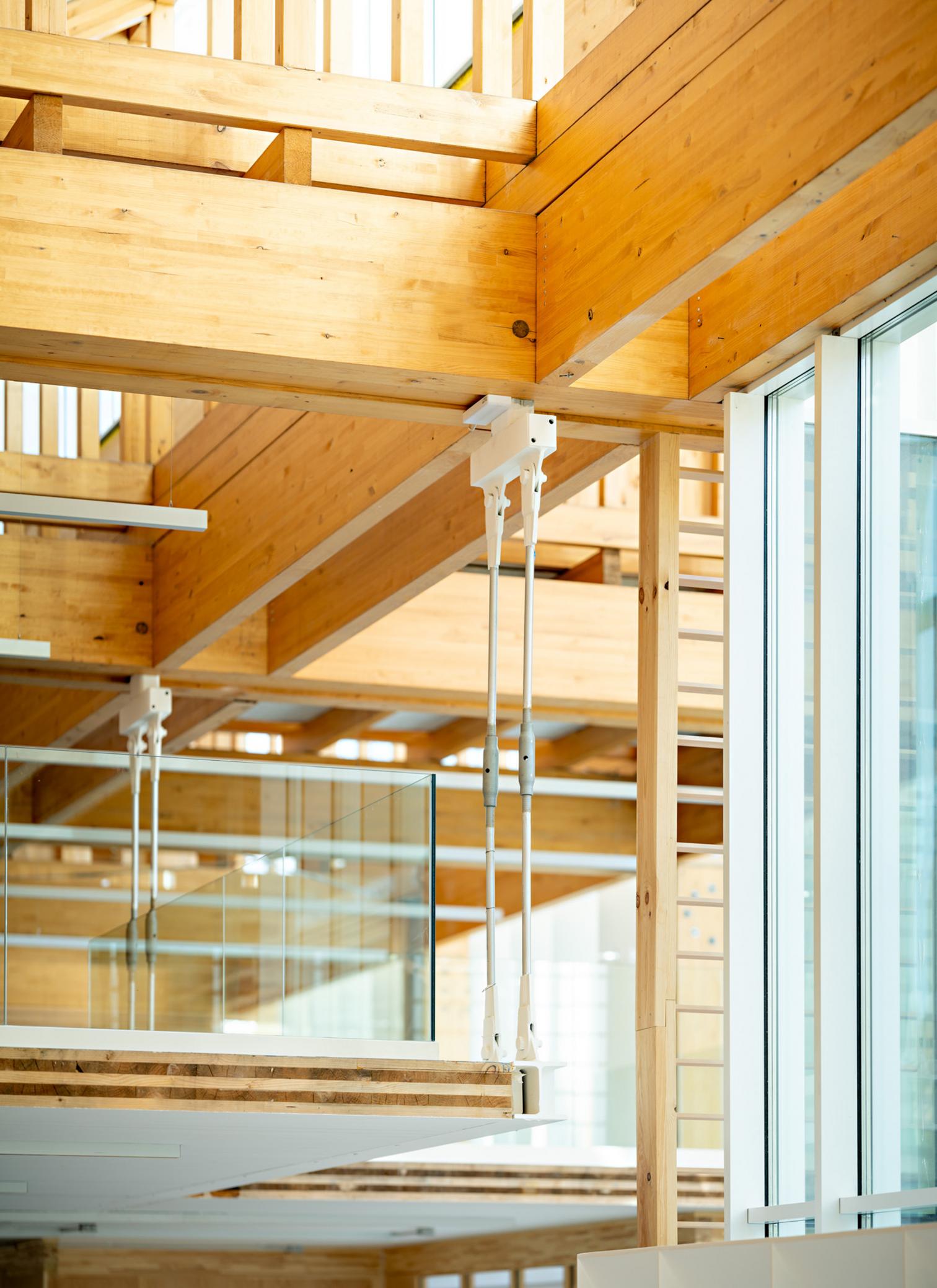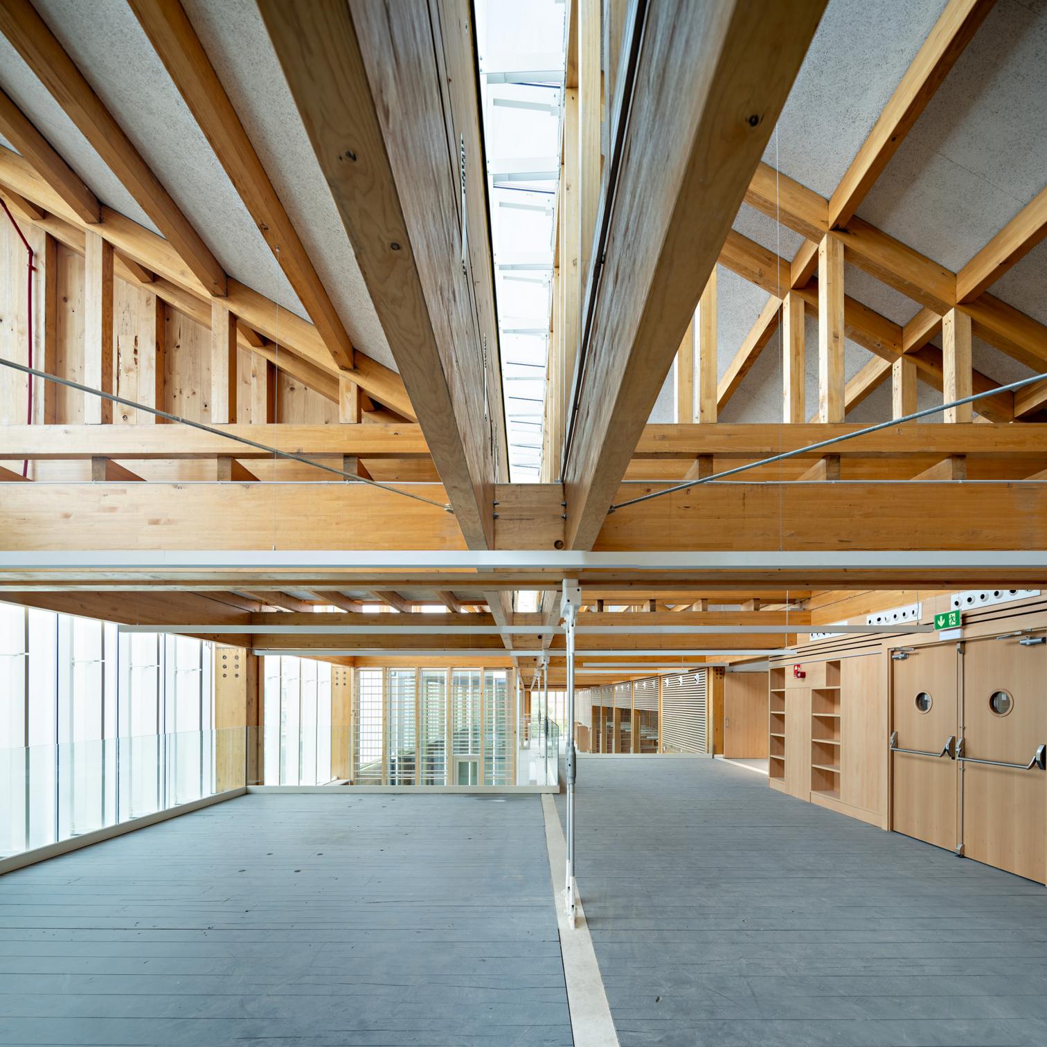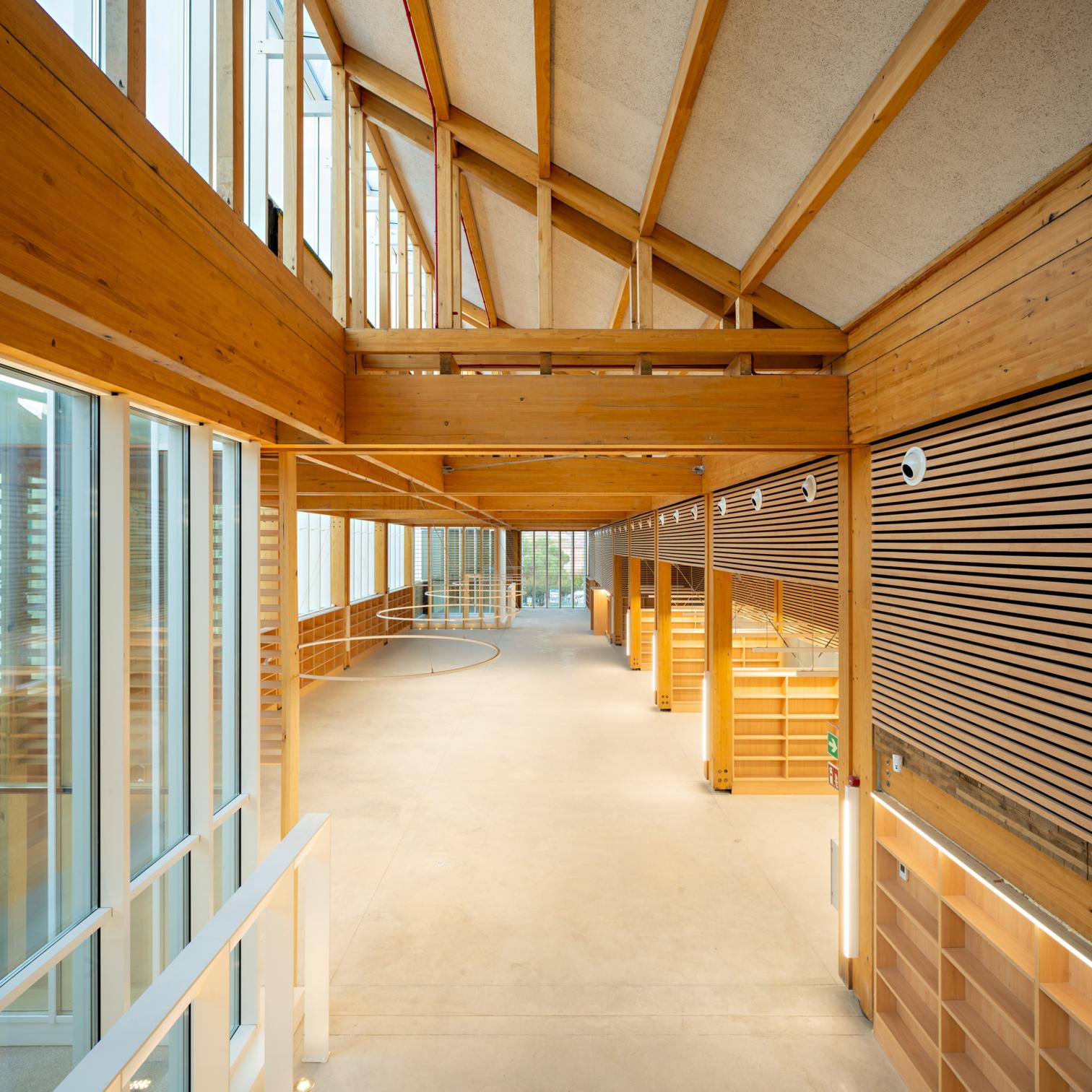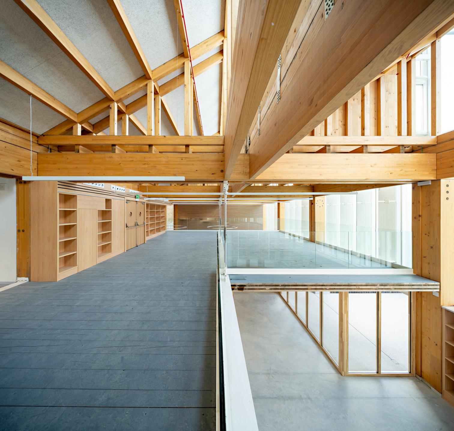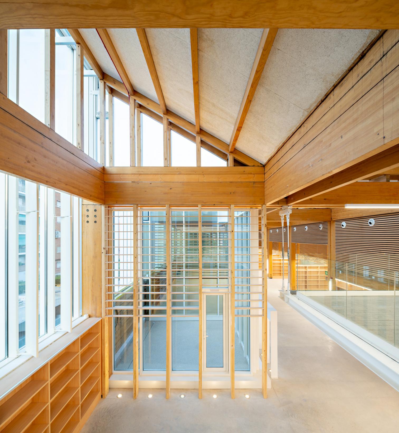 The structure combines concrete in the lower levels – where it also retains earth in a plot where there is a grade difference of 4.65 meters – with wood in the upper ones. This plant material does not only define the structure, but is also present in windows, doors, panels, ceilings, and claddings. The result is a good degree of aesthetic coherence and sustainability. The library has obtained GREEN environmental certification from the GBCe, reaffirming its commitment to energy efficiency and respect for the environment.