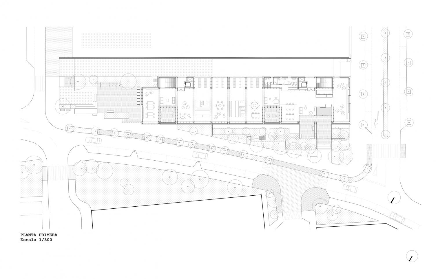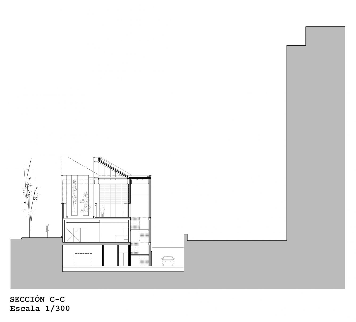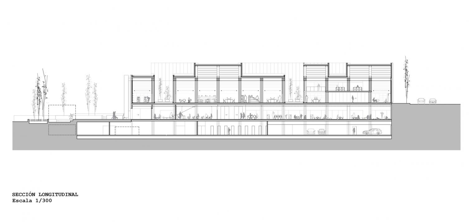 The building comes across as a prismatic volume of simple lies, clad in sheet metal that recalls old industrial constructions around. The facade on the street Calcio takes on a domestic scale, with a window acting as an urban showcase, whereas the Miguel Solás side presents courtyards, skylights, and solar protection systems that enrich the overall architectural expression.