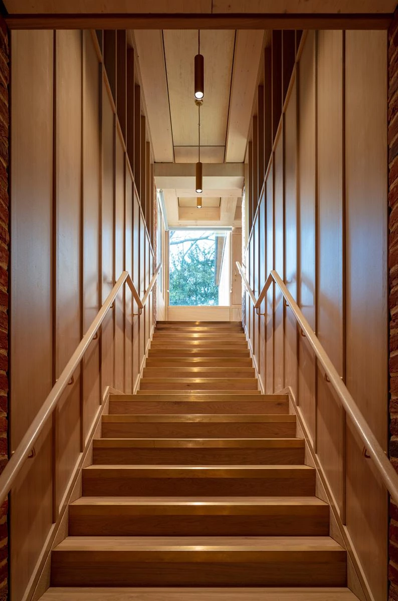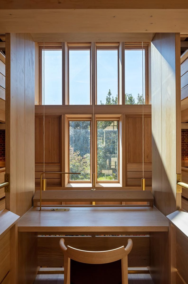 The stepped spaces present one, two, and three heights. The geometry of the skylights, which are internally clad in grooved wooden panels, floods the reading halls with a gentle uniform light, minimizing glare. Brick pillars pierce the library’s roof in shapes resembling chimneys. Generating varying degrees of openness and intimacy, the windows frame views of the gardens and the river close by.