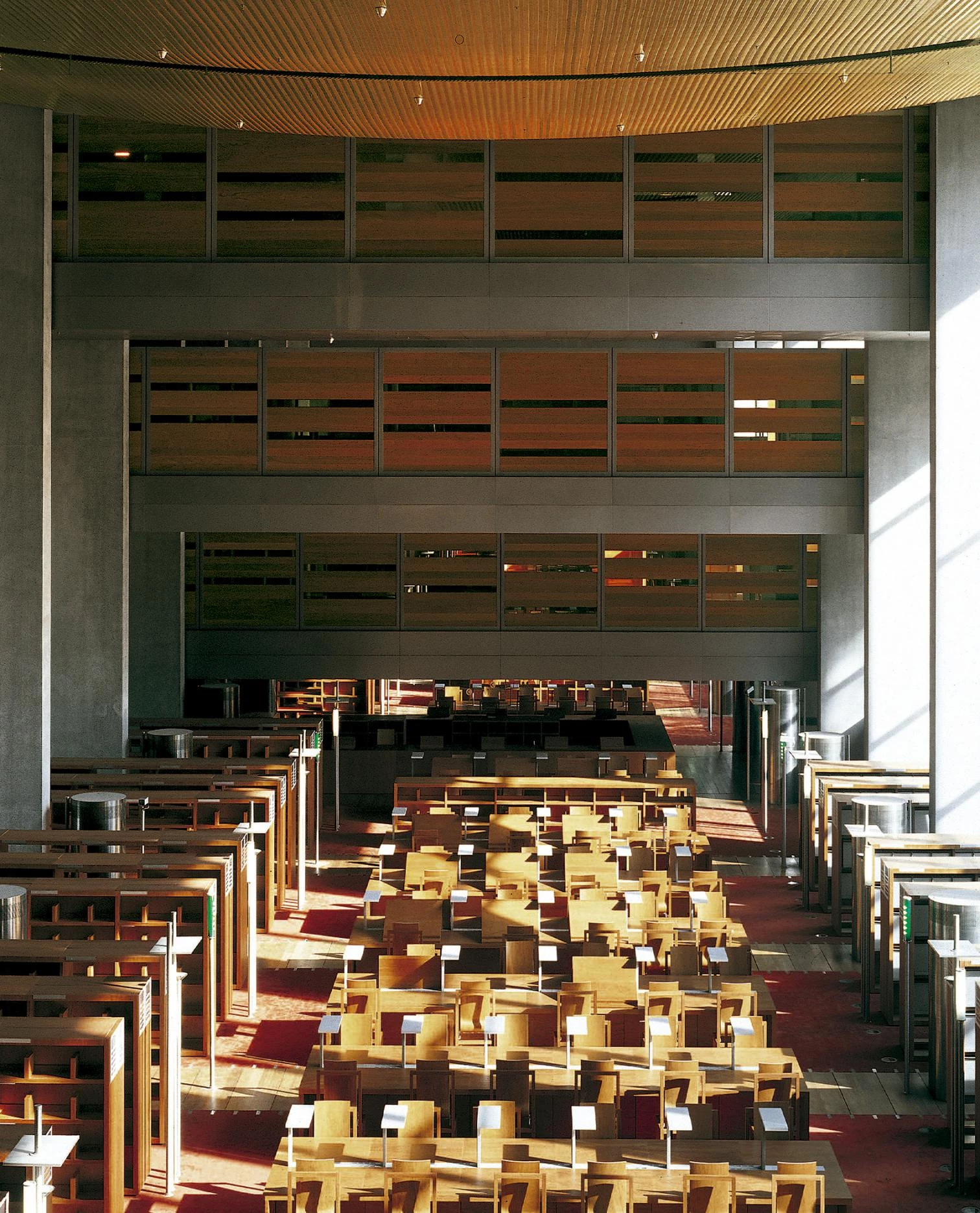 Around this garden, the specialized libraries (current affairs, audiovisual, study, and research) are arranged on several mezzanine levels within a very tall volumetric space. These reading areas are entirely glass-enclosed on the garden side, and equipped, on their outer perimeter, with a range of facilities which offer readers all the technical services of the modern world. They enjoy natural light that comes from an upper slit running along their entire length.