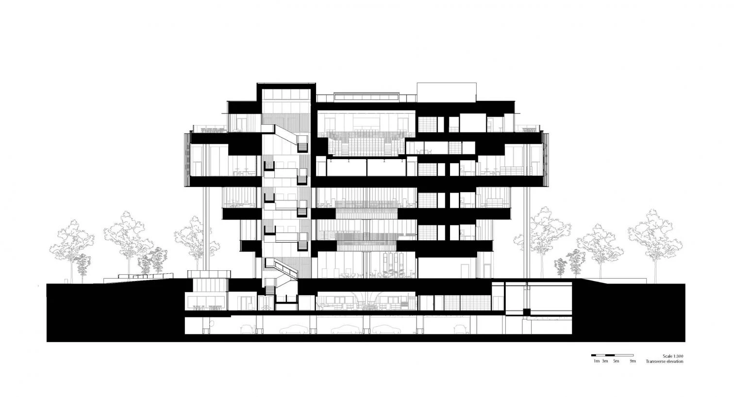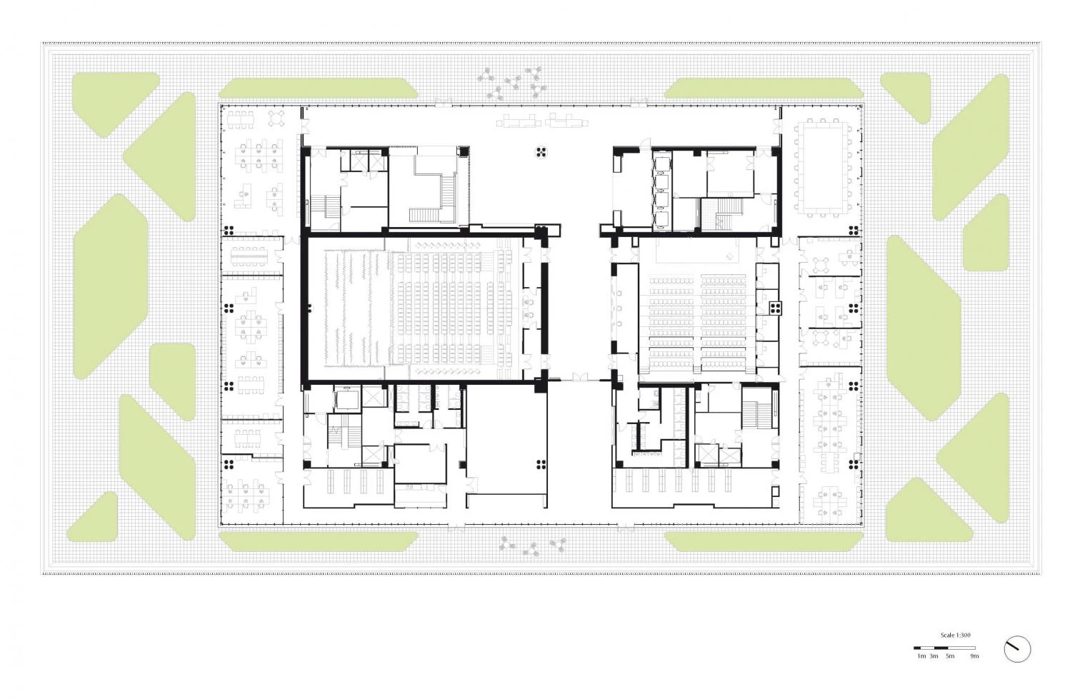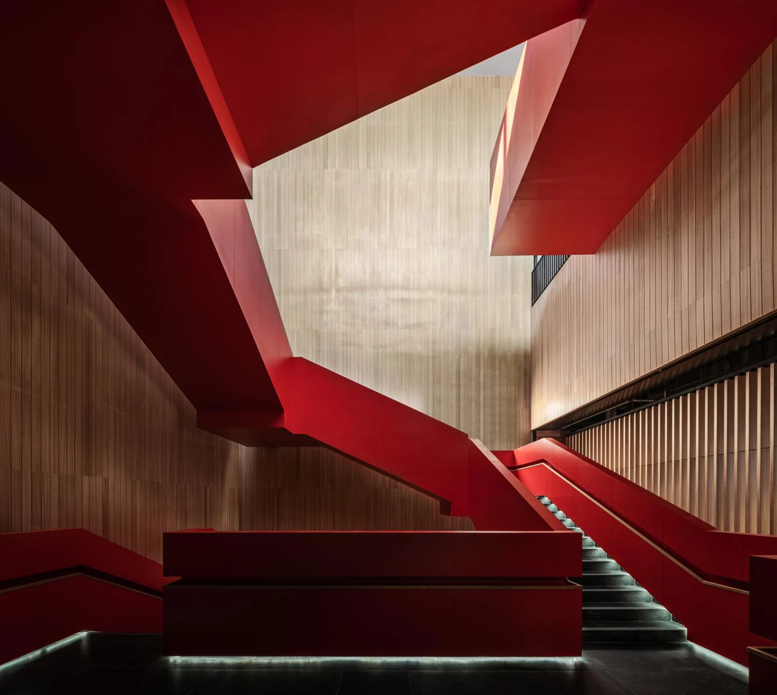 Visitors step into a large, double-height atrium. A sculptural red staircase rises to all the levels, where, besides the library, they find a study room, exhibition and multipurpose spaces where classes and workshops can be held, a cafeteria, a theater seating 324, a conference hall for 123, and a roof garden affording views of the city.