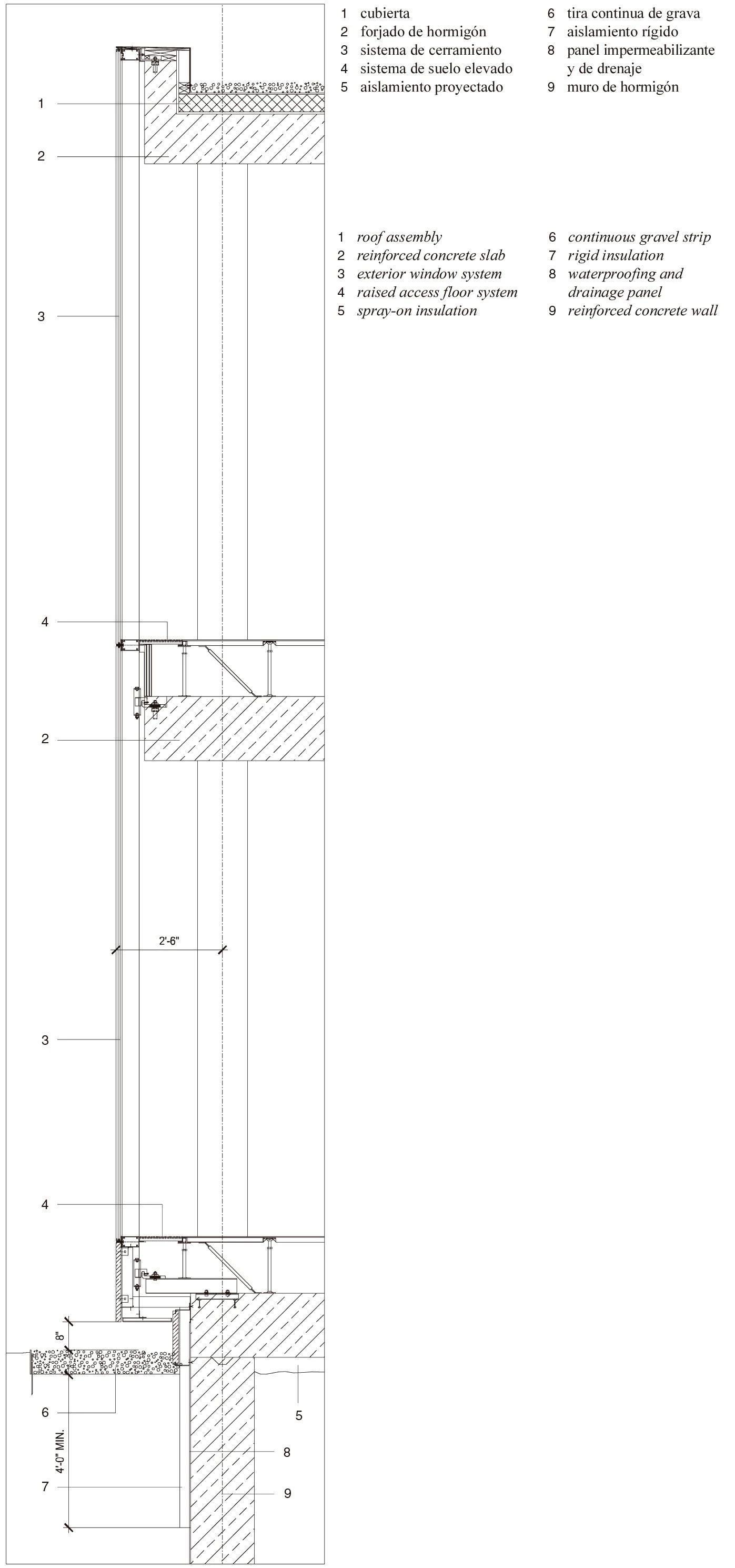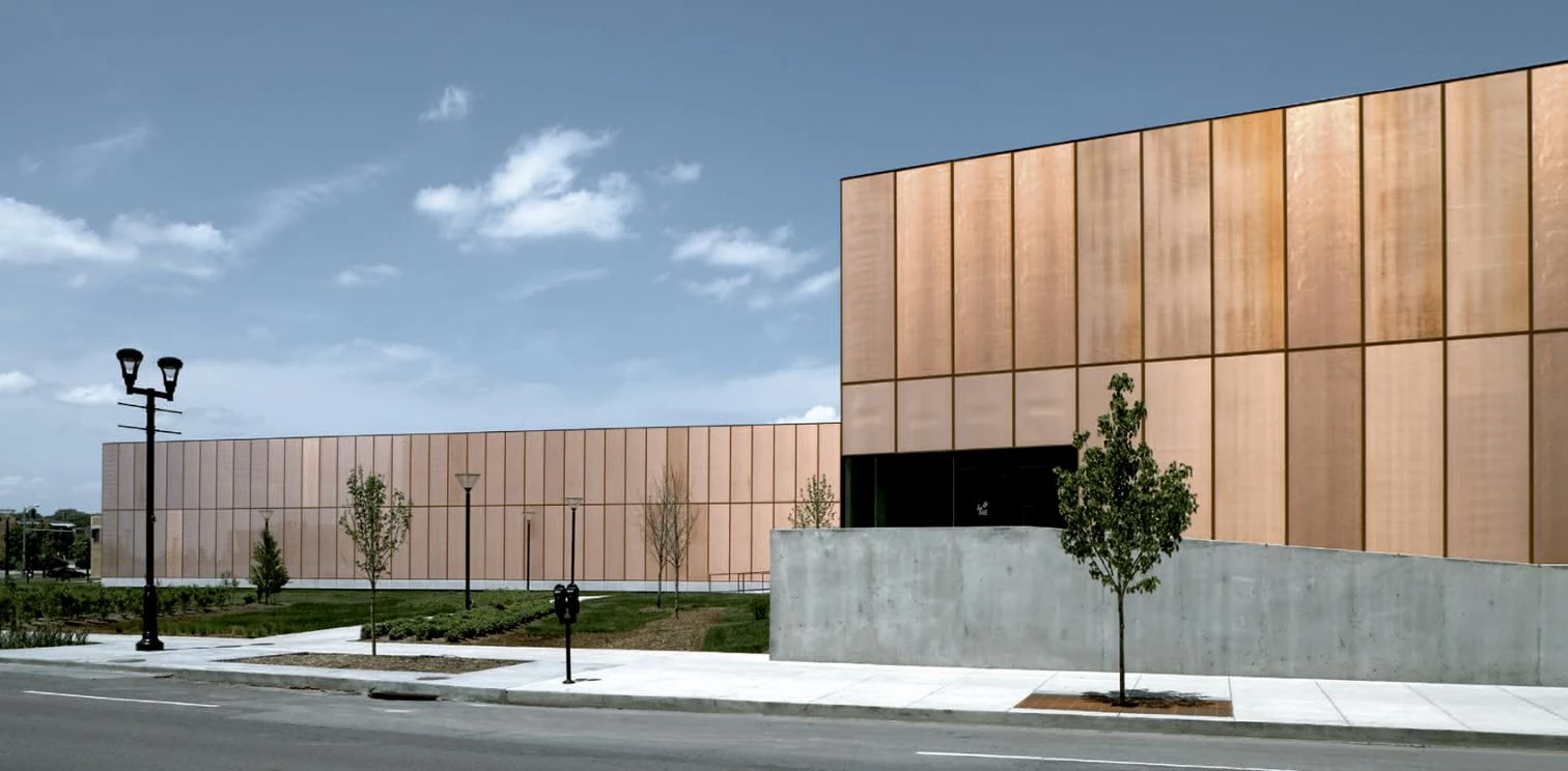 The two storey concrete structure sits above an underground car park and is entirely wrapped in a composite energy efficient glass-metal skin. Laminated between two glass surfaces, a layer of expanded copper mesh reduces glare and solar gain by 85%, thus greatly reducing long-term energy costs. Moreover, the copper gives the skin a changing appearance depending on the time of the day. The panels glow gently in the sunlight, whereas at night, when the library is illuminated, they appear like a slightly transparent veil. From the interior, this metal mesh is almost invisible, thus ensuring that the contact with the park is maintained at all times and taking advantage of the natural light in the reading rooms.
