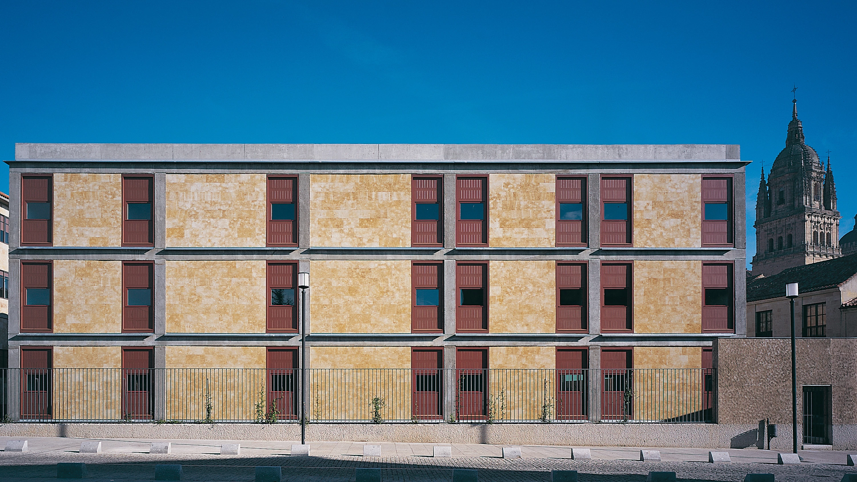 A primera vista podría decirse que su configuración ofrece perspectivas cerradas; una retícula de hormigón armado estructura todas sus fachadas y configura los distintos paños, compuestos de varias capas. La severidad de sus líneas, enfatizada por el color y la textura de la piel de piedra franca de Villamayor, se atenúa con unas carpinterías de madera pintadas con el tradicional almagre salmantino. En el interior, esa condición hermética se vuelve permeable; todas las fachadas, excepto la de la calle Trilingüe, se retiran de las alineaciones conformando dos patios que ocupan los lados longitudinales. Desde el muro que delimita la suave curva de la calle de las Mazas no se adivinan estos espacios exteriores, dominados por la presencia de grandes cristaleras que llevan luz a las plantas bajo rasante; traspasada la entrada y desde el pasaje cubierto que salva el primer foso, se comprende todo el edificio.