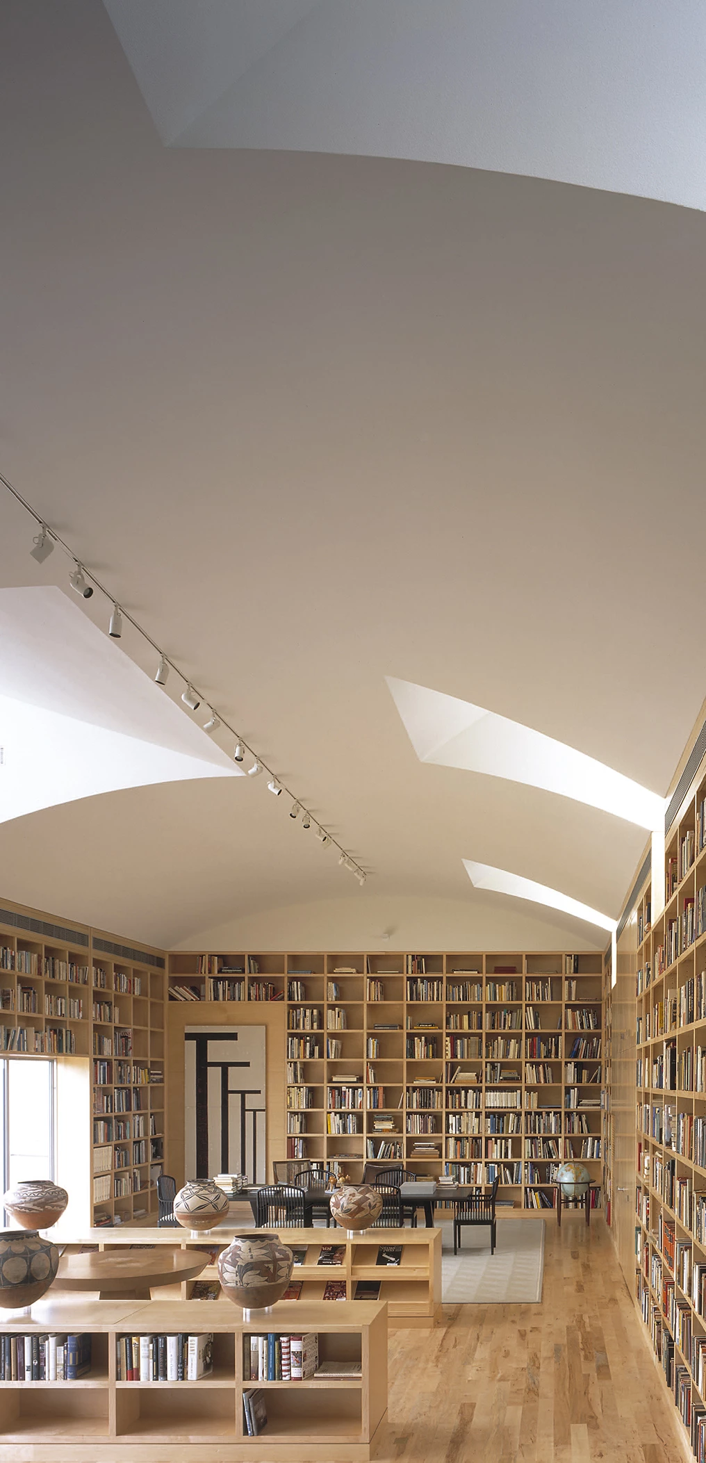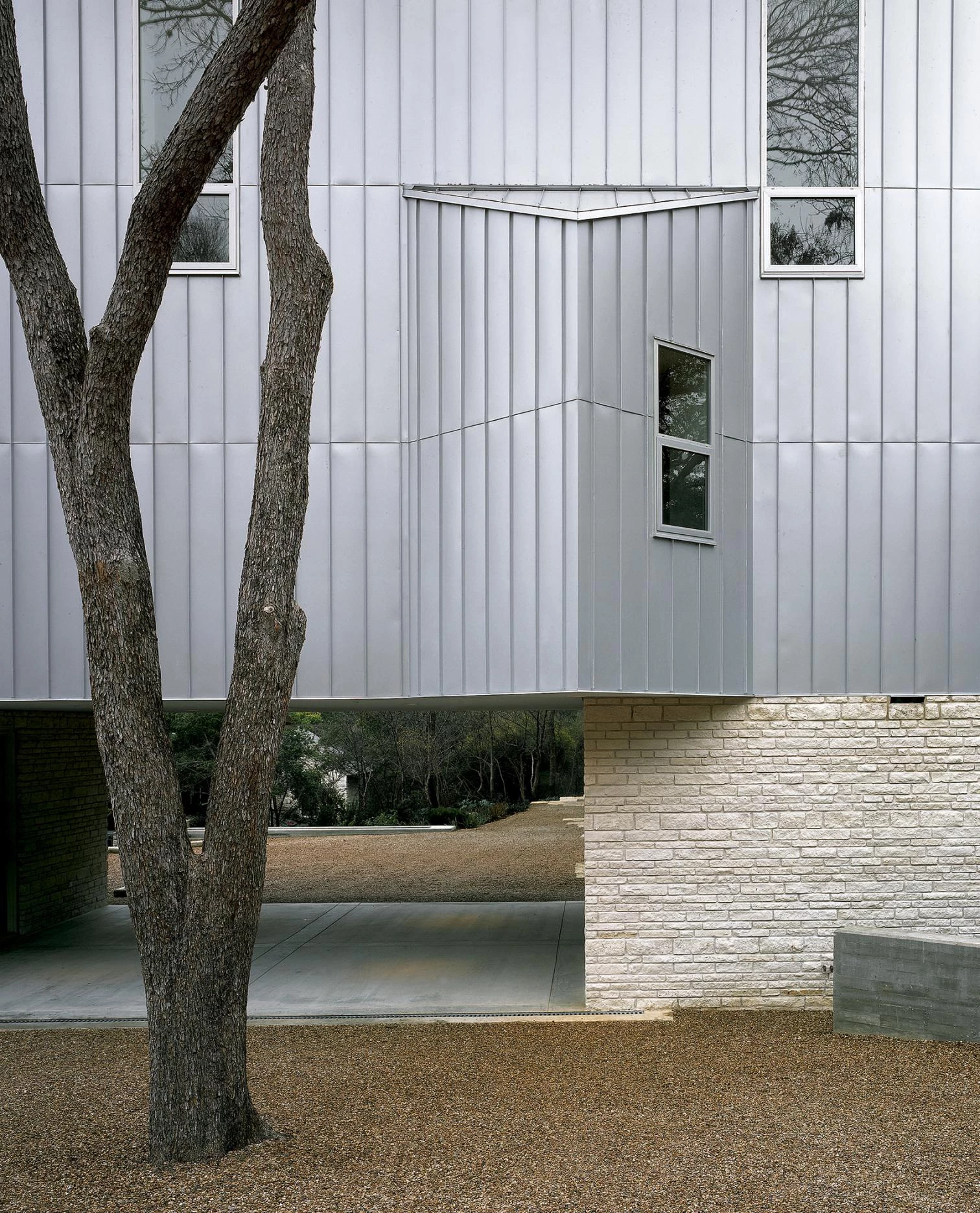 Although an independent structure, the 2,400 square foot library is a pavilion-like infill in its densely wooded property, where several structures go up. It connects the existing main house and guesthouse via ramps, balconies, a staircase and paths. The light, two-storey wood framed building contains on its upper level a single vaulted space wrapped with bookcases on all four sides. The lower level consists of a central drive-through carport flanked by an exercise room and a garden room. A combination of materials, ranging from custom cut limestone, cypress siding, galvanized steel panels, anodized aluminum panels, stucco, ipe wood decking, to maple cabinetry and flooring, were chosen to maintain a familial relationship with the existing house’s materiality without emulating their original rusticated detailing.