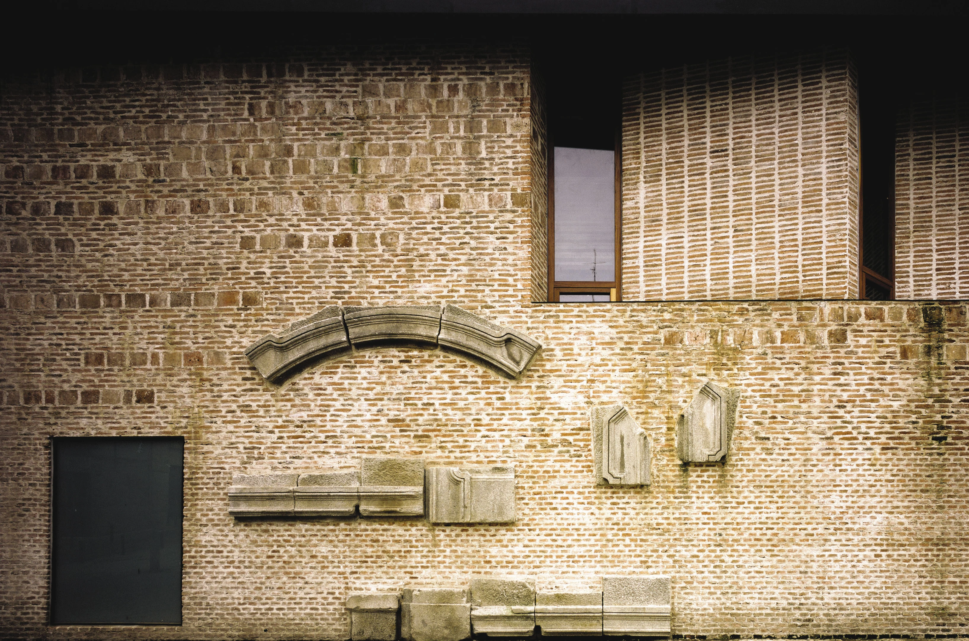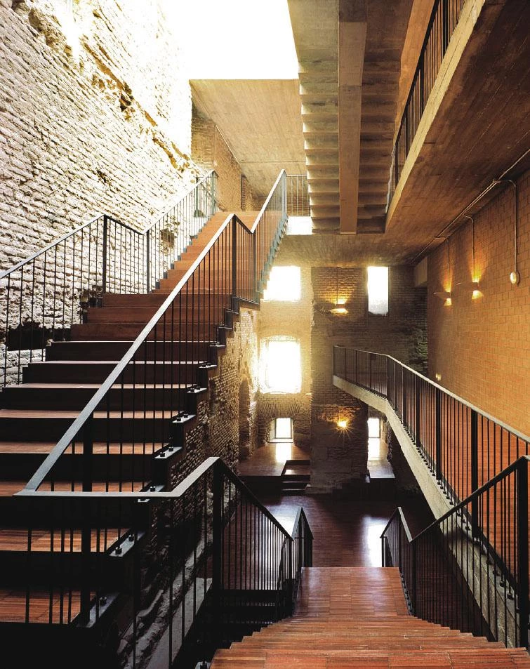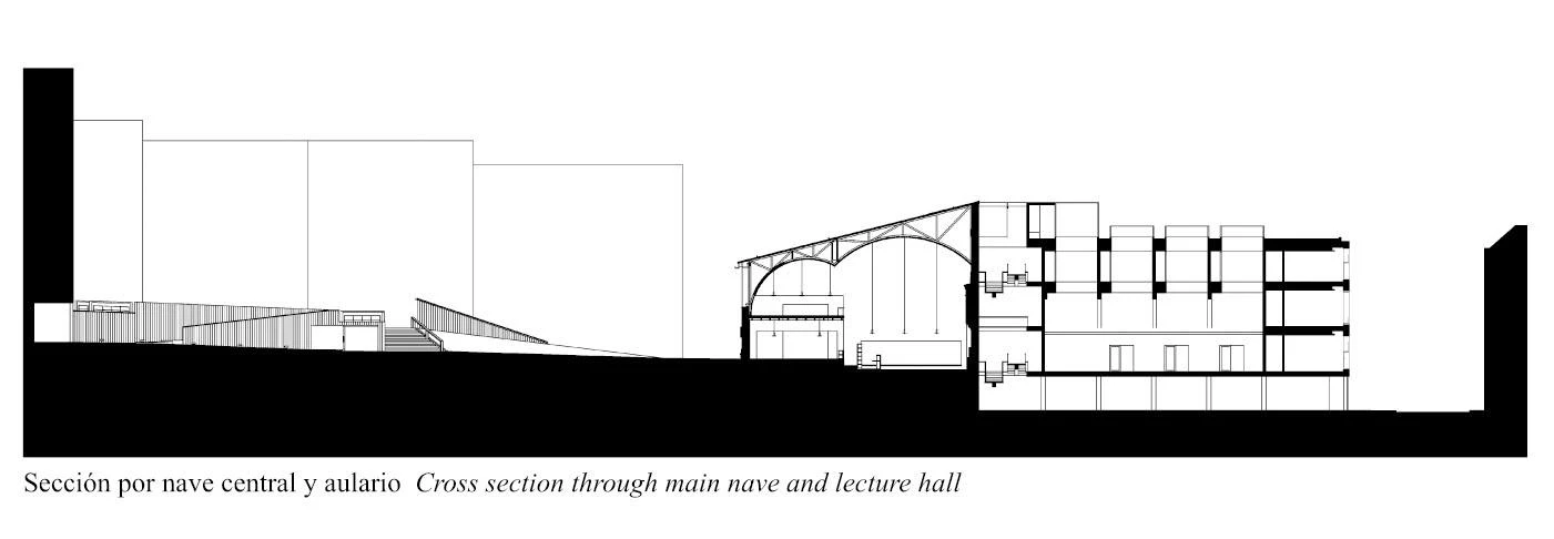 The lecture hall, in the adjacent plot, is accessed from Tribulete street, yet it is connected to the library by an exterior lobby built in what used to be the entrance to the church. Two staircases, one next to the access and another one attached to the side wall of the temple, link the different classroom levels. These are laid out around a central space – taken up in the intermediate floors by the main hall – and connected by a perimetral corridor. Eight skylights cross the volume in the shape of glazed courtyards ensuring the illumination of the main hall, while a grid of voids, opened on the brick tile wall, lets light into the classrooms.
