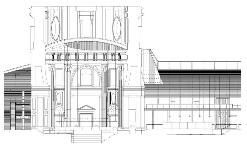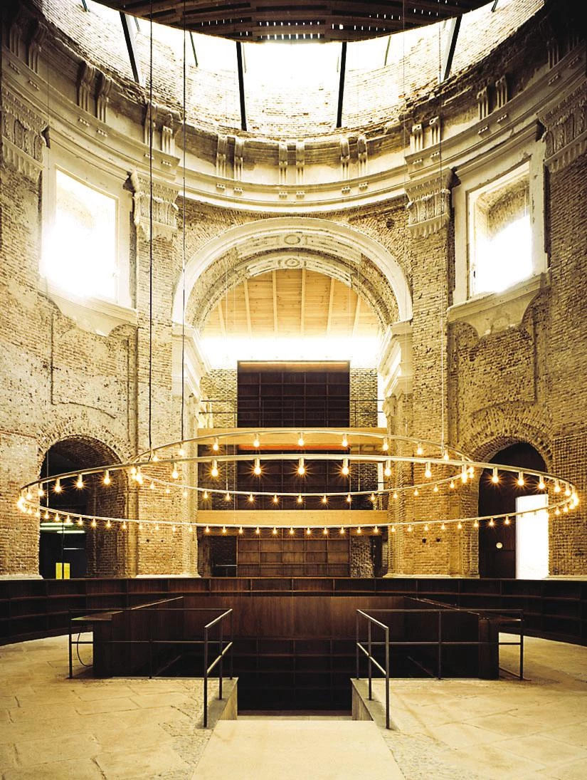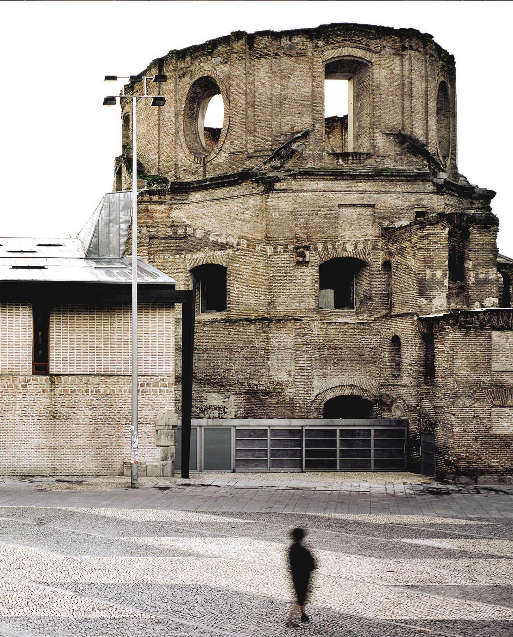 The tambour of the church is covered at a lower level, so that on the outside the character of the ruins still remains. New entrances of light, direct or filtered through wooden frameworks, accentuate the old walls.